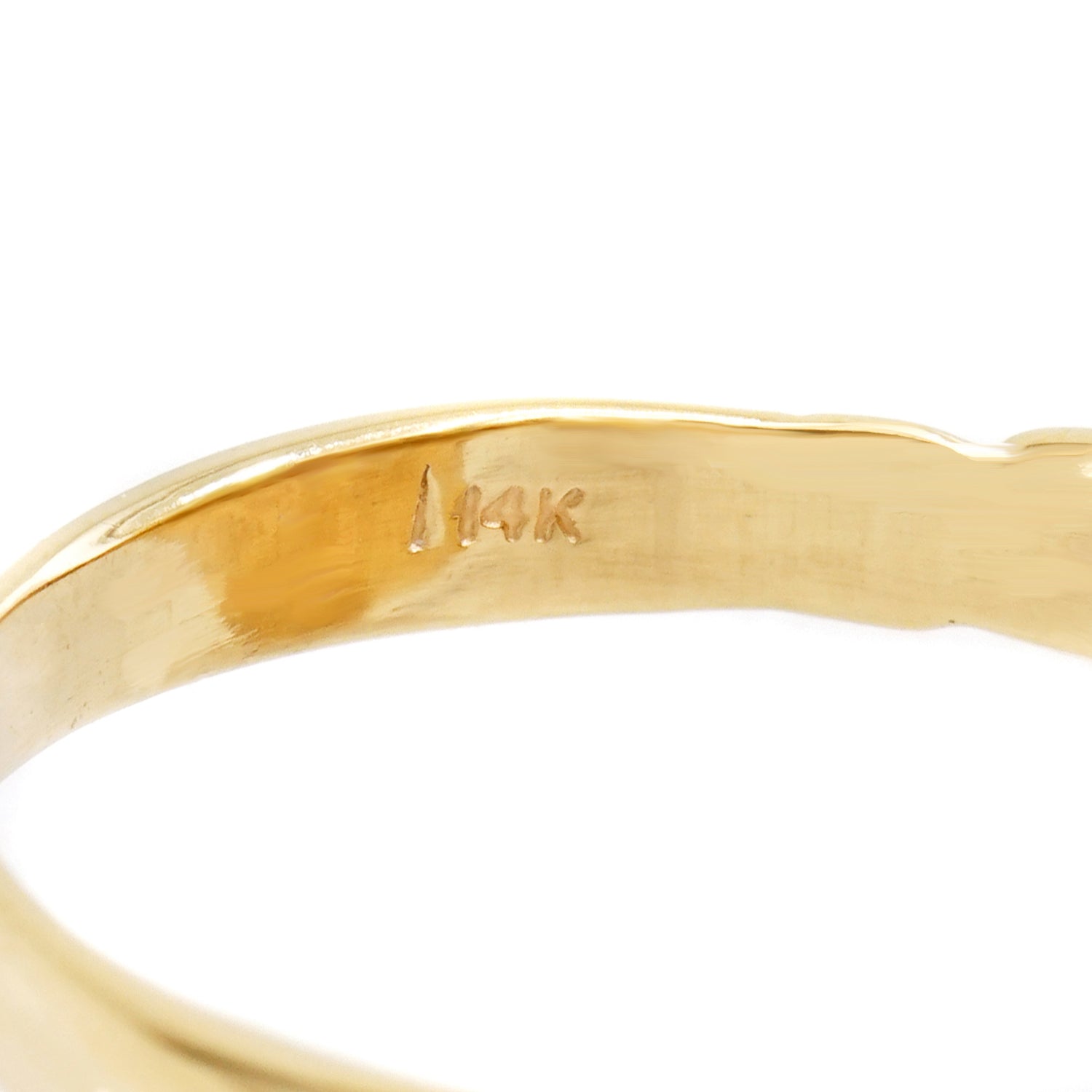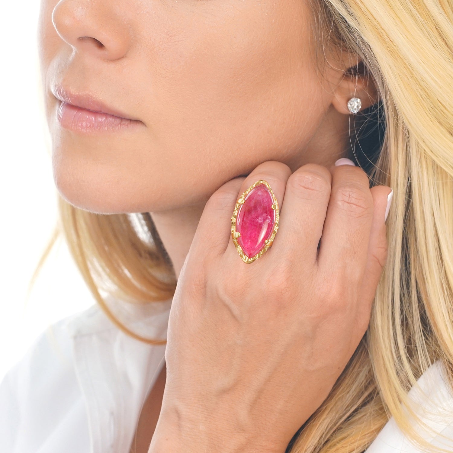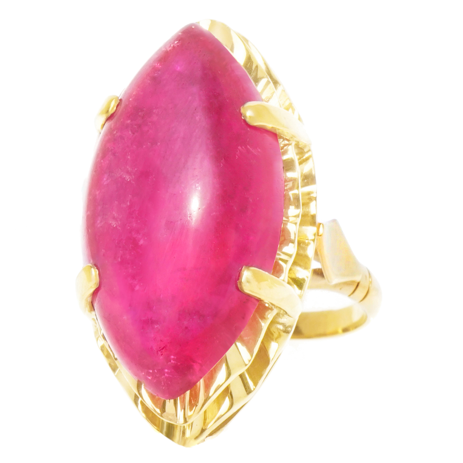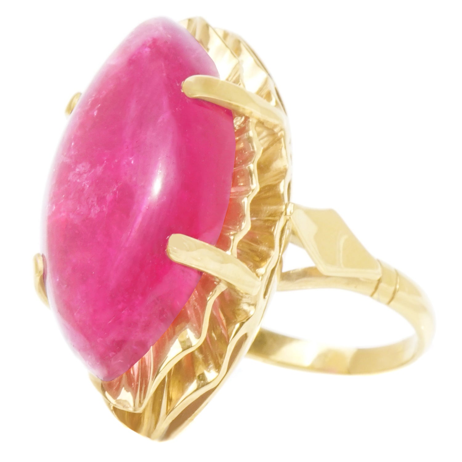 Circa 1950s, 14k, American. Big color, big look …the gorgeously hued pink-red tourmaline sets the stage, and the gold work featuring three layers of ruffles completes the visual narrative. The style is over-the-top American glamour. Finely fashioned, it is in excellent condition.
