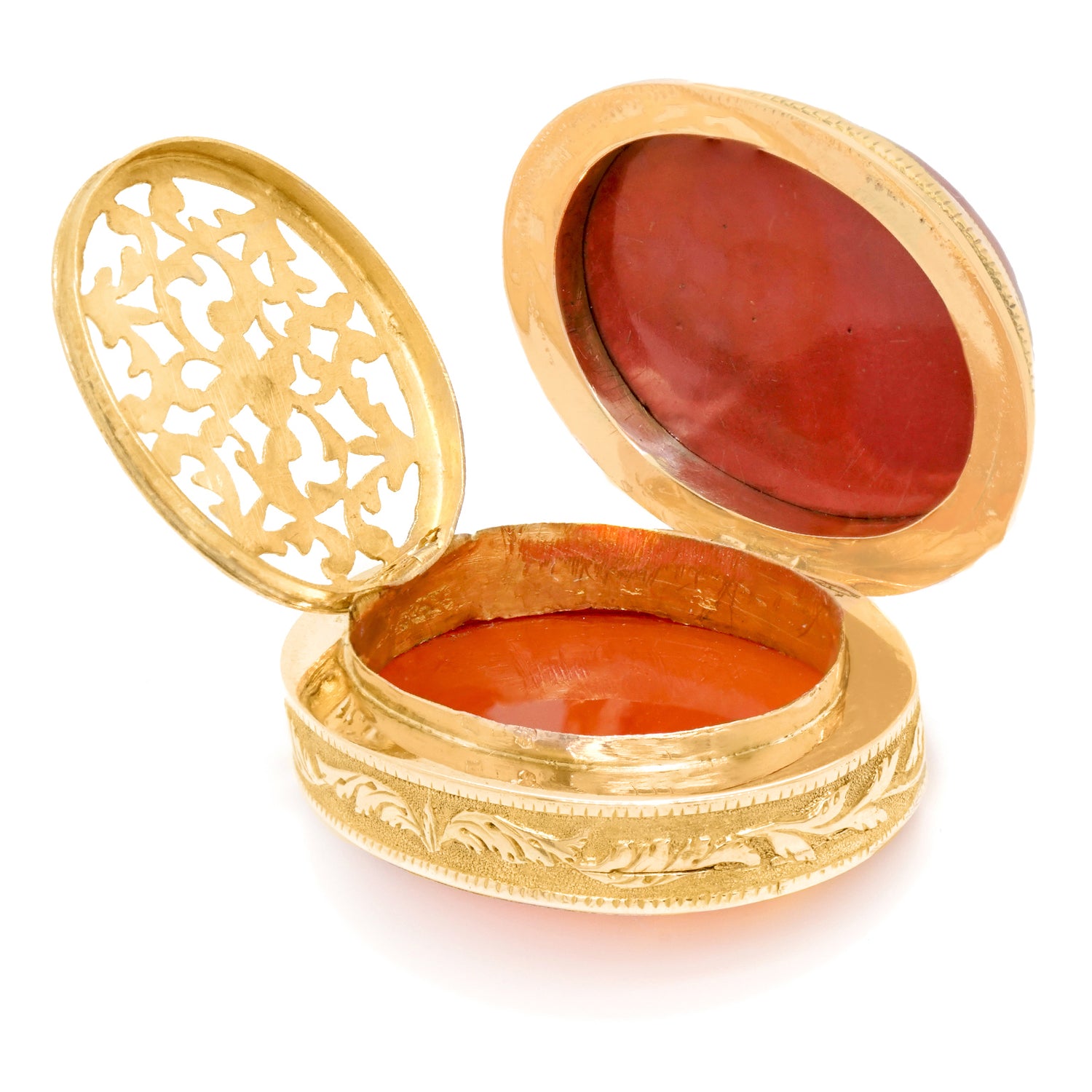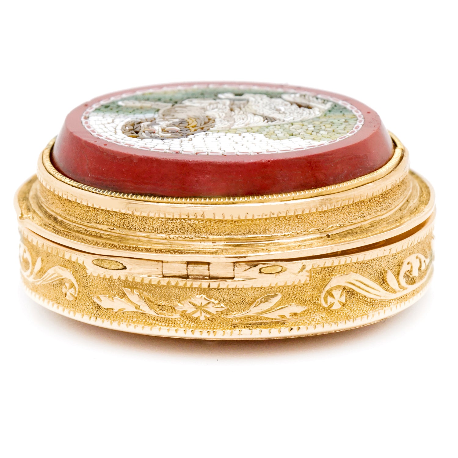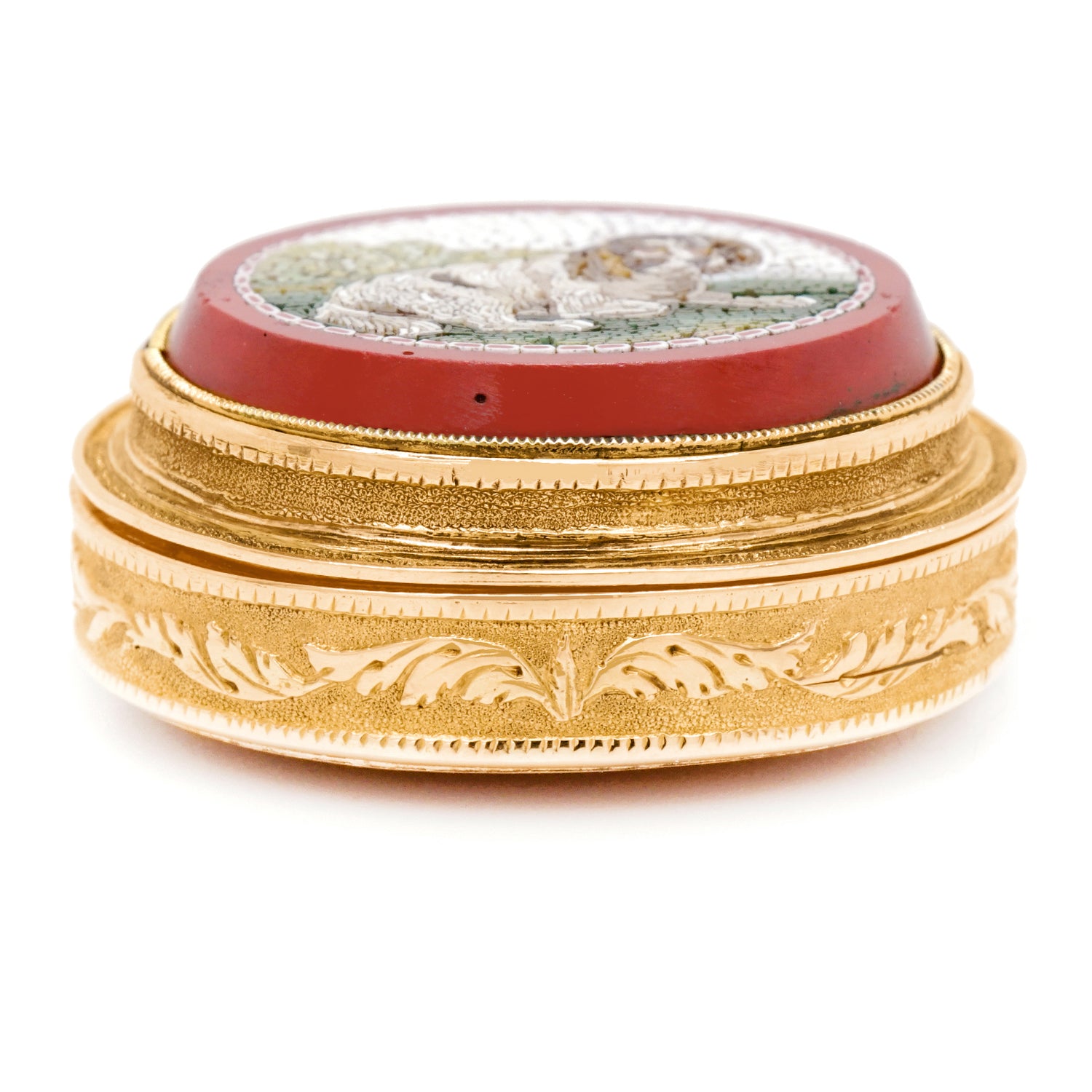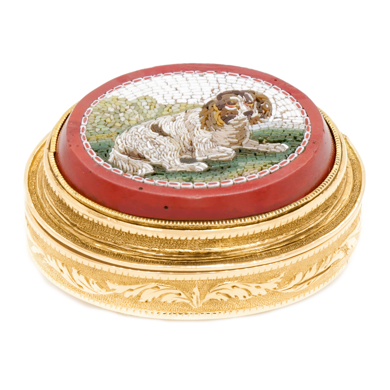 Circa 1810-1830s, 18k, France. This early French Gold vinaigrette features a superb micro mosaic depicting a recumbent spaniel. The hand-cut and engraved grill and entailed engraved decoration complete the picture. Excellent condition.