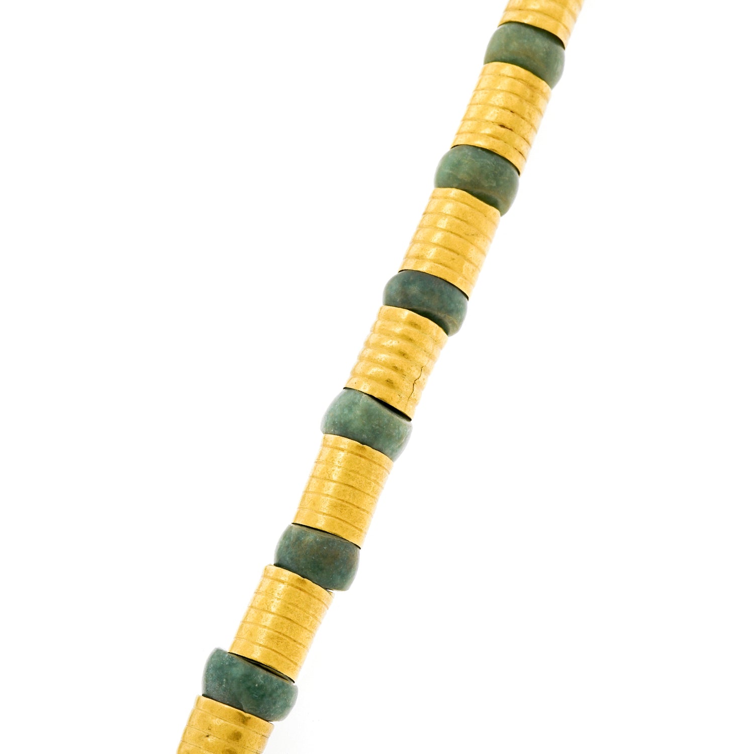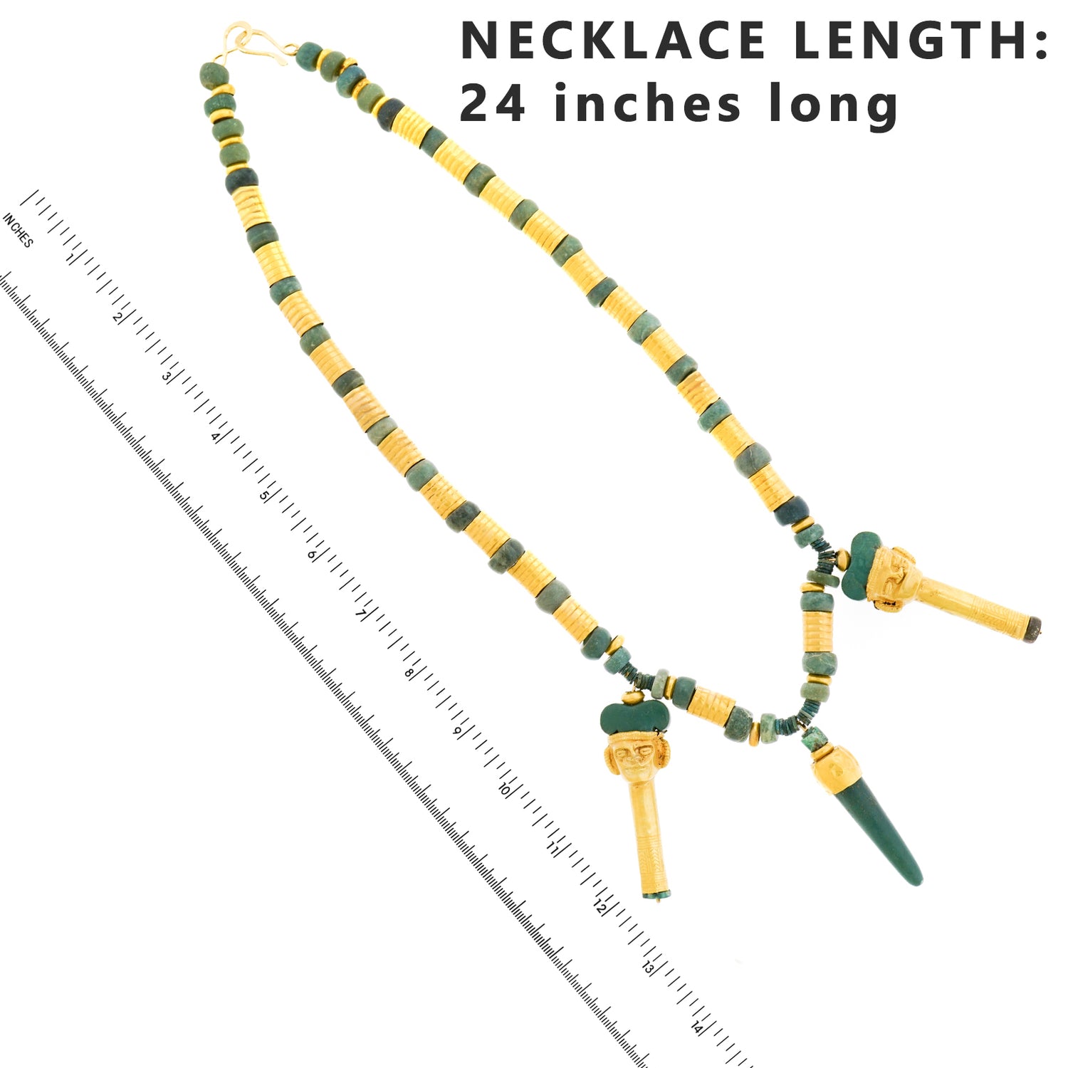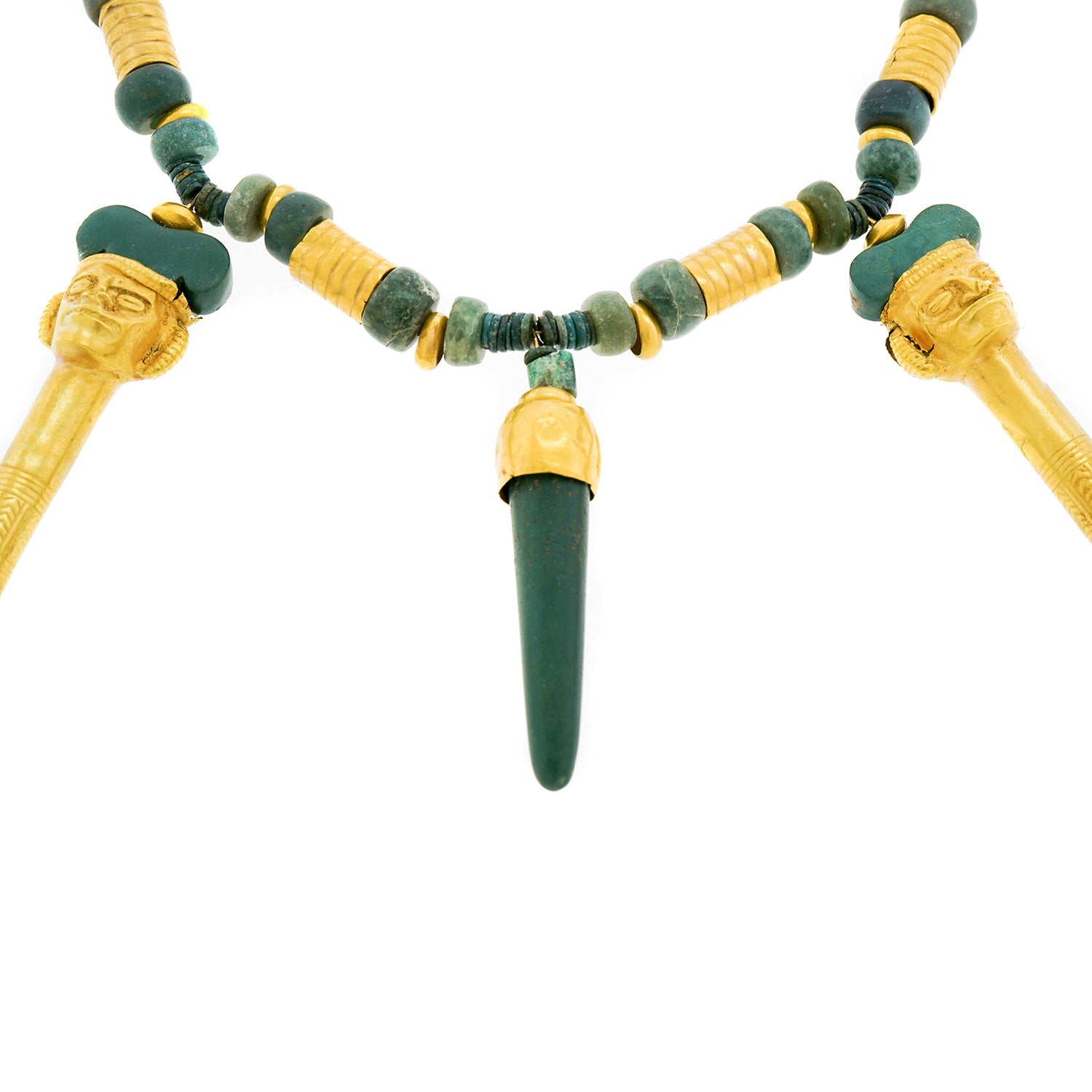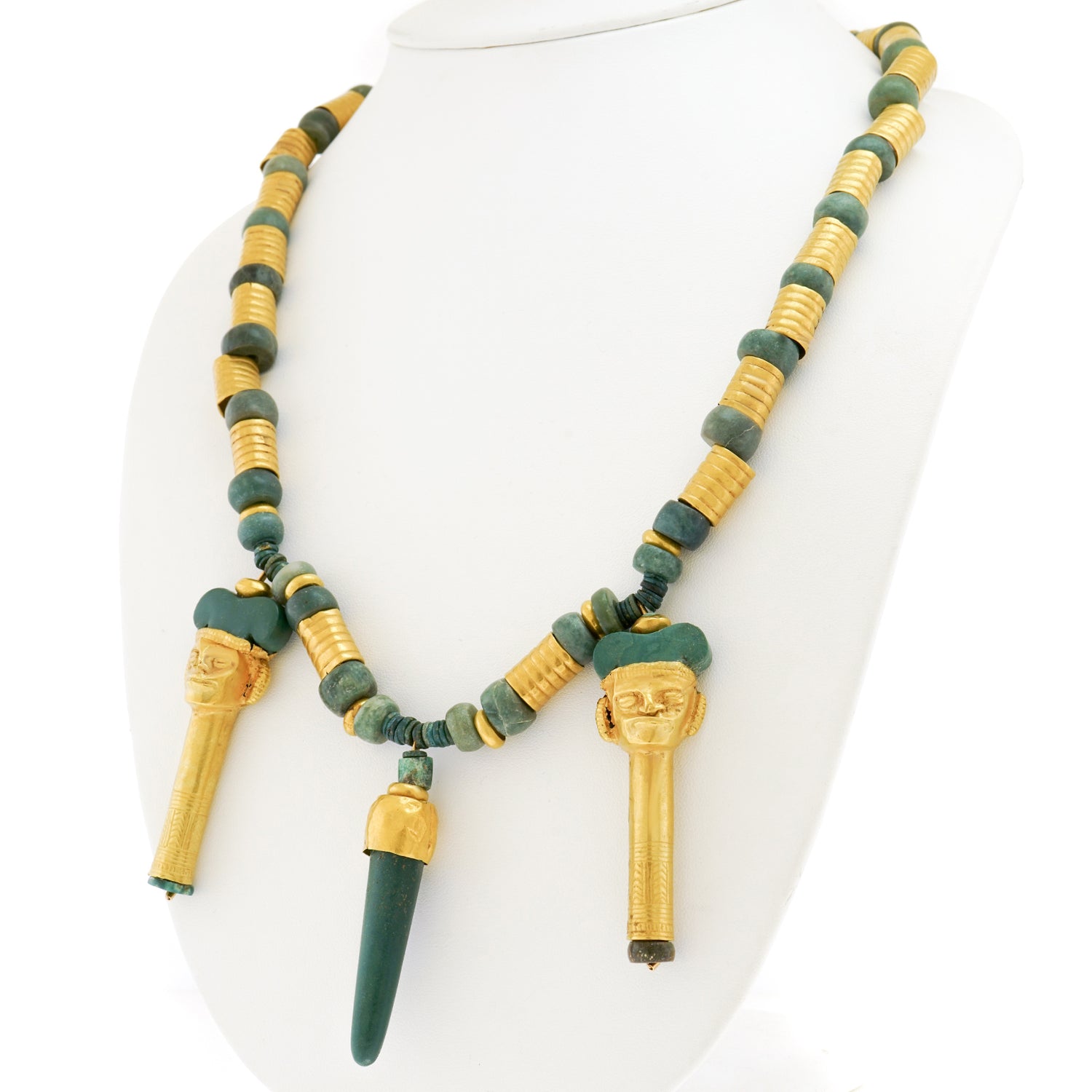 Pre-Columbian, Southern Mexico to Guatemala, Mayan, Late Classic Period, circa 550 to 900 CE. This stunning gold and jade necklace is attributed to the Mayan people. The gold is high karat and the components are all original. Wearing ancient jewelry is a spiritual and aesthetic experience beyond compare. The look is fashion across the ages …simply incomparable. Very good condition.