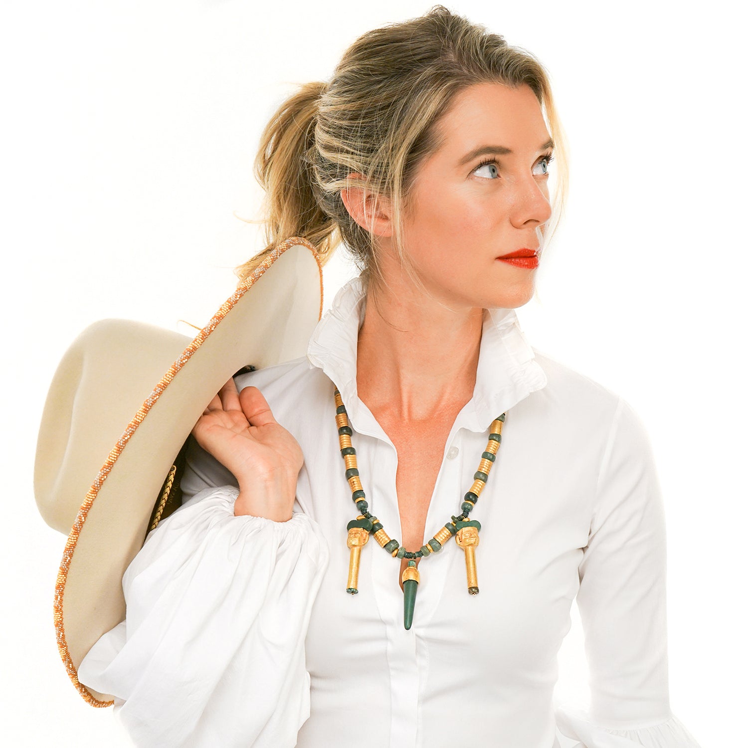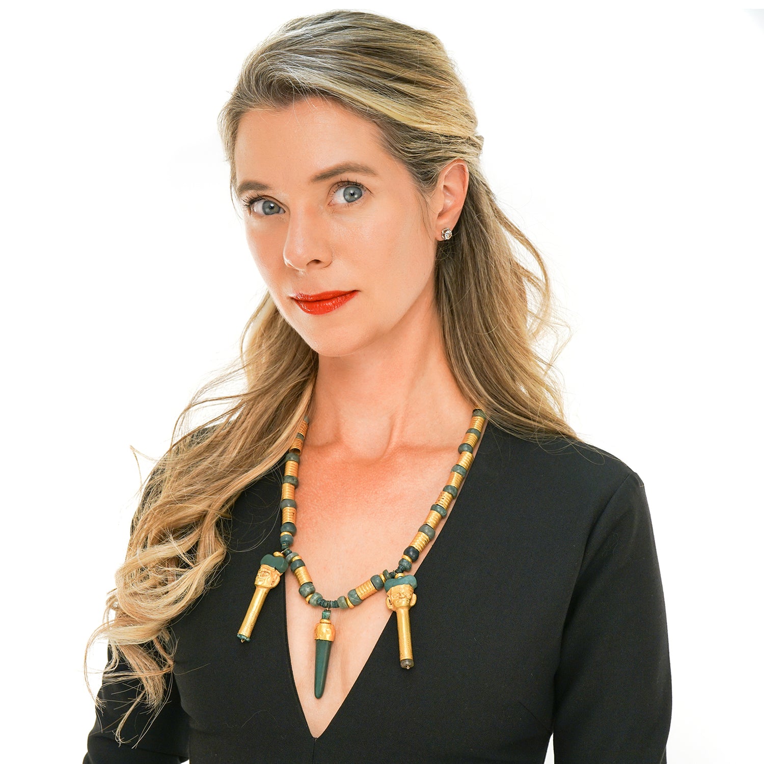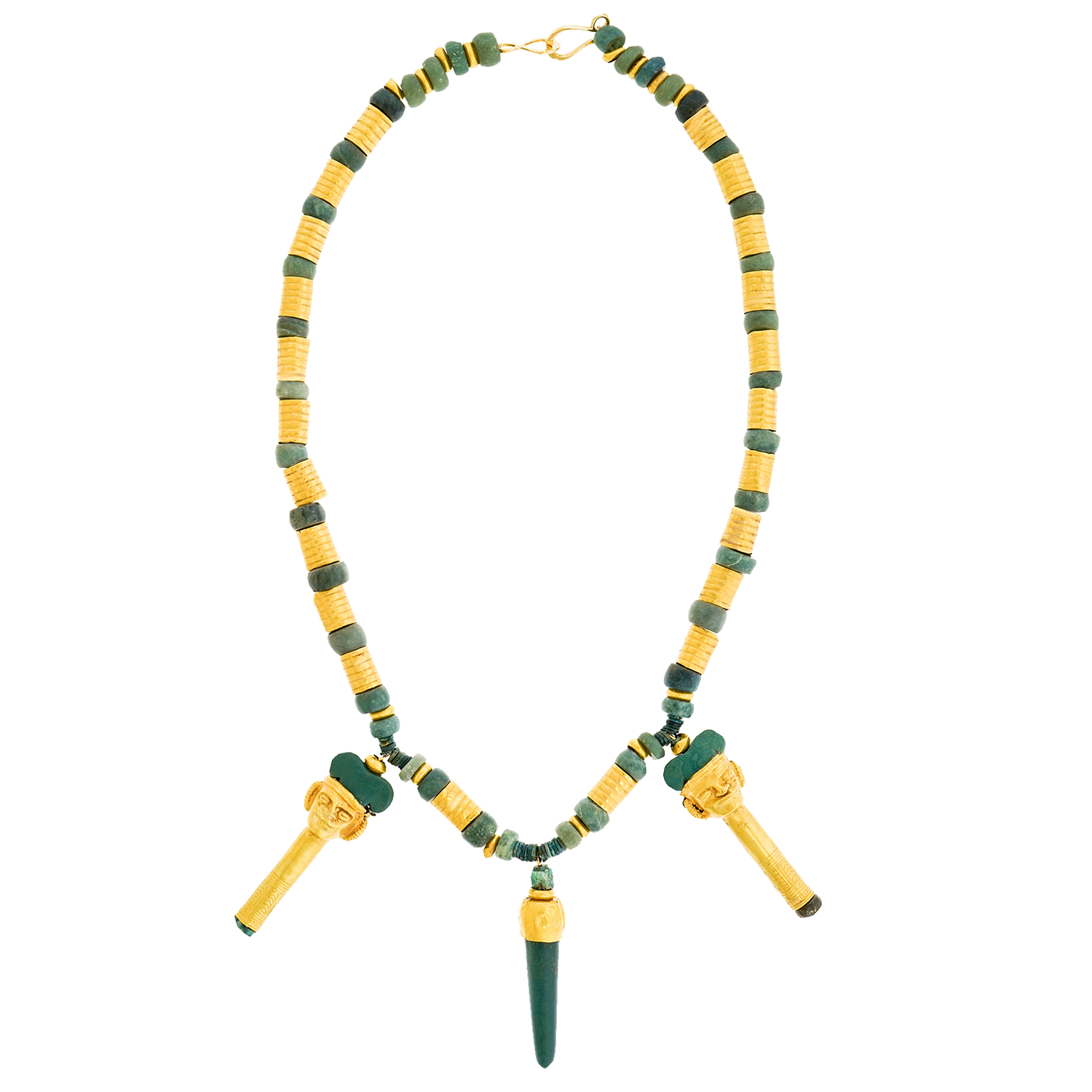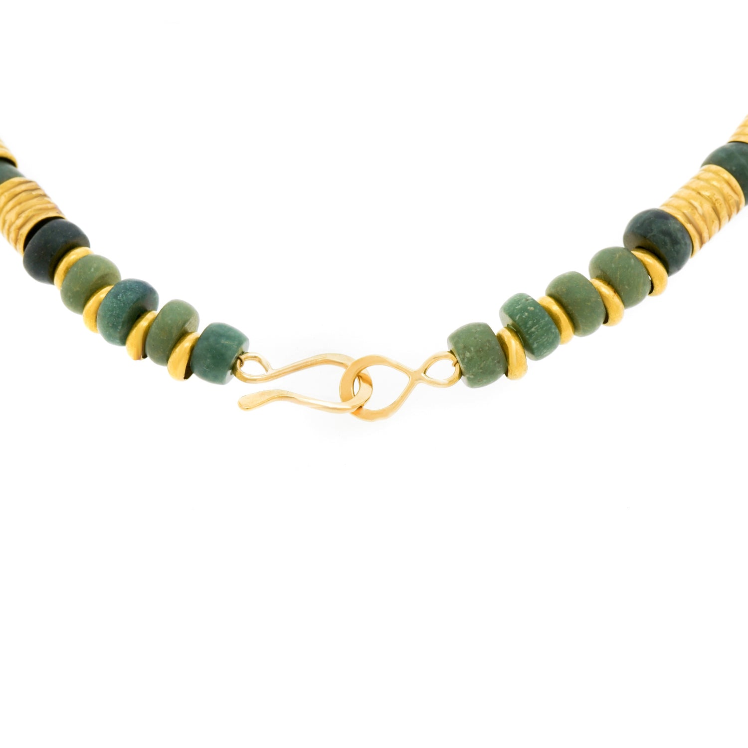 Pre-Columbian, Southern Mexico to Guatemala, Mayan, Late Classic Period, circa 550 to 900 CE. This stunning gold and jade necklace is attributed to the Mayan people. The gold is high karat and the components are all original. Wearing ancient jewelry is a spiritual and aesthetic experience beyond compare. The look is fashion across the ages …simply incomparable. Very good condition.