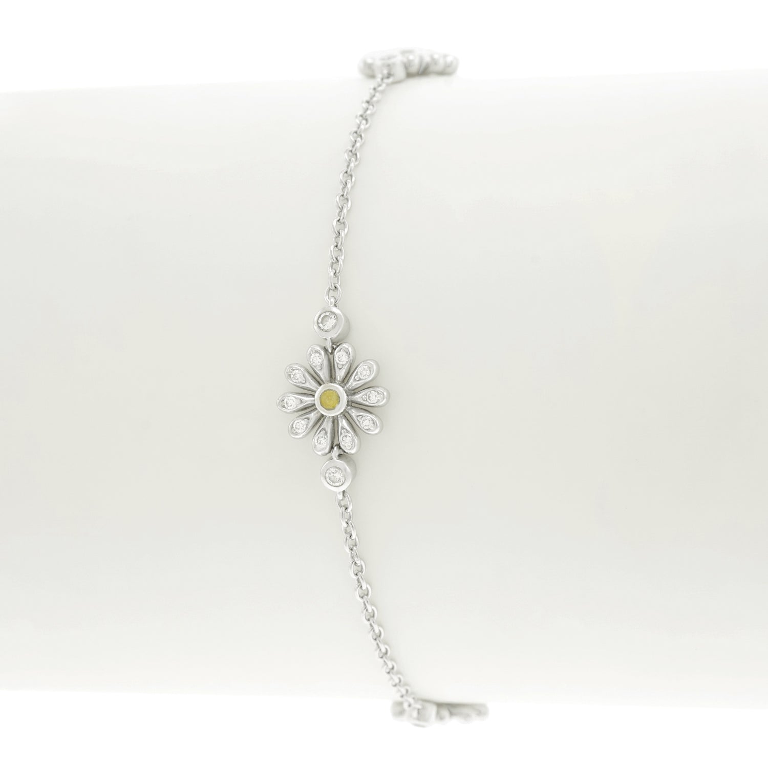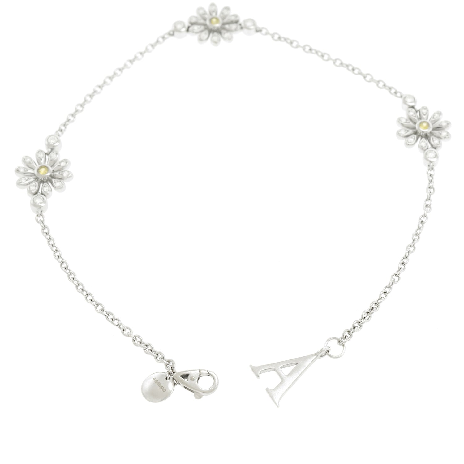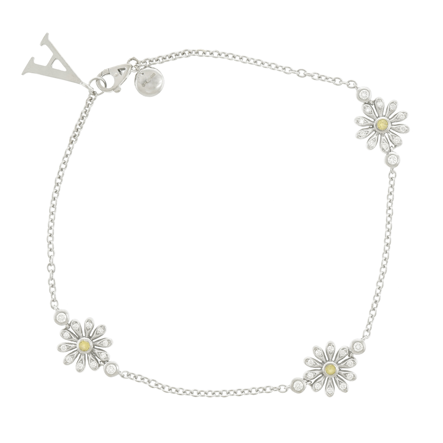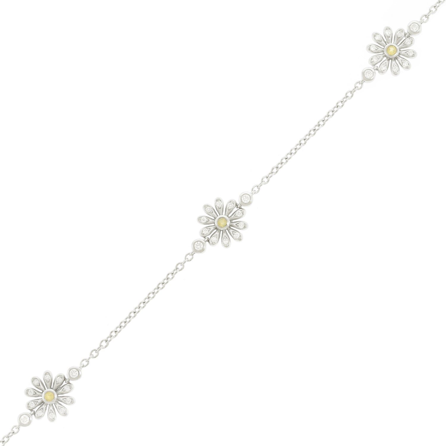 Circa 2017, 18k, by Asprey, London, England. Asprey describes this gorgeous bracelet as being set with "the quintessential English Daisy." Petals illuminated by diamonds and with yellow sapphire centers, the daisies are visually delicate, perfect in any moment of fashion. Finely fabricated in 18k white gold, the look has that unique London style. Perfect alone or worn with other bracelets, see it with two similar ones by Asprey in the second model shot. Excellent condition.