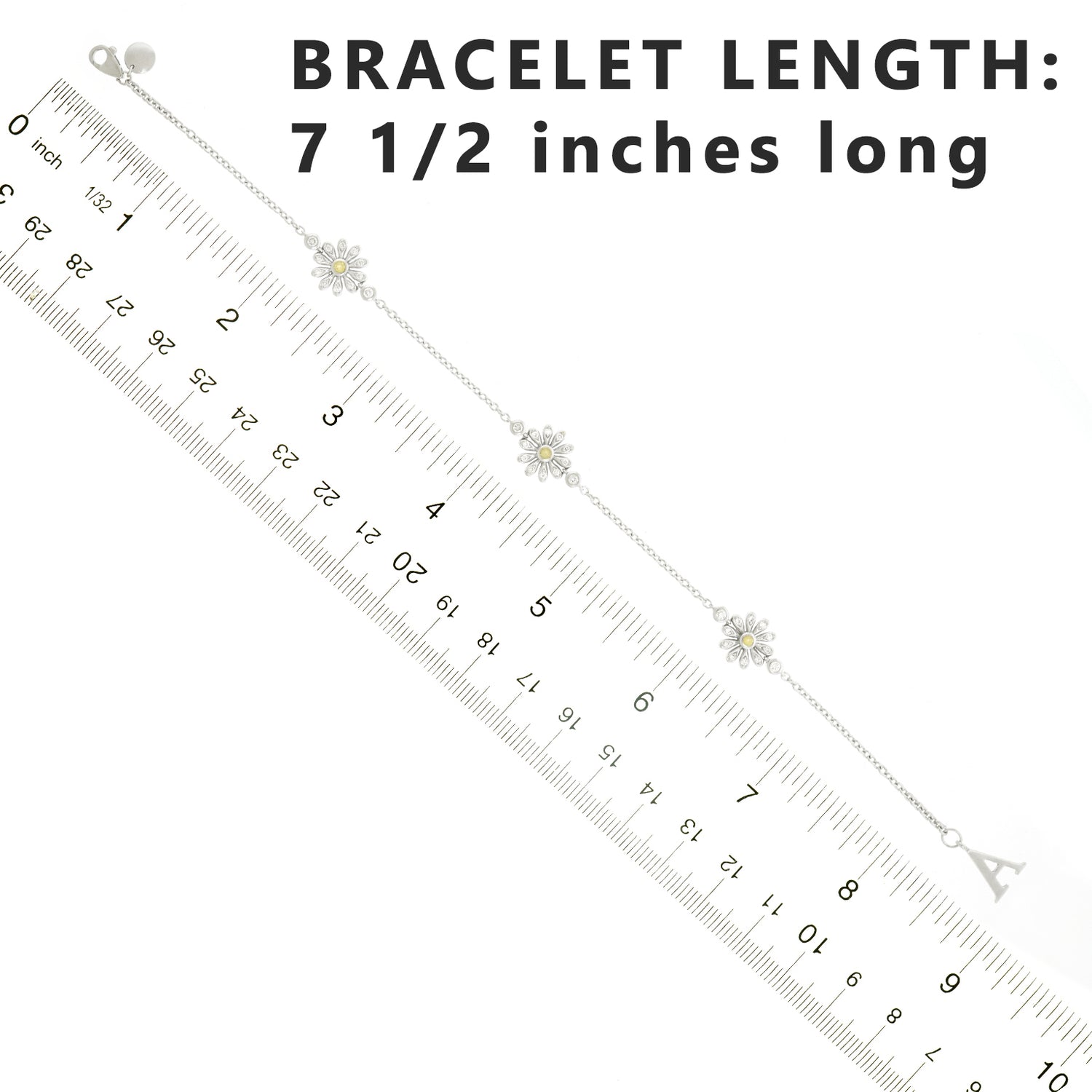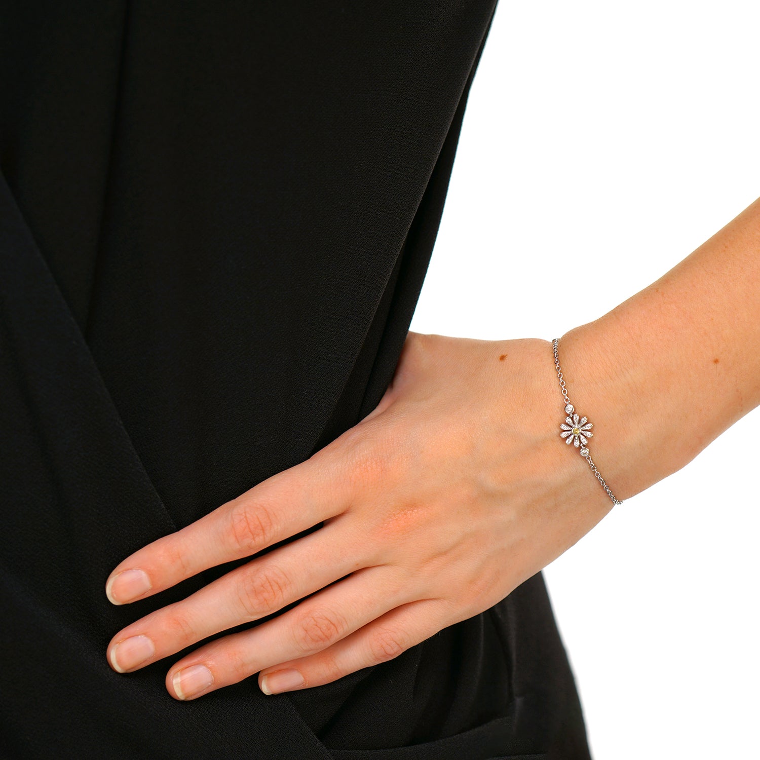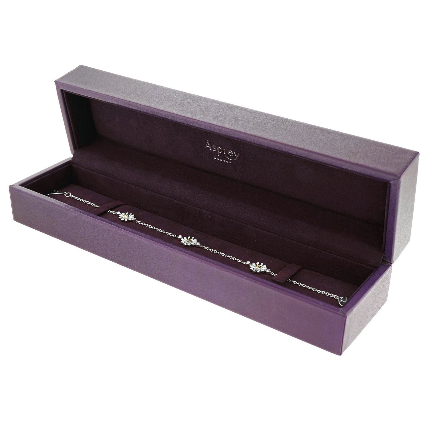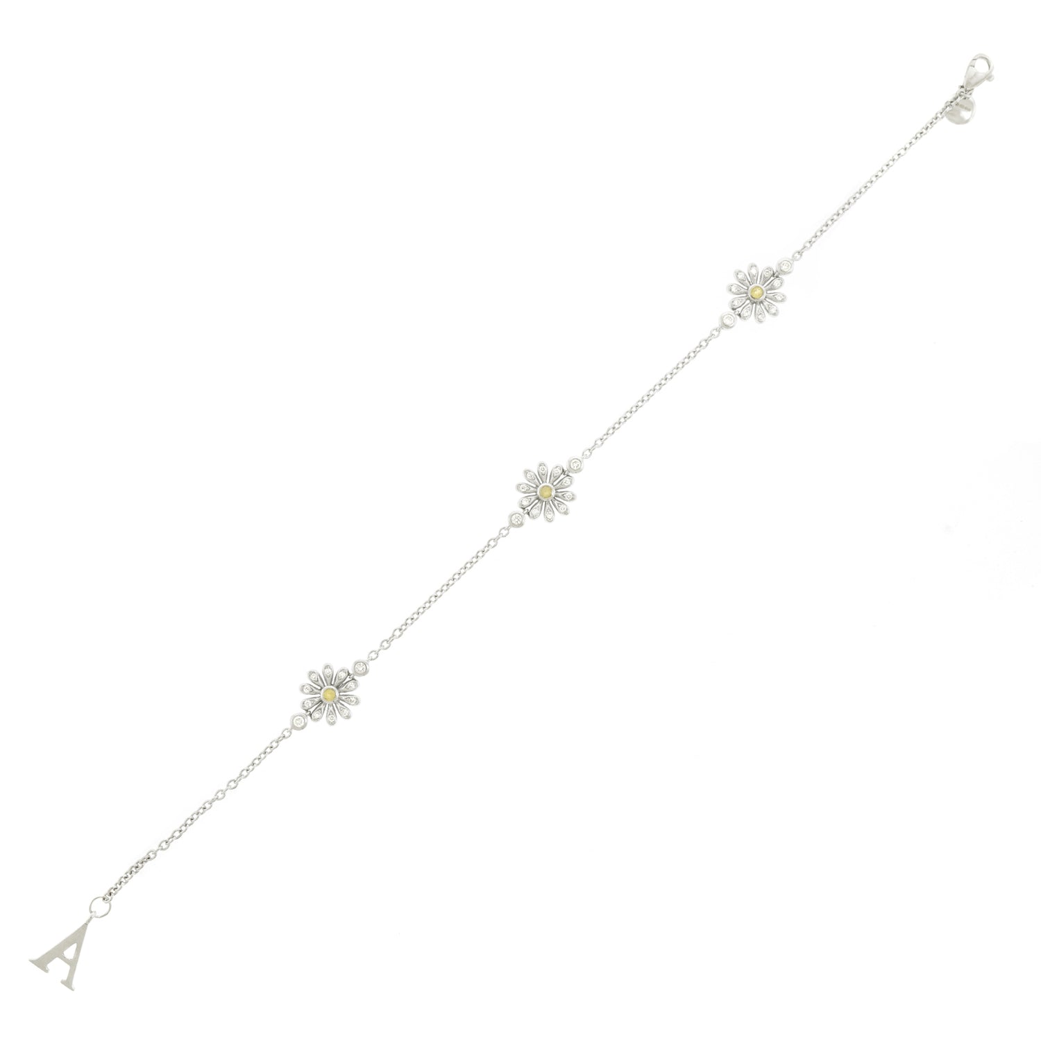 Circa 2017, 18k, by Asprey, London, England. Asprey describes this gorgeous bracelet as being set with "the quintessential English Daisy." Petals illuminated by diamonds and with yellow sapphire centers, the daisies are visually delicate, perfect in any moment of fashion. Finely fabricated in 18k white gold, the look has that unique London style. Perfect alone or worn with other bracelets, see it with two similar ones by Asprey in the second model shot. Excellent condition.