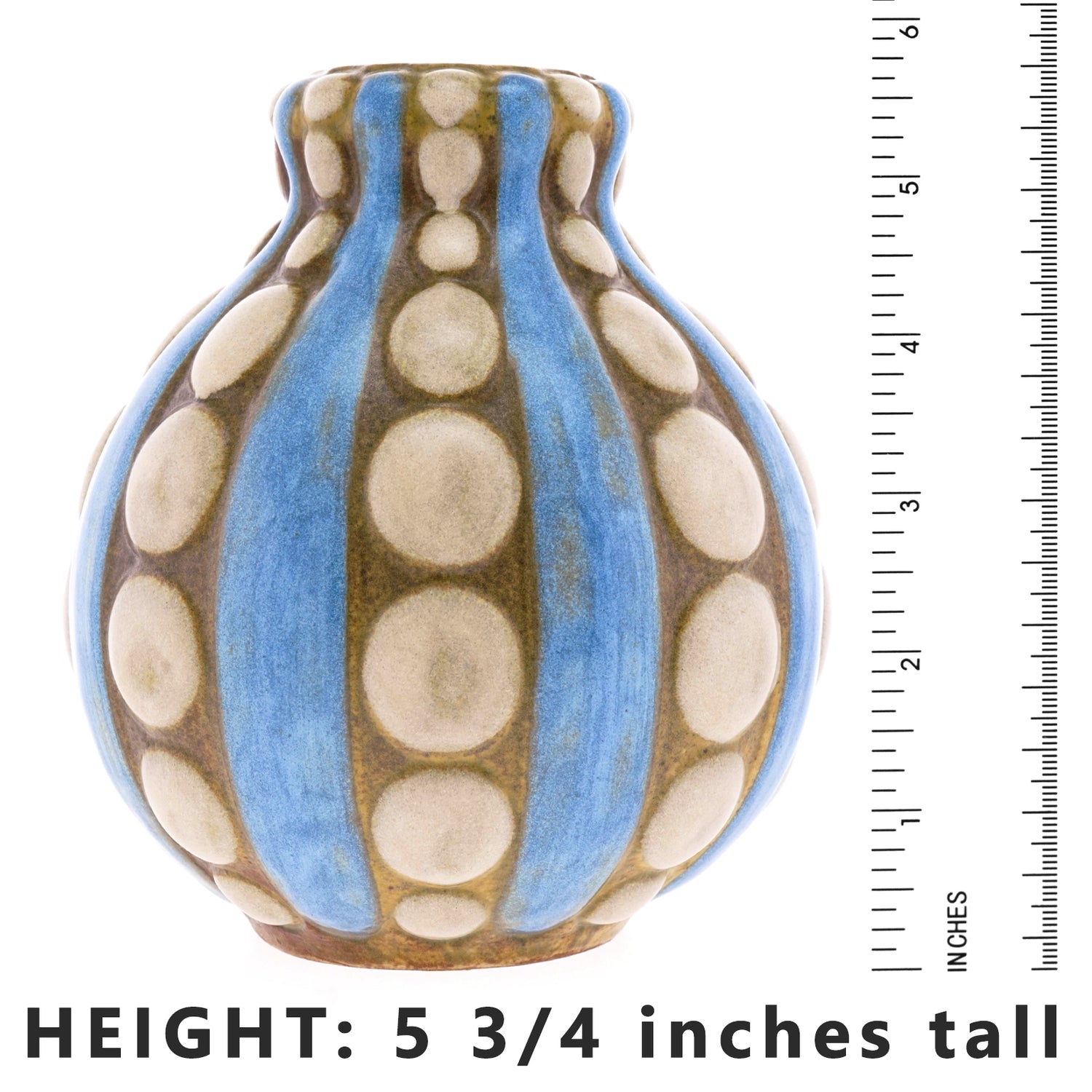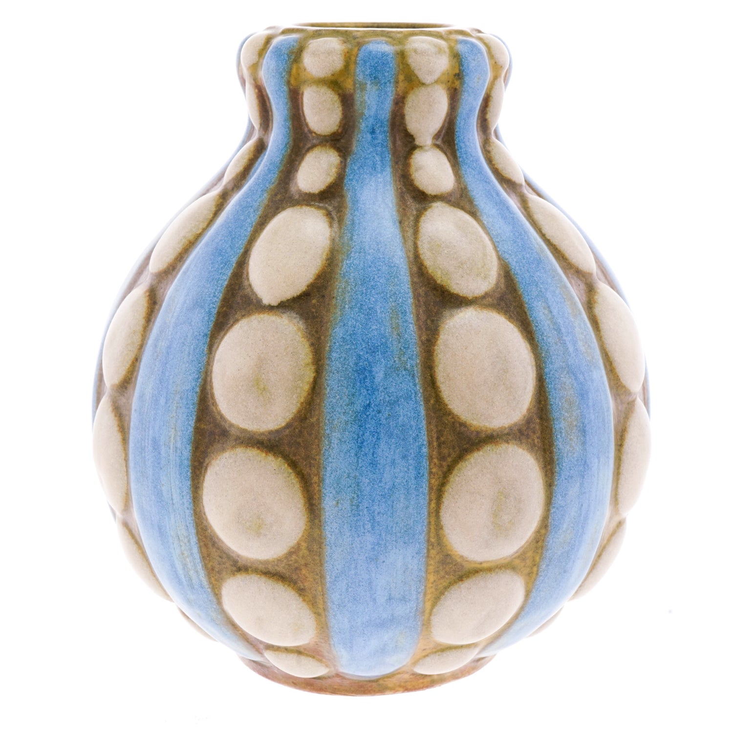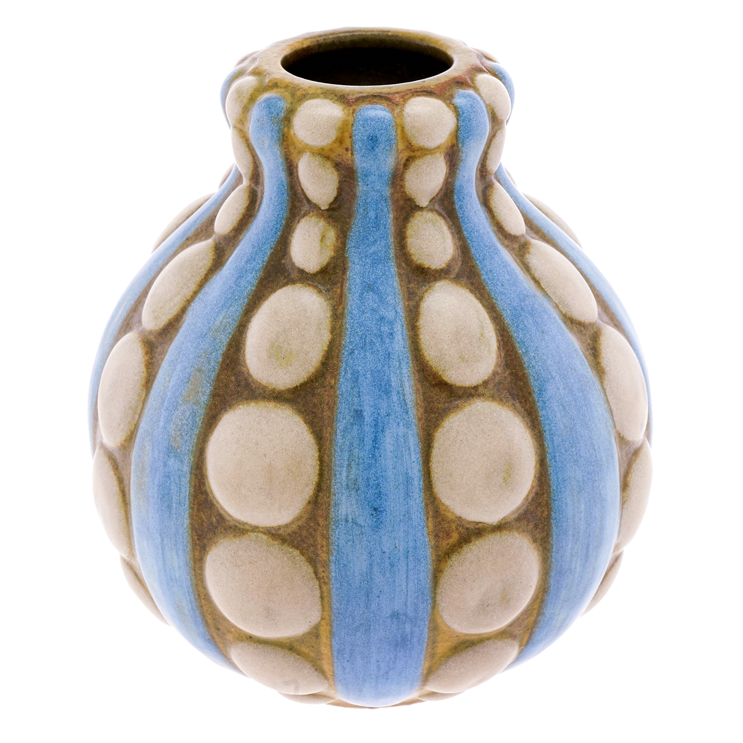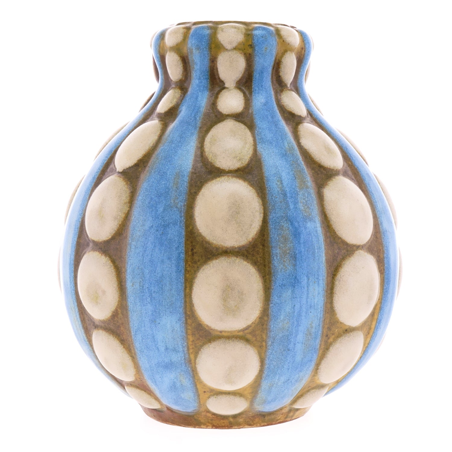 Circa 1920-30 by Louis Lourioux, France. A visionary figure in the 1920s Parisian Decorative Arts scene, Louis Lourioux was known for his bold stylish designs and fast lifestyle. This stunning example of Modernist aesthetics in the Art Deco period features dimensional dots and stripes on a gourd-form pottery vase. The colors are subtle hues and the balance of the composition is thoughtful. Beautifully made, it is in excellent condition.