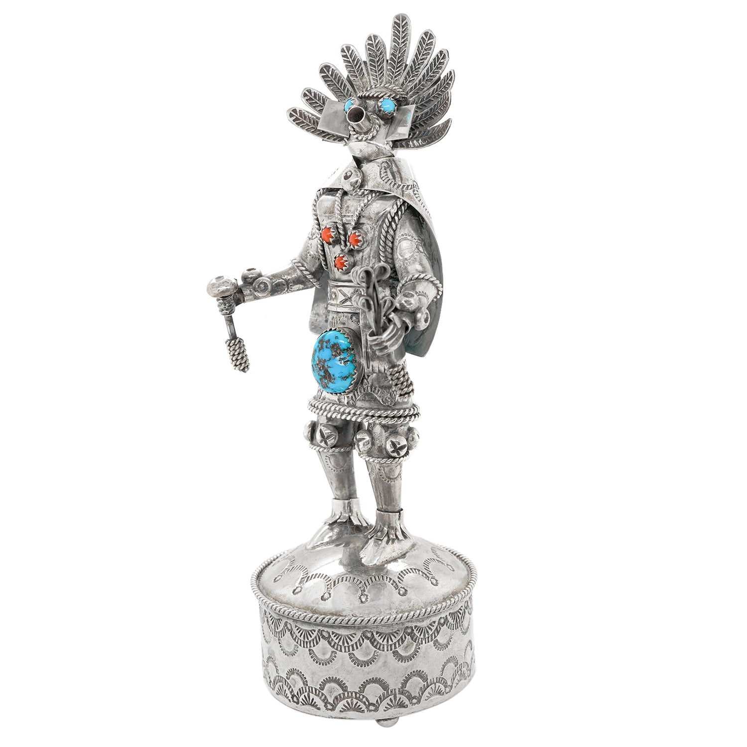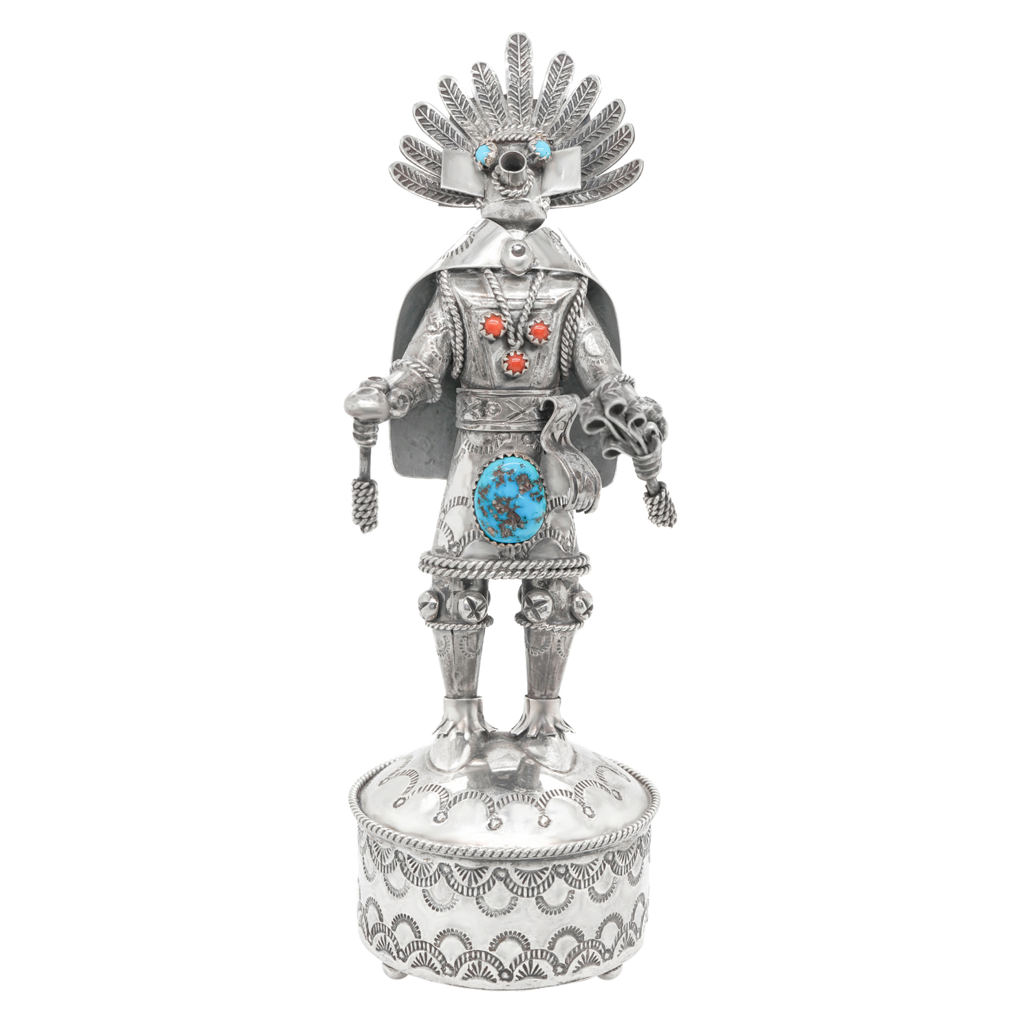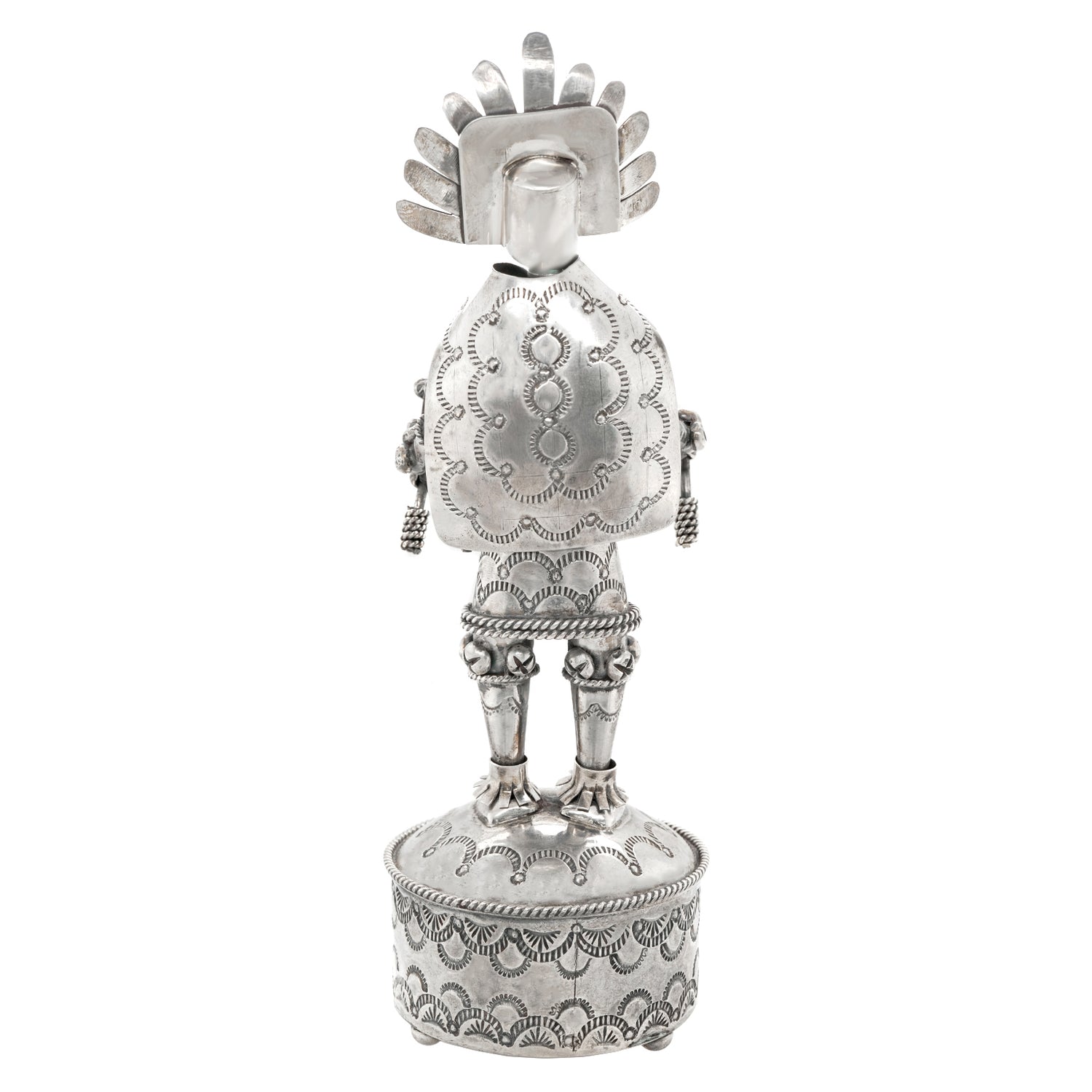 Circa 1980s, Sterling Silver, by Toby Henderson, Dine-Navajo, American. This spectacular sterling figure of a Navajo spirit dancer by renowned Navajo silversmith Toby Henderson is highly detailed. Heavily worked and excessively concha stamped, it is the perfect way to connect with the spiritual world through Dine art! Excellent condition.