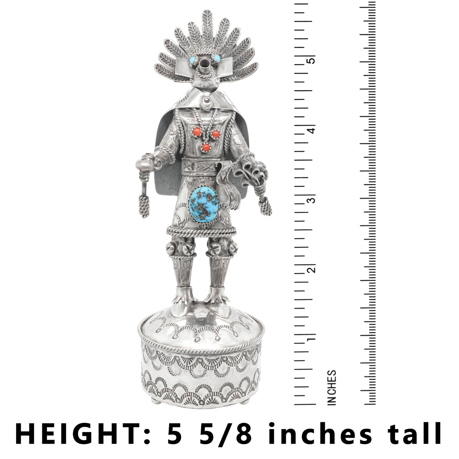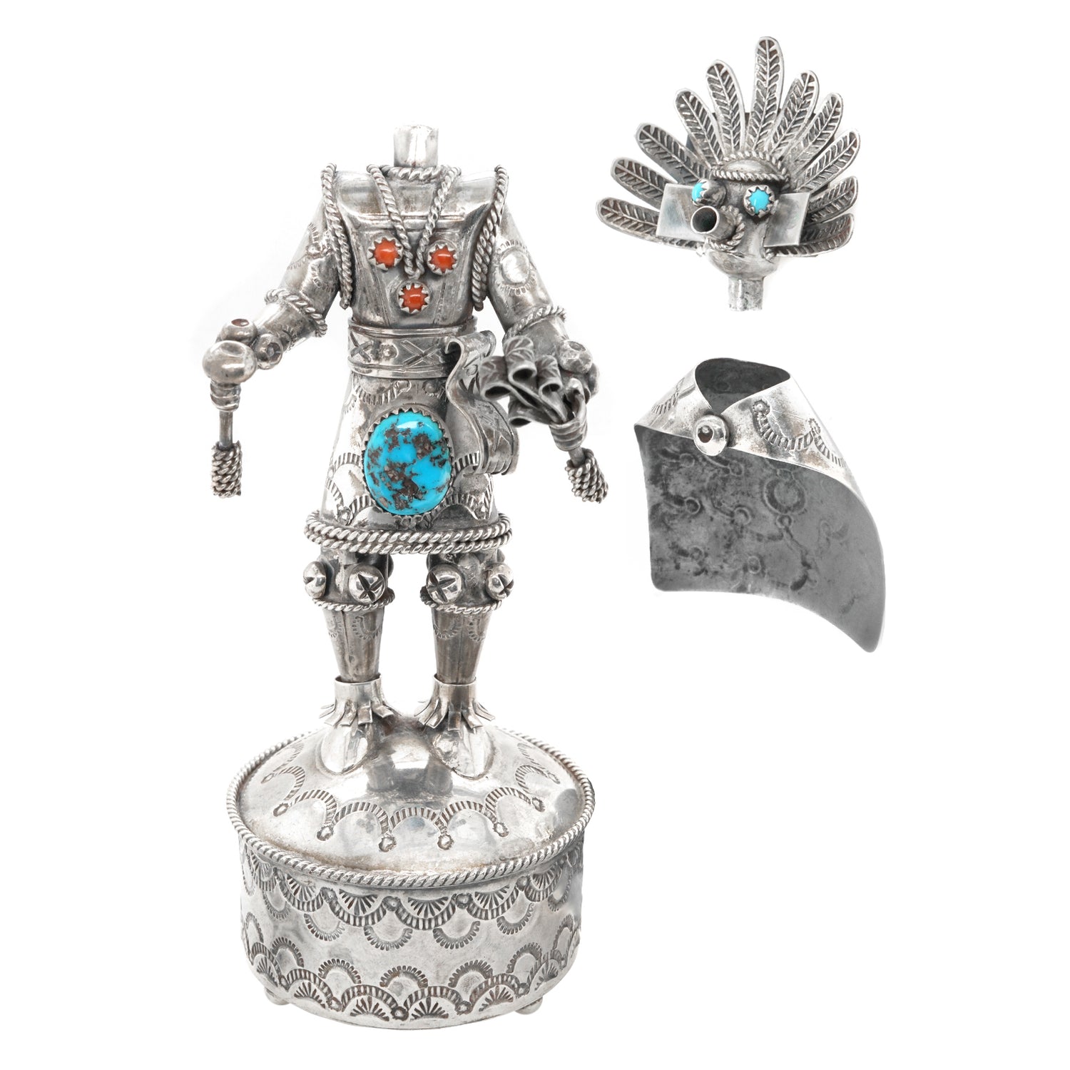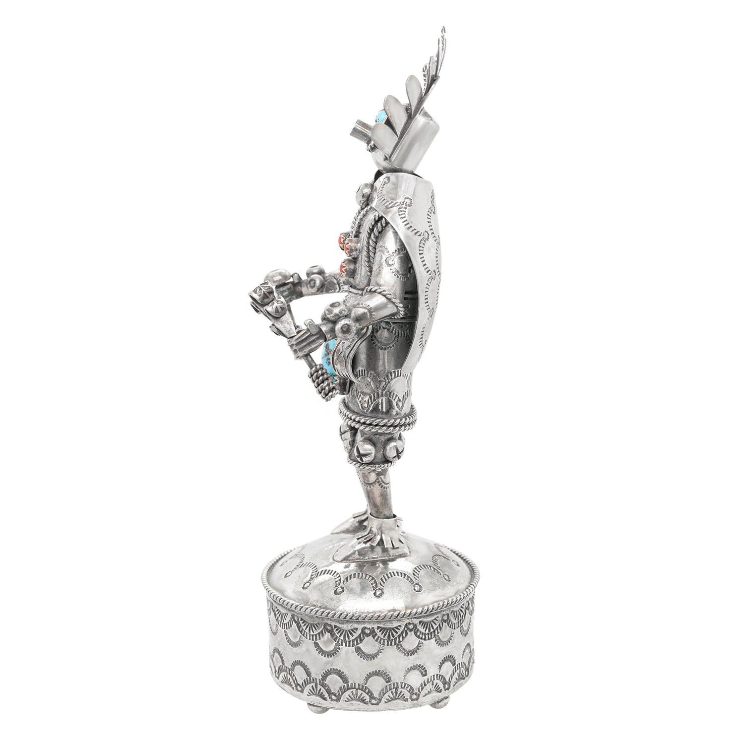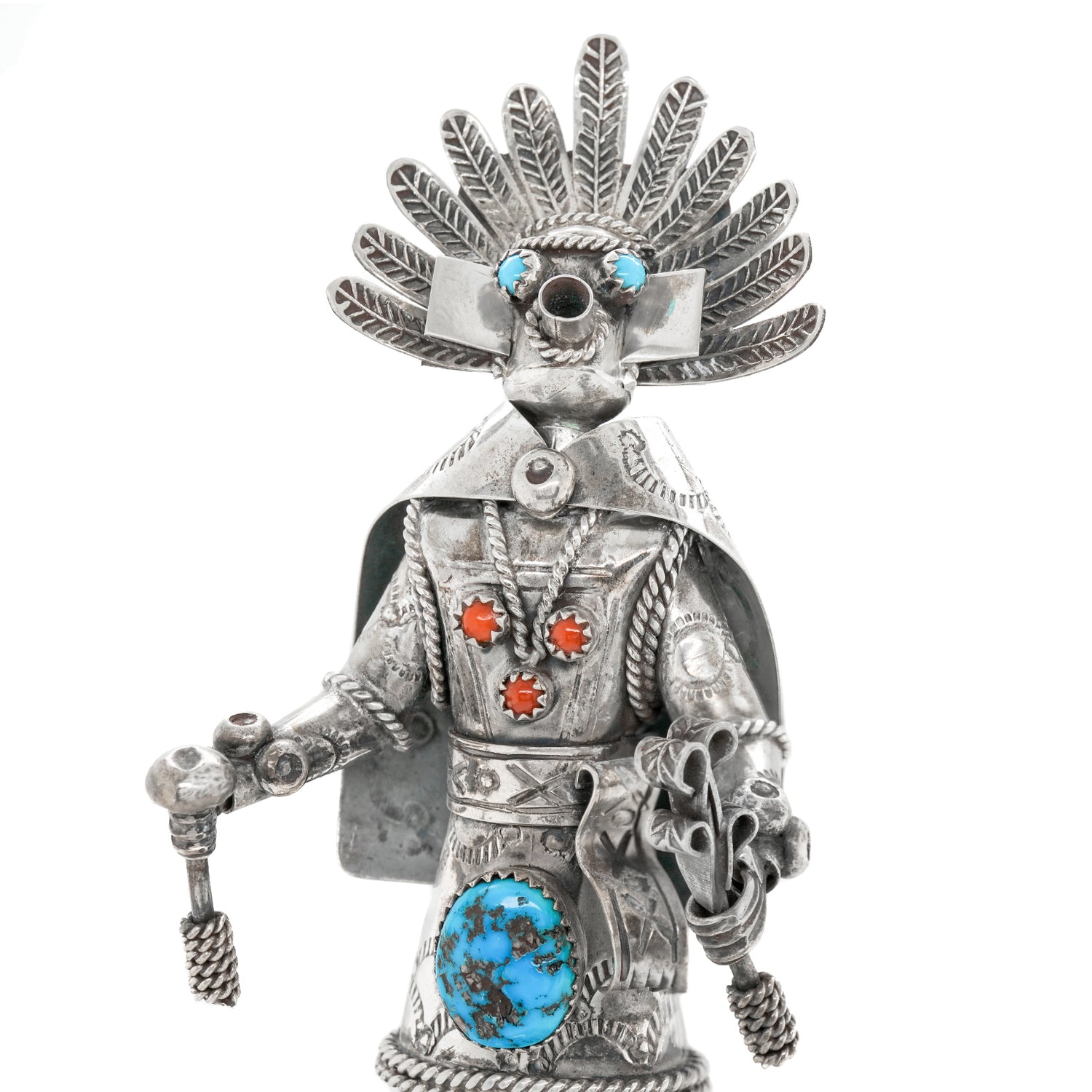Circa 1980s, Sterling Silver, by Toby Henderson, Dine-Navajo, American. This spectacular sterling figure of a Navajo spirit dancer by renowned Navajo silversmith Toby Henderson is highly detailed. Heavily worked and excessively concha stamped, it is the perfect way to connect with the spiritual world through Dine art! Excellent condition.