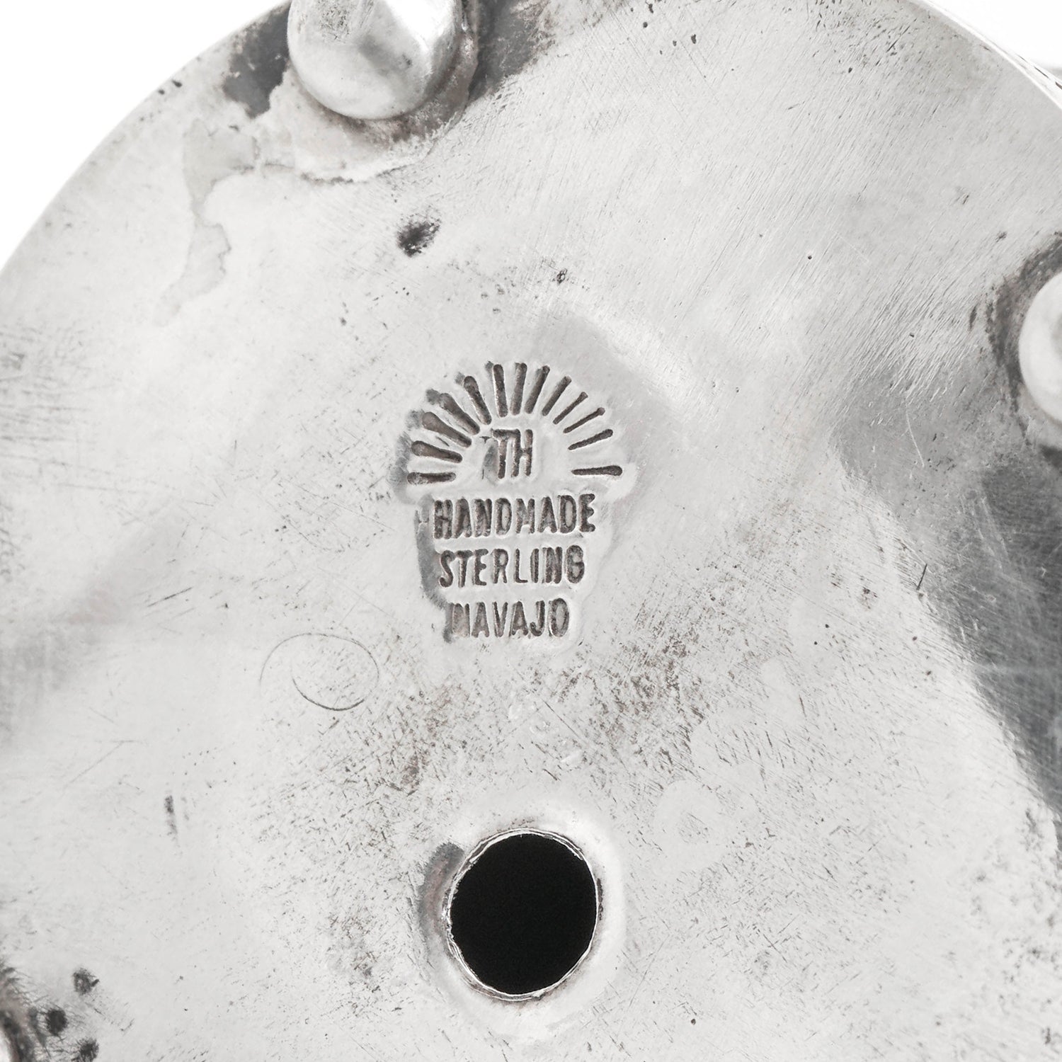 TH below a partial sun, maker's mark for Tobey Henderson, Handmade, Sterling, Navajo
