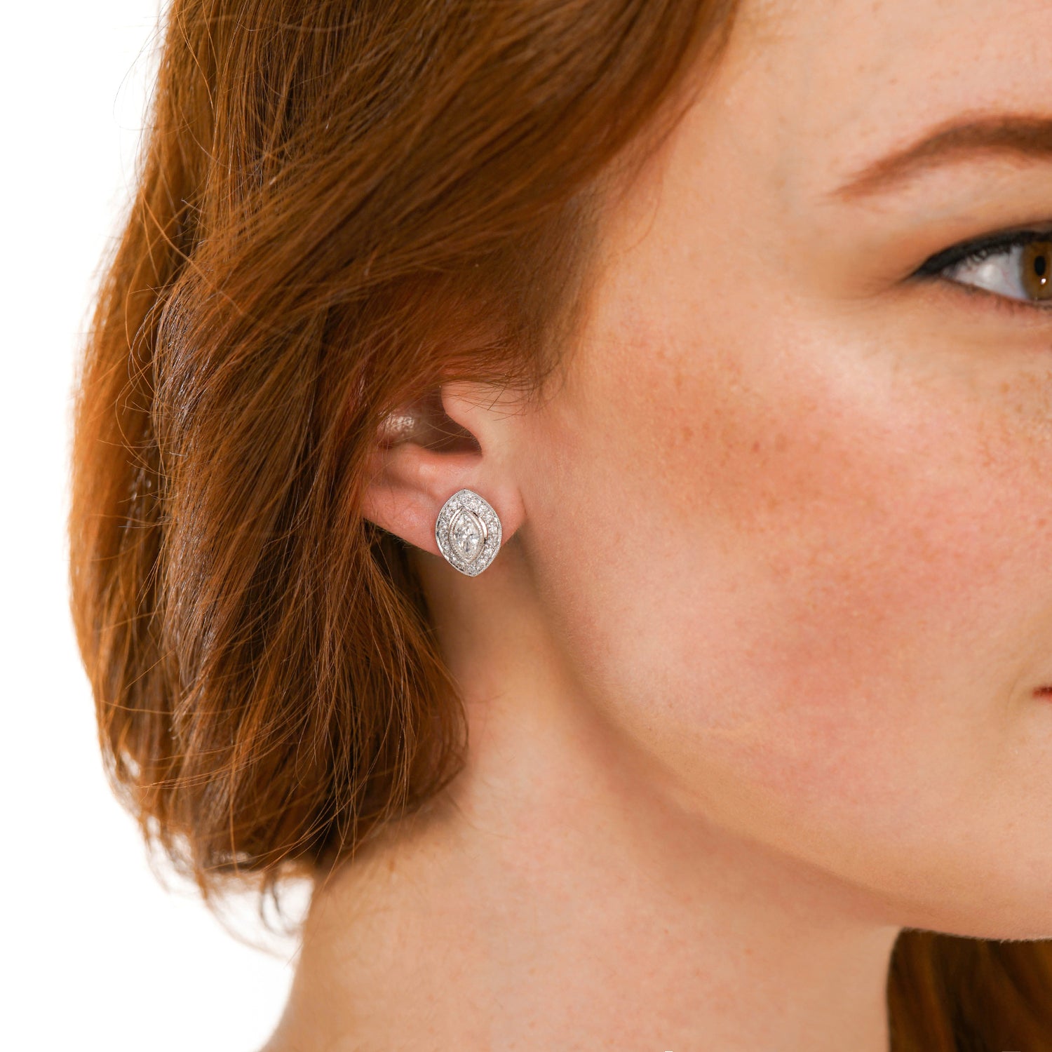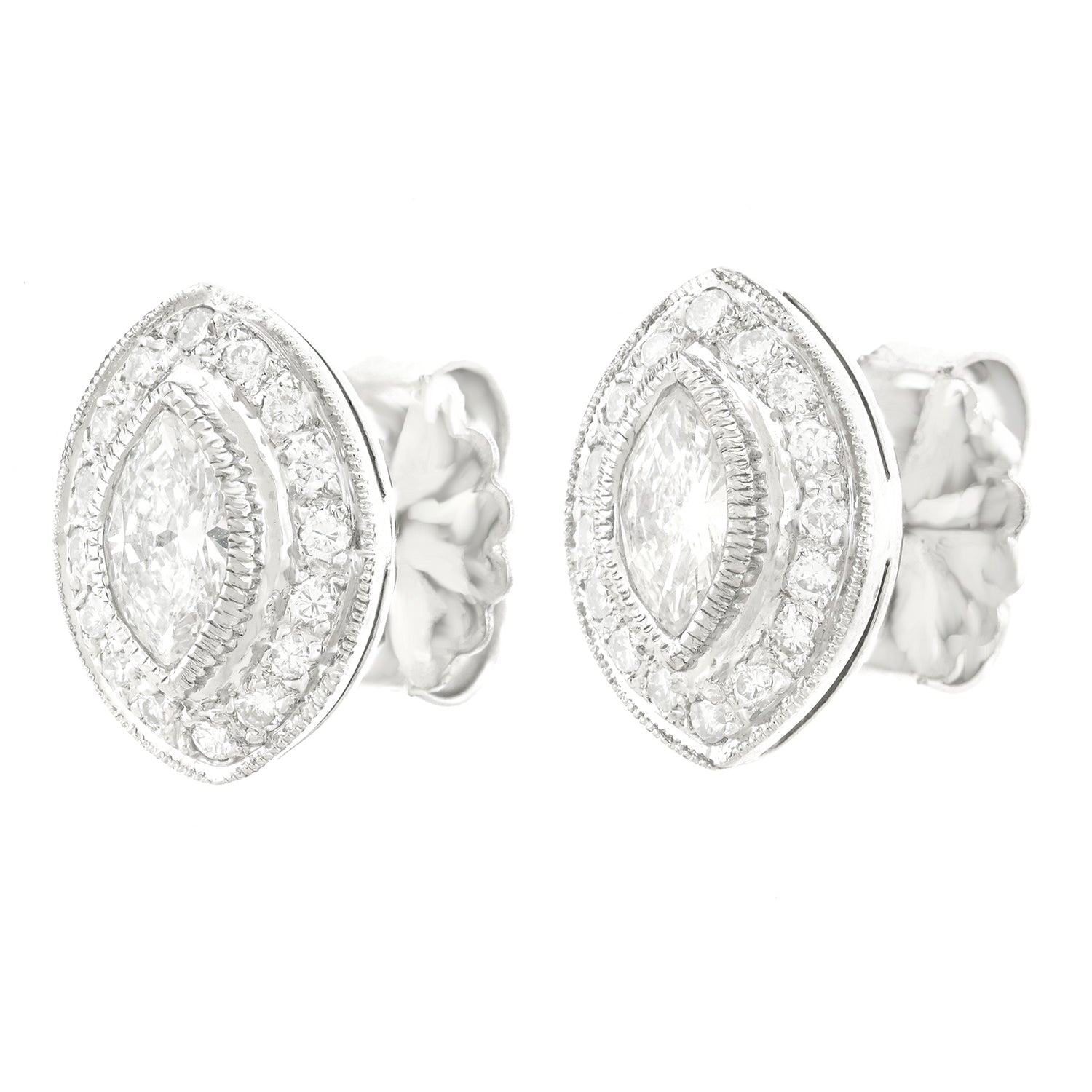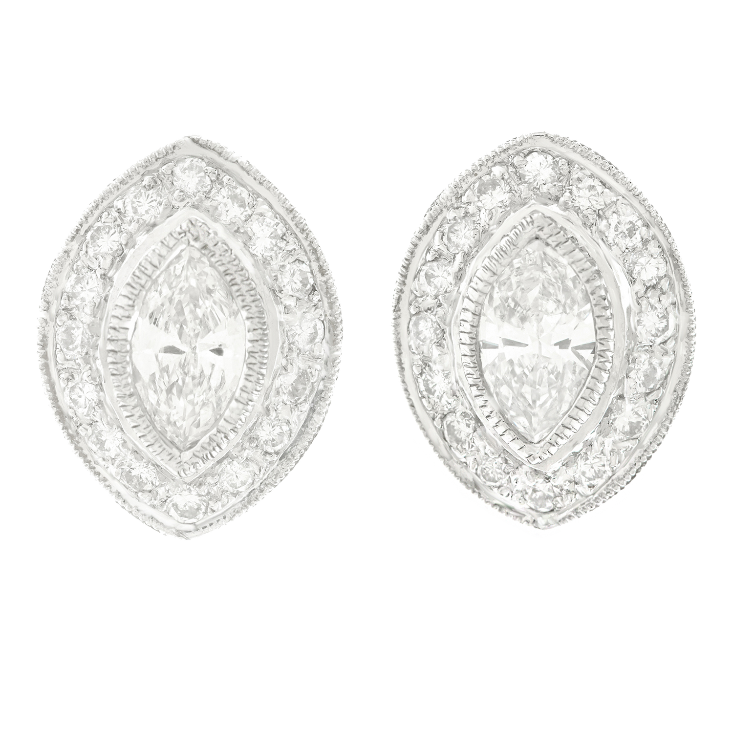 Circa 1980s, 18k, Hong Kong. Brilliant white diamonds take these uniquely-shaped earrings from gorgeous to extraordinary. The two large, marquise diamonds (.72 carats each) are surrounded by .37 carats of brilliant white diamonds (I color, SI1 clarity). Finely made in 18kt white gold, these earrings are in excellent condition.