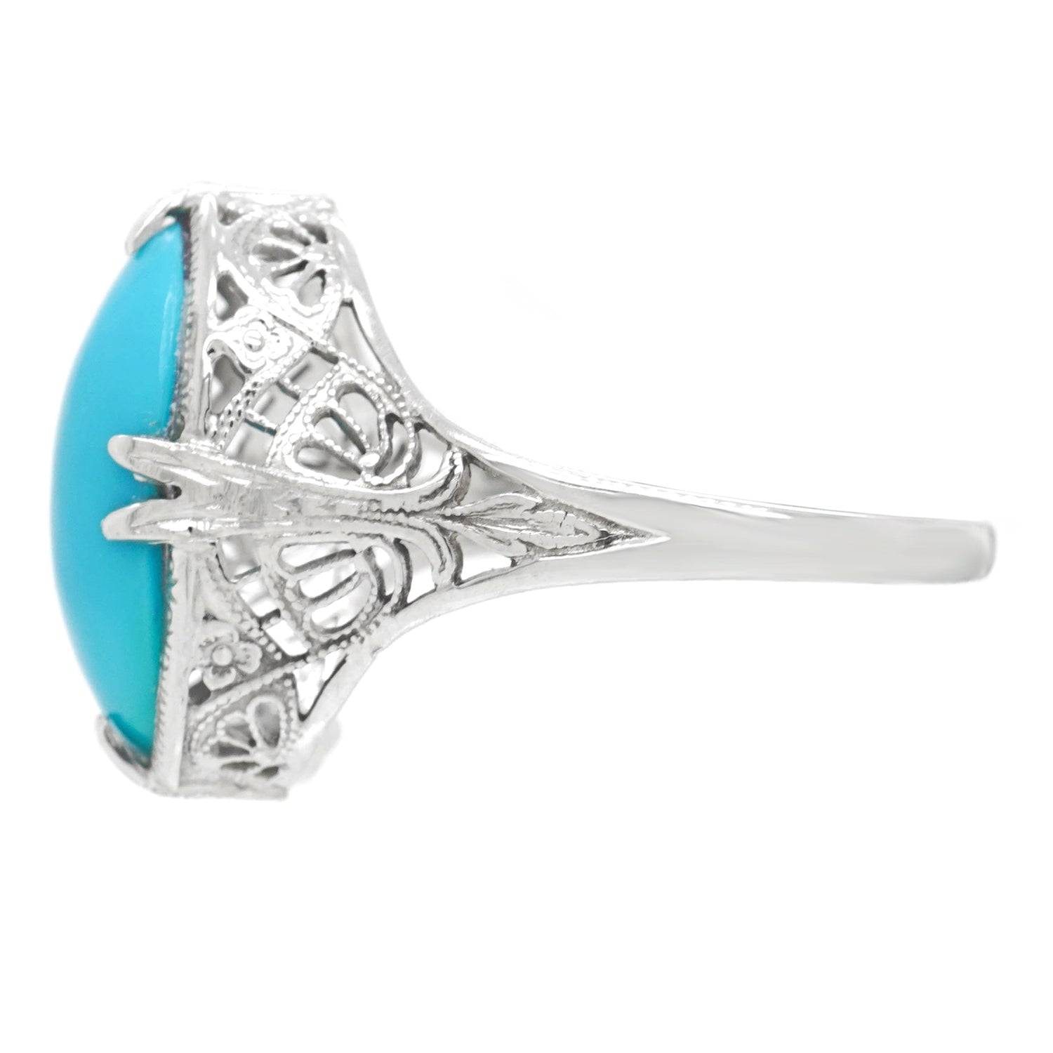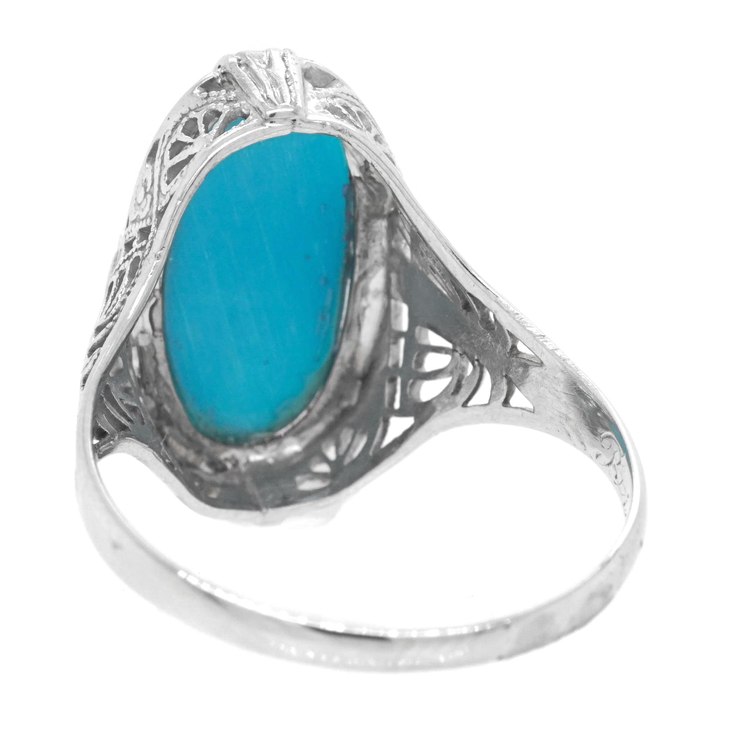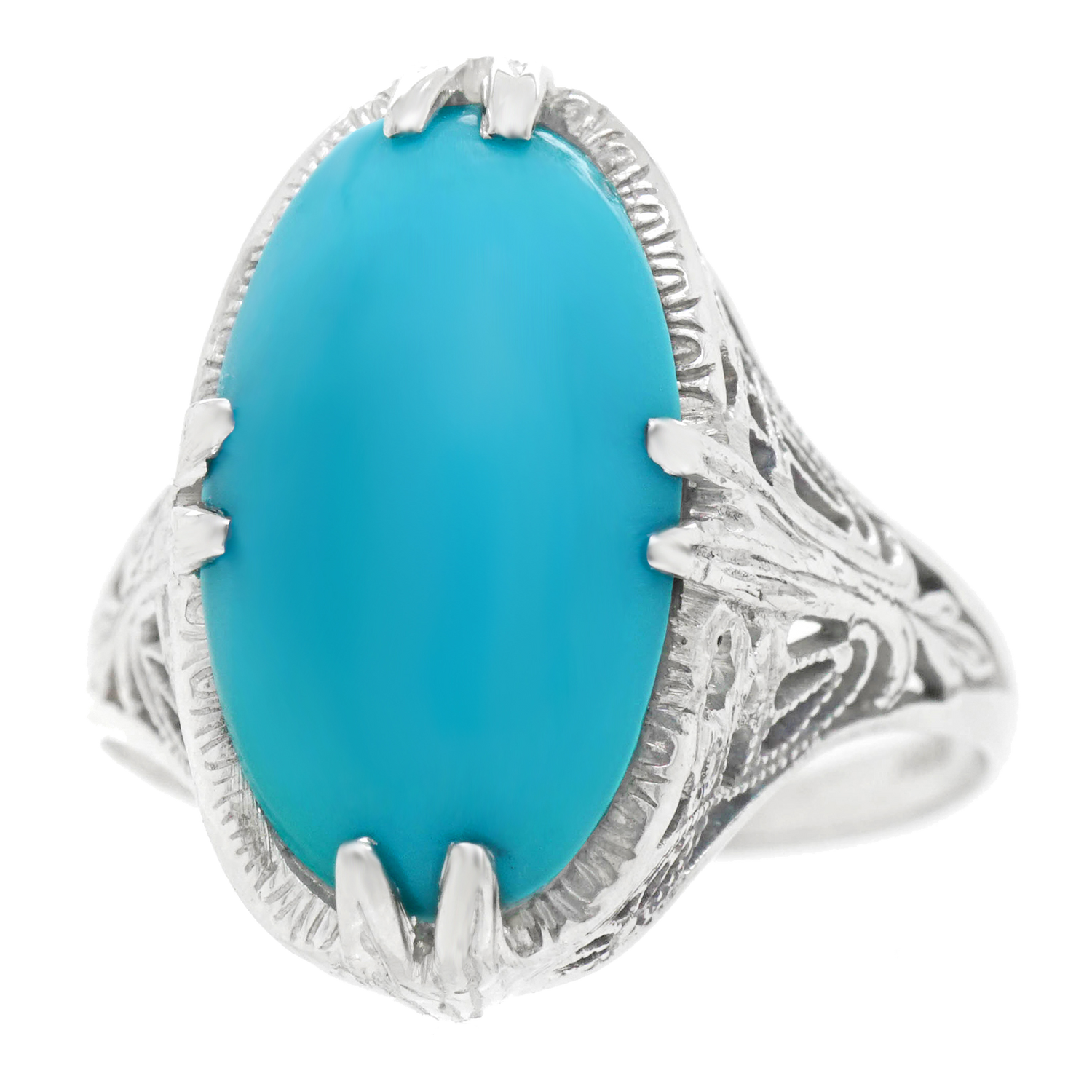 Circa 1930s, 18k. This Art Deco ring features a lush blue turquoise set in beautiful filigree work. The shape and scale make this ring a pleasure to wear. We made, it is in excellent condition.
