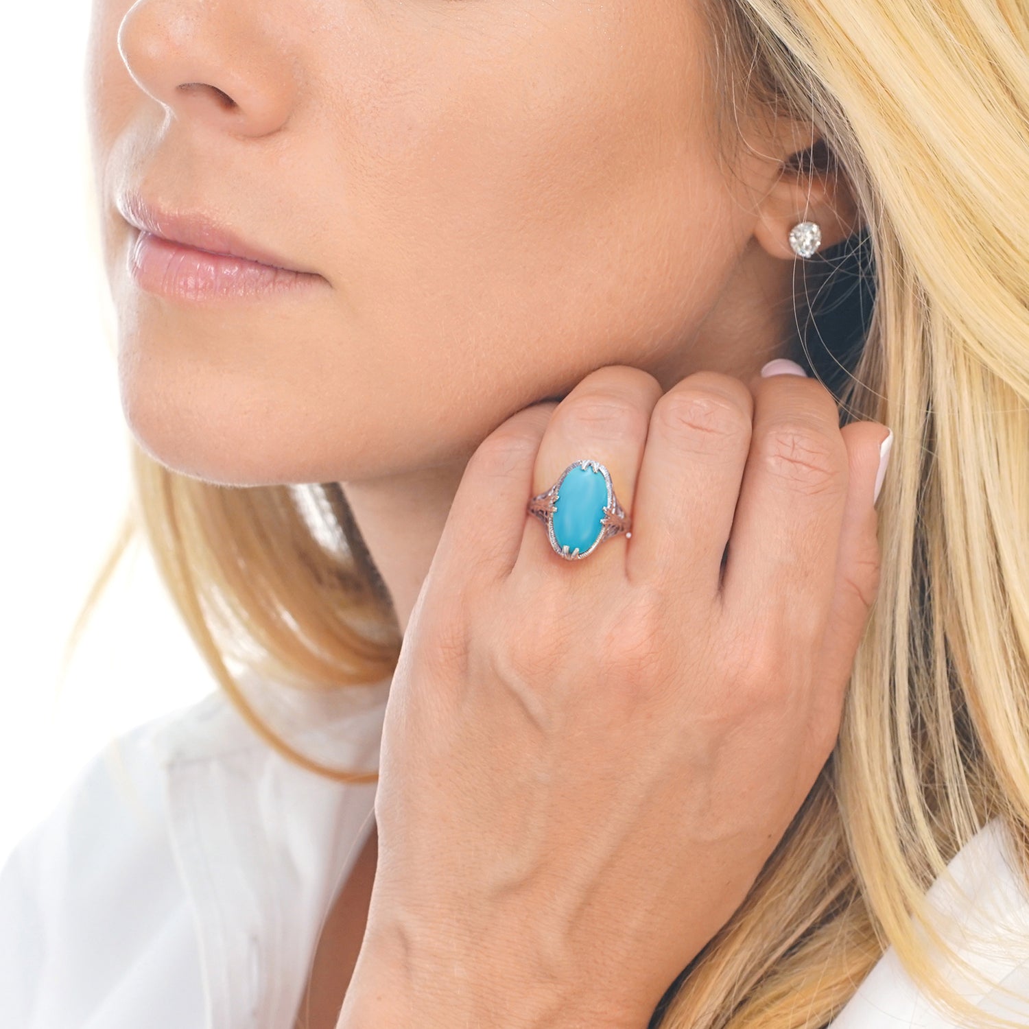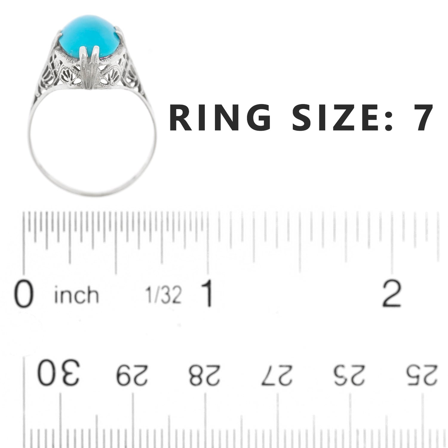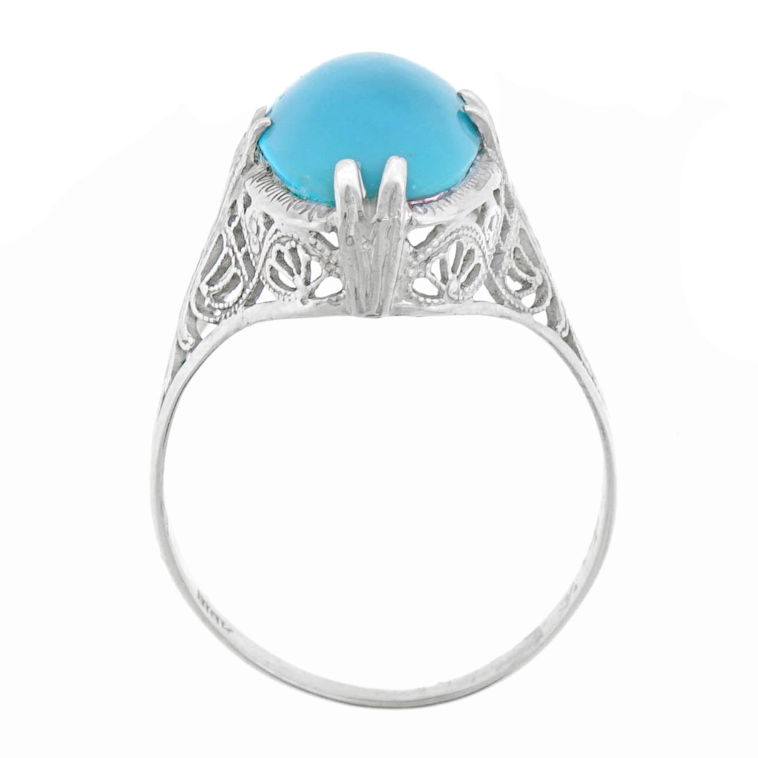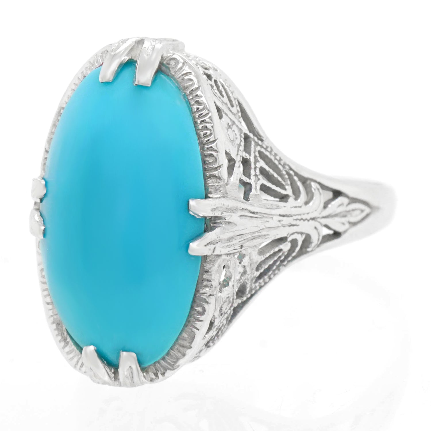 Circa 1930s, 18k. This Art Deco ring features a lush blue turquoise set in beautiful filigree work. The shape and scale make this ring a pleasure to wear. We made, it is in excellent condition.