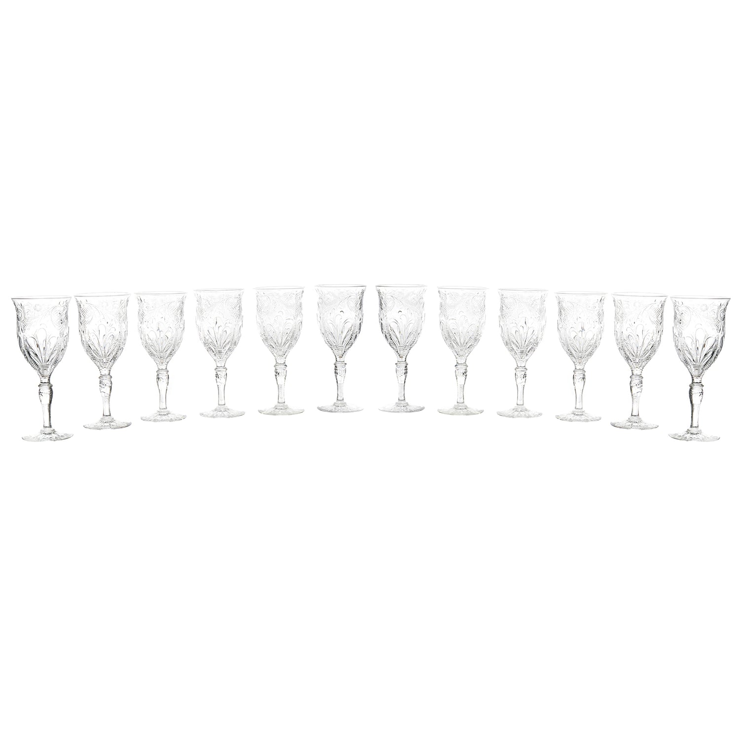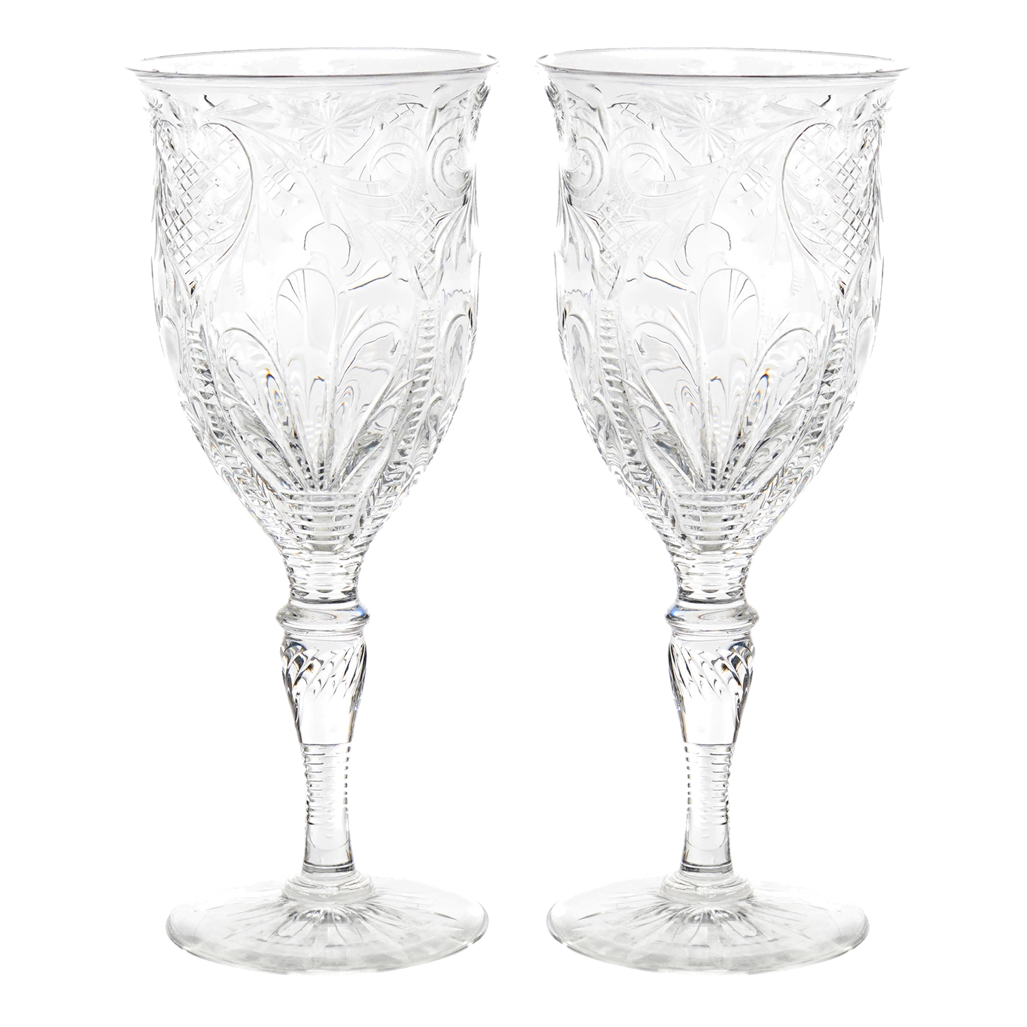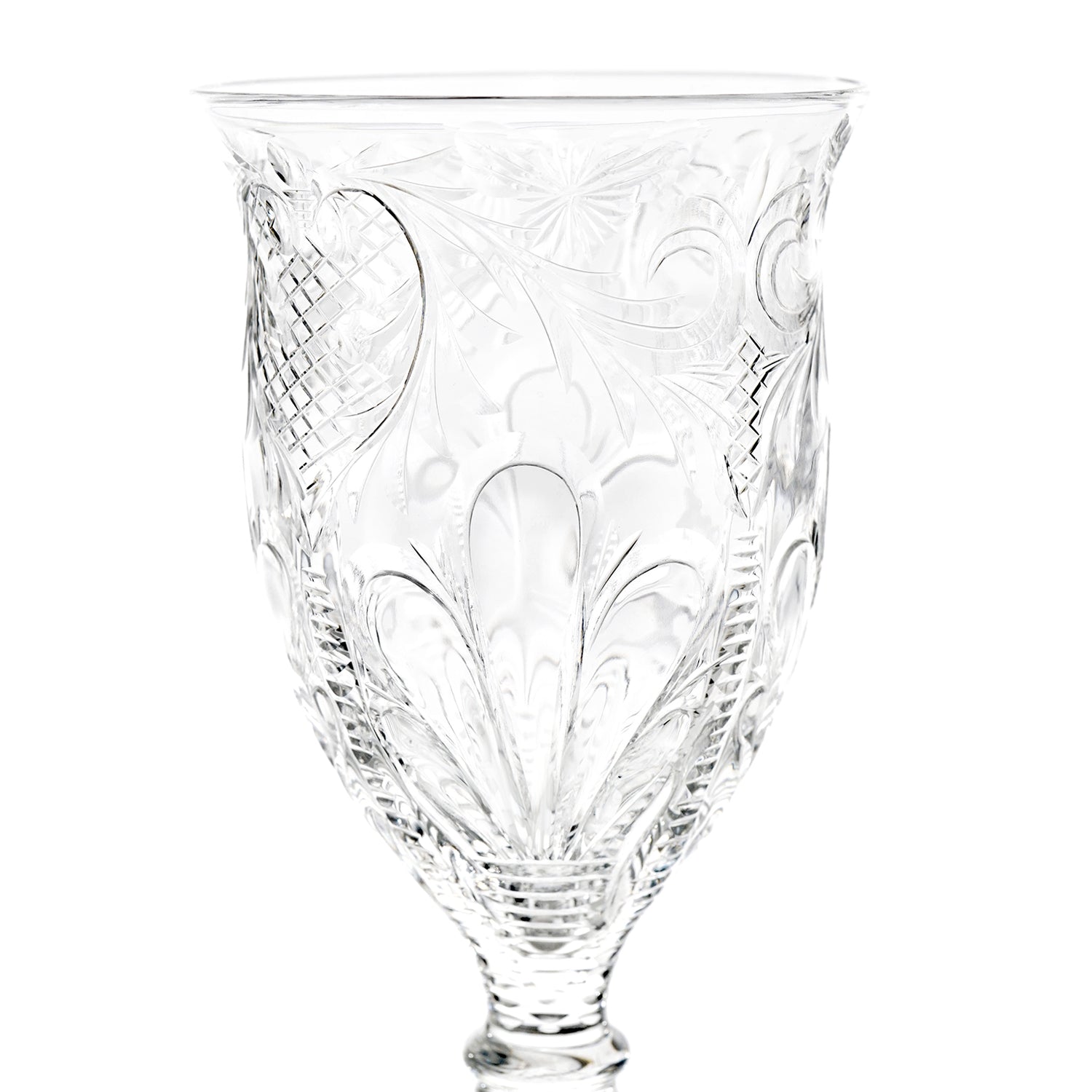 Circa 1880-90s, by Stevens & Williams, England. This stunning set of 12 goblets from the renowned British glassmaker Stevens & Williams is beyond rare (a single example is on display at the Corning Museum of Glass). Made in their signature rock crystal, the curvilinear cutting and special details mark these glasses as masterworks; there are no modern equivalents. Delightful to the eye, these glasses are perfectly proportioned and well-balanced, a pleasure to behold, and delightful to drink from. Excellent condition throughout.