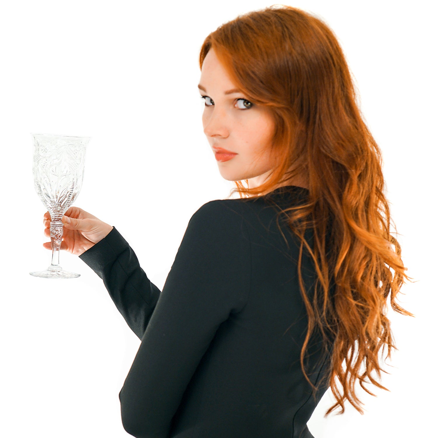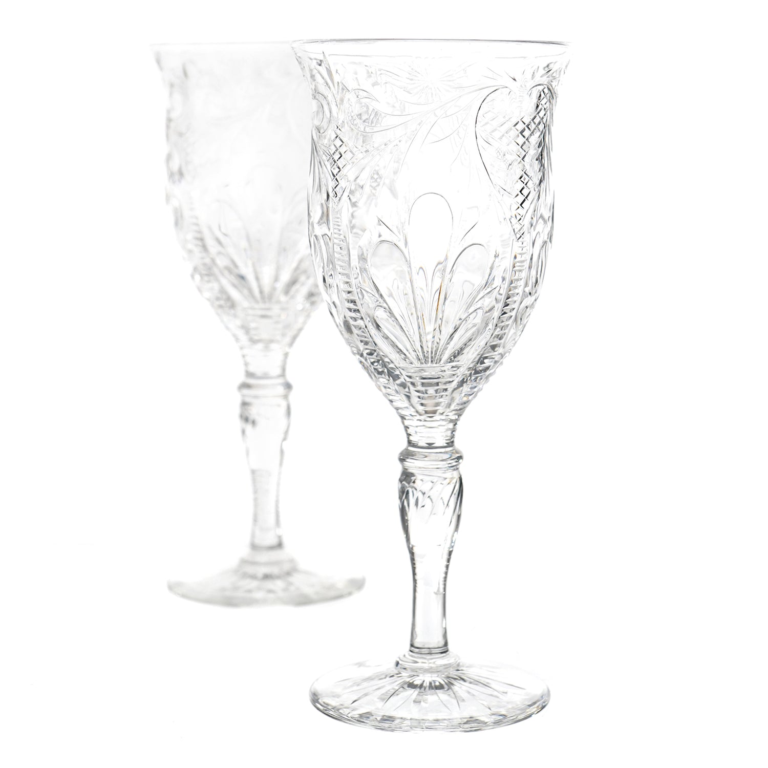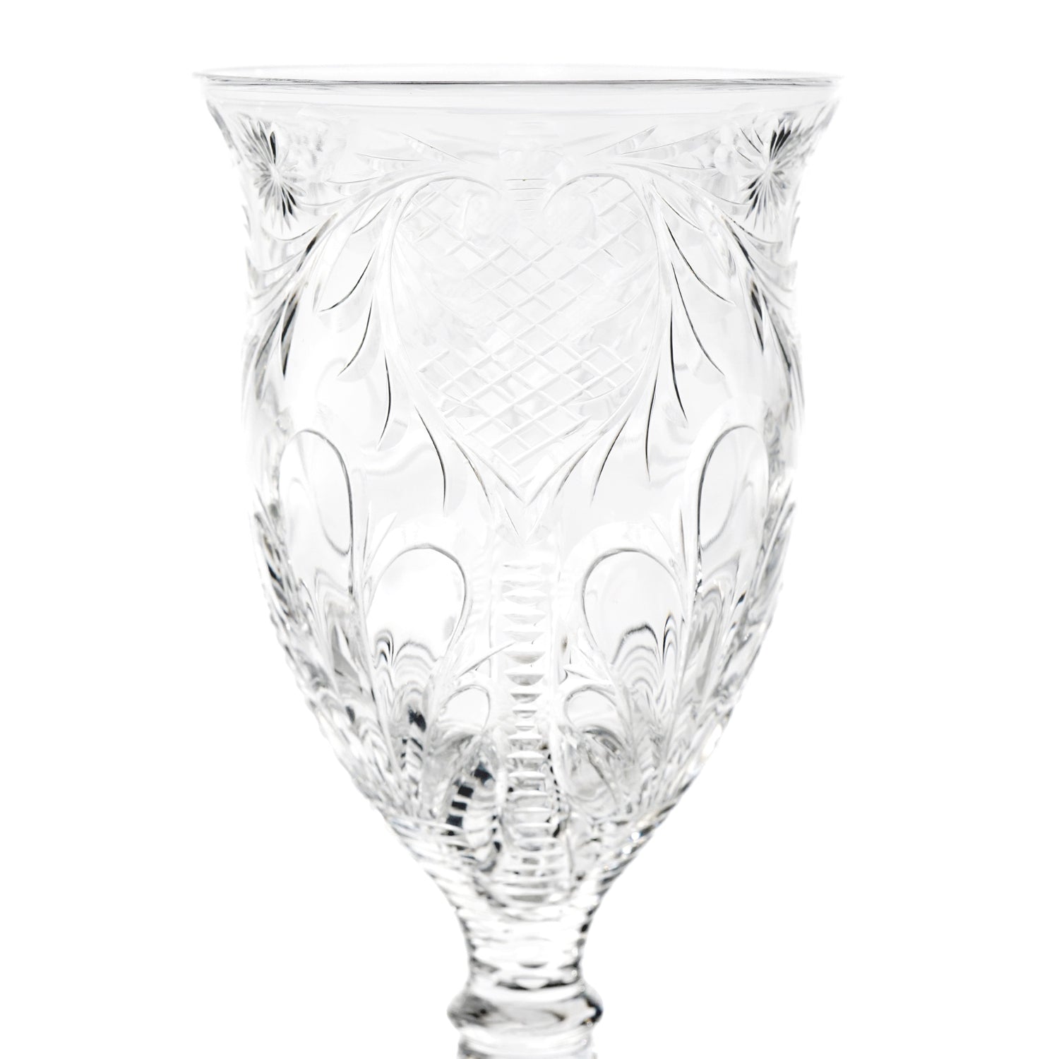 Circa 1880-90s, by Stevens & Williams, England. This stunning set of 12 goblets from the renowned British glassmaker Stevens & Williams is beyond rare (a single example is on display at the Corning Museum of Glass). Made in their signature rock crystal, the curvilinear cutting and special details mark these glasses as masterworks; there are no modern equivalents. Delightful to the eye, these glasses are perfectly proportioned and well-balanced, a pleasure to behold, and delightful to drink from. Excellent condition throughout.