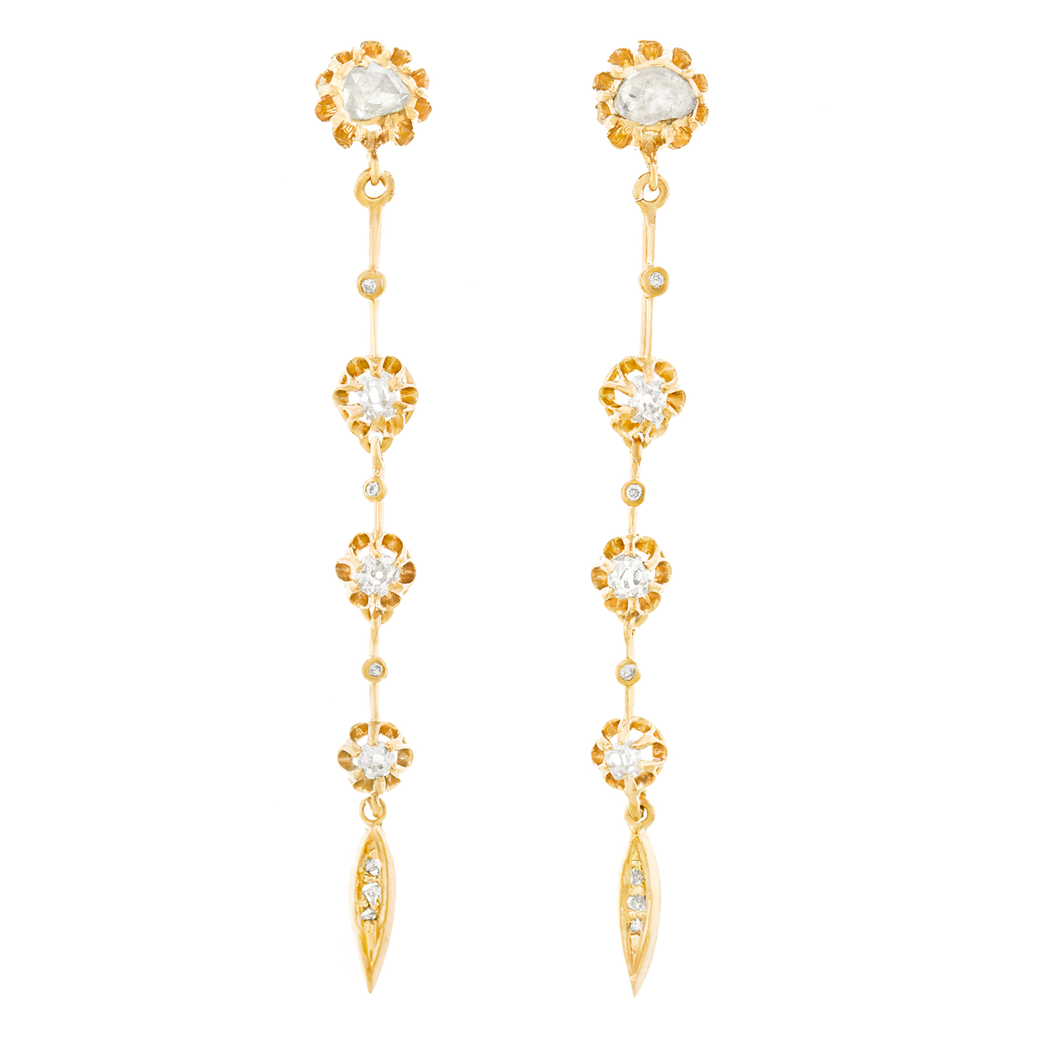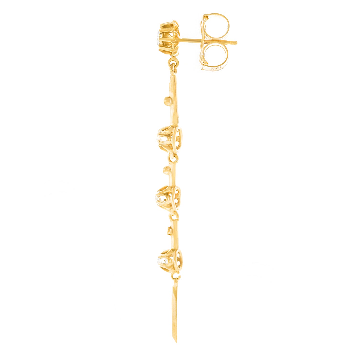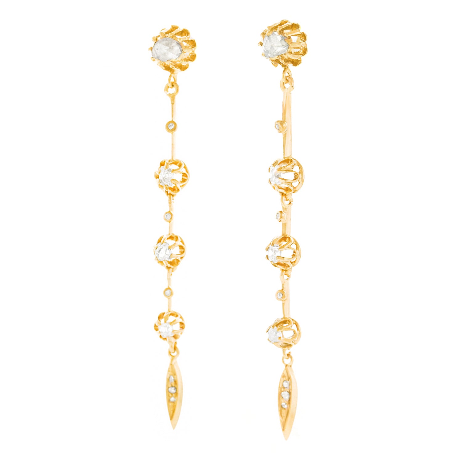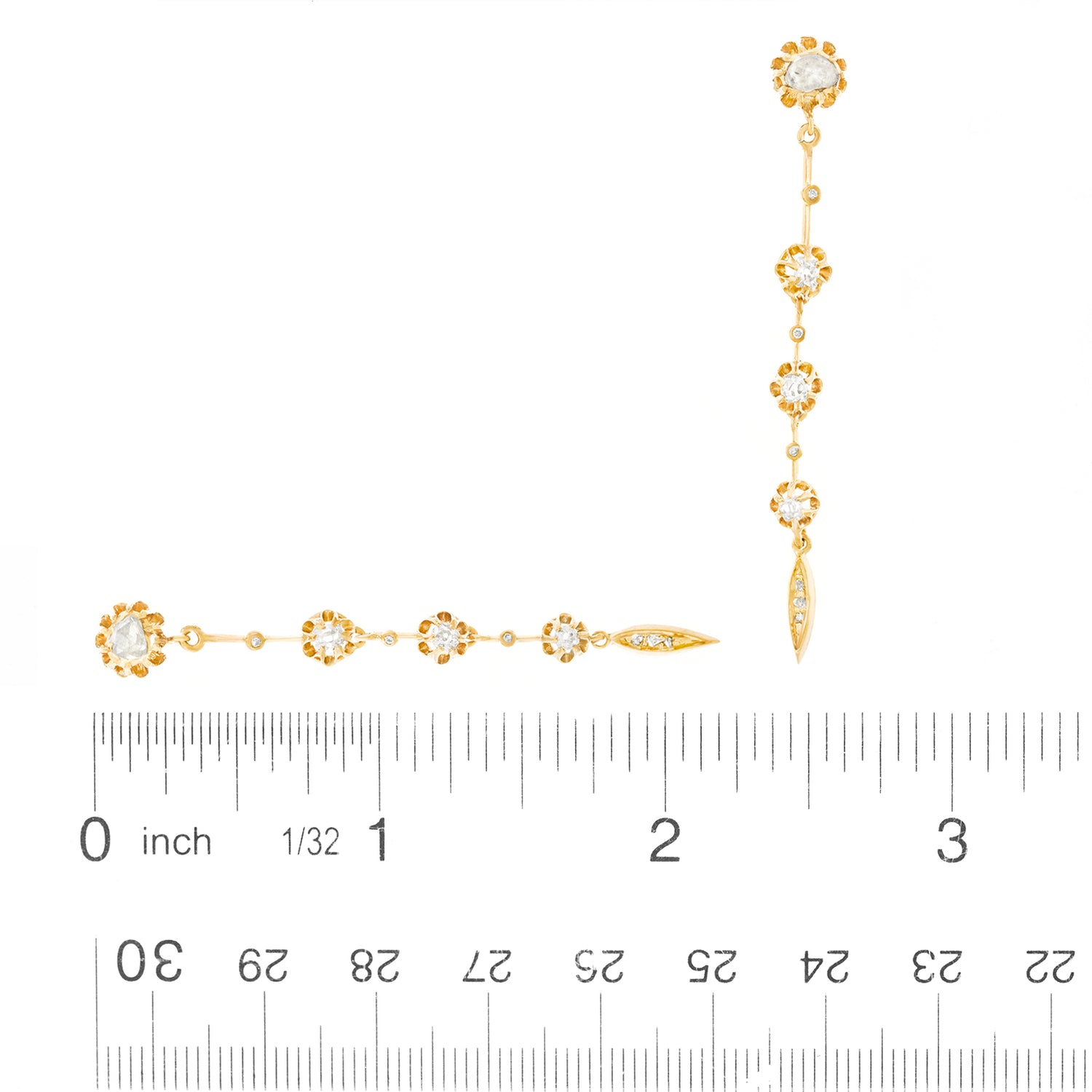 Circa 1880s, 18k, France. Set with lovely old mine-cut diamonds, these late 1800s dangle earrings are perfect for heels and jeans or cocktail attire. Their breezy wearability is underscored by fine fabrication. They are in excellent condition.