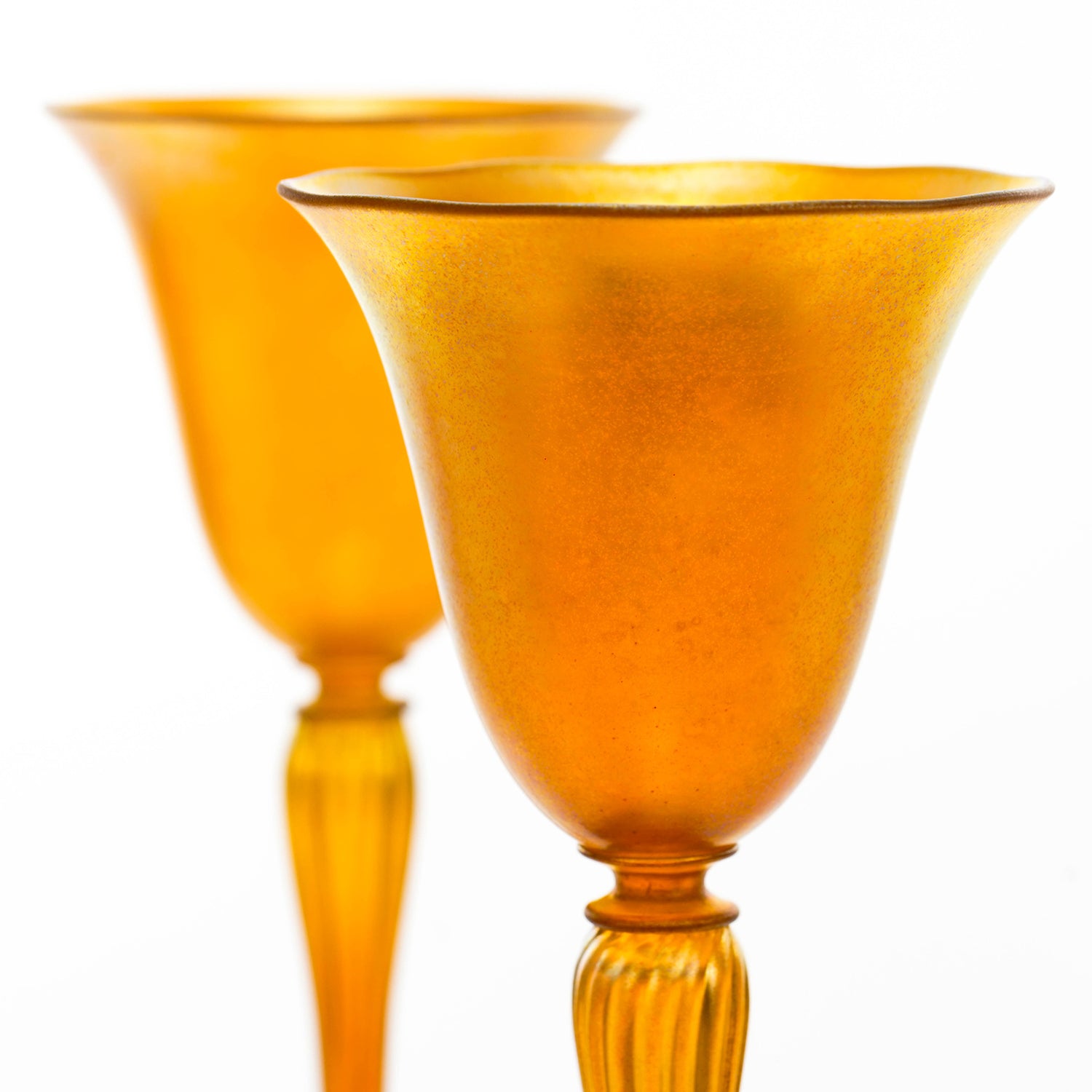 Circa 1920s, by Victor Durand for Durand Art Glass, Vineland, New Jersey. These rare golden orange luster water goblets by the renowned firm Durand Art Glass, are perfect for any table. From spotting antiques to highlighting modern, they will be the center of attention at any dining moment. This is a set of 12 plus a spare for a total of 13 goblets. Excellent condition.