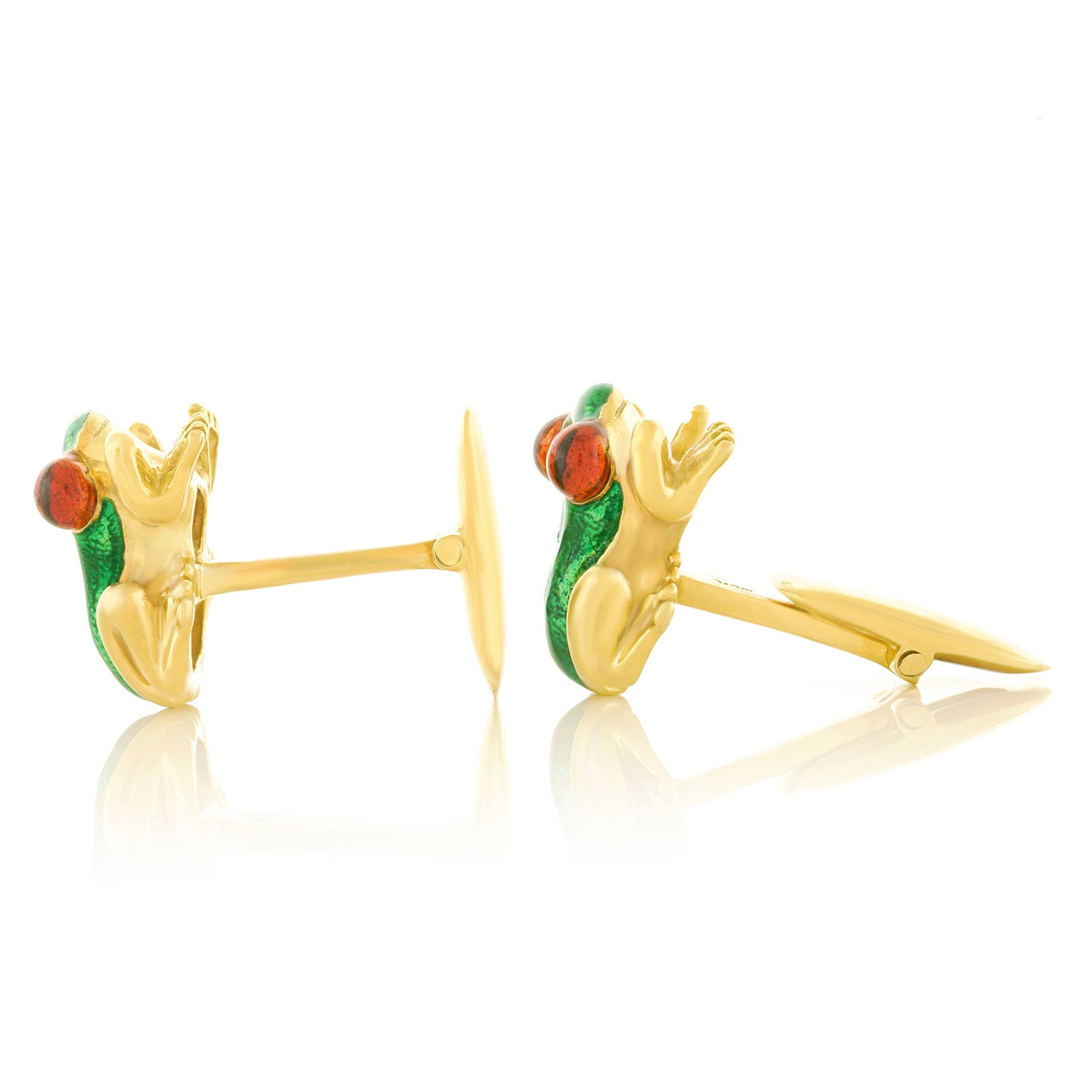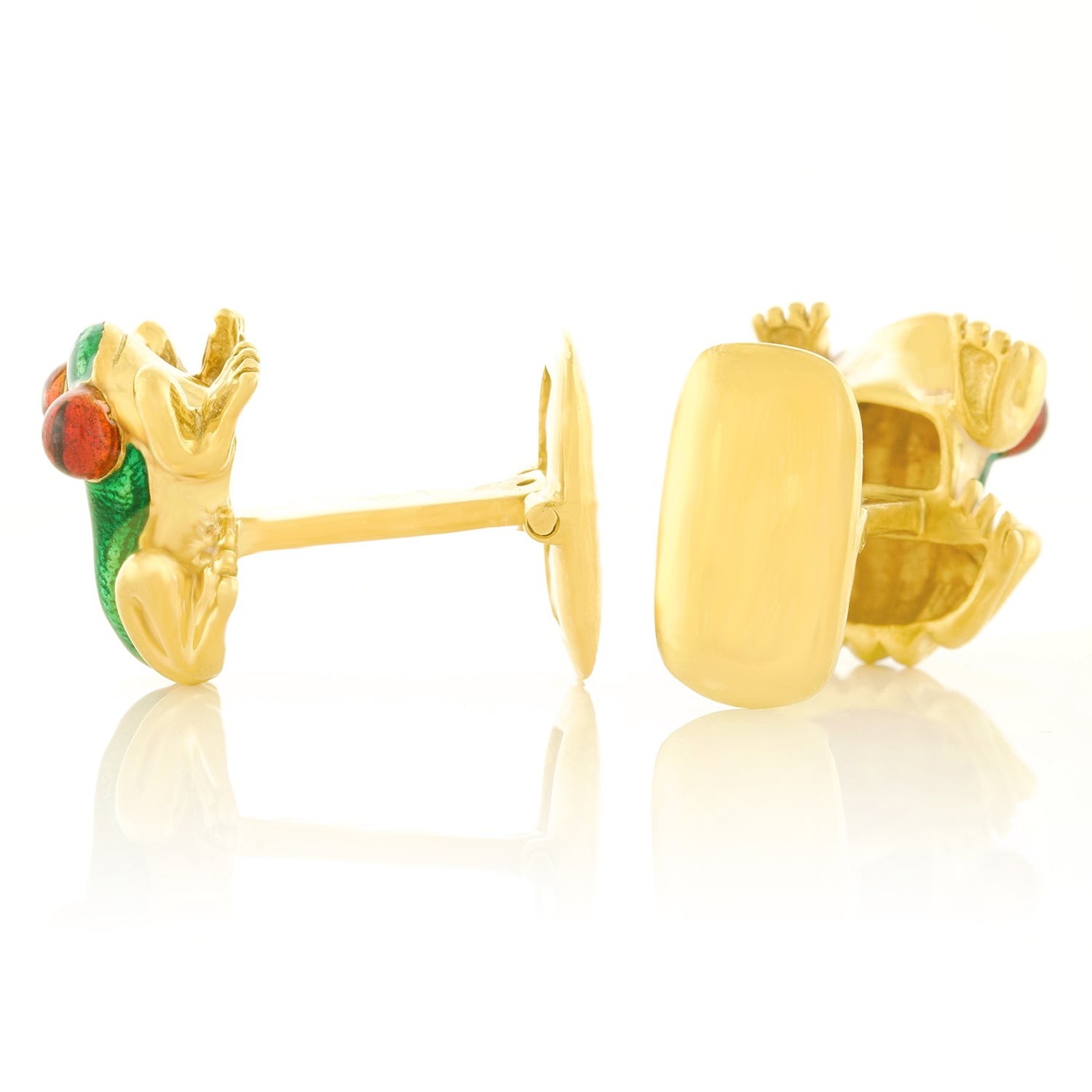 Circa 1990s, 18k, by Suzy Mor, American. These whimsical Amazonian frog cufflinks are beautifully detailed. Enameled in vivid green and red amber, these well-made cufflinks are substantial in weight and in excellent condition.