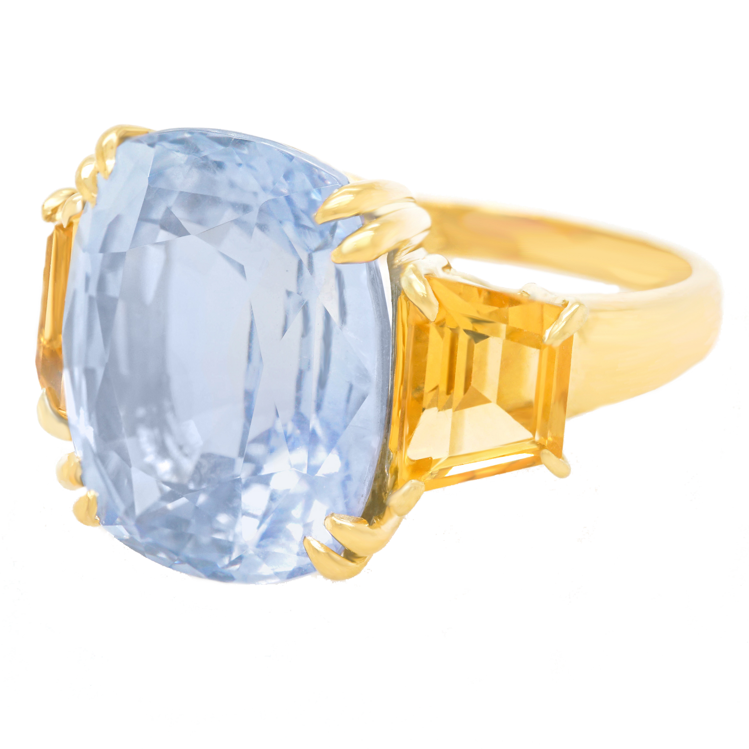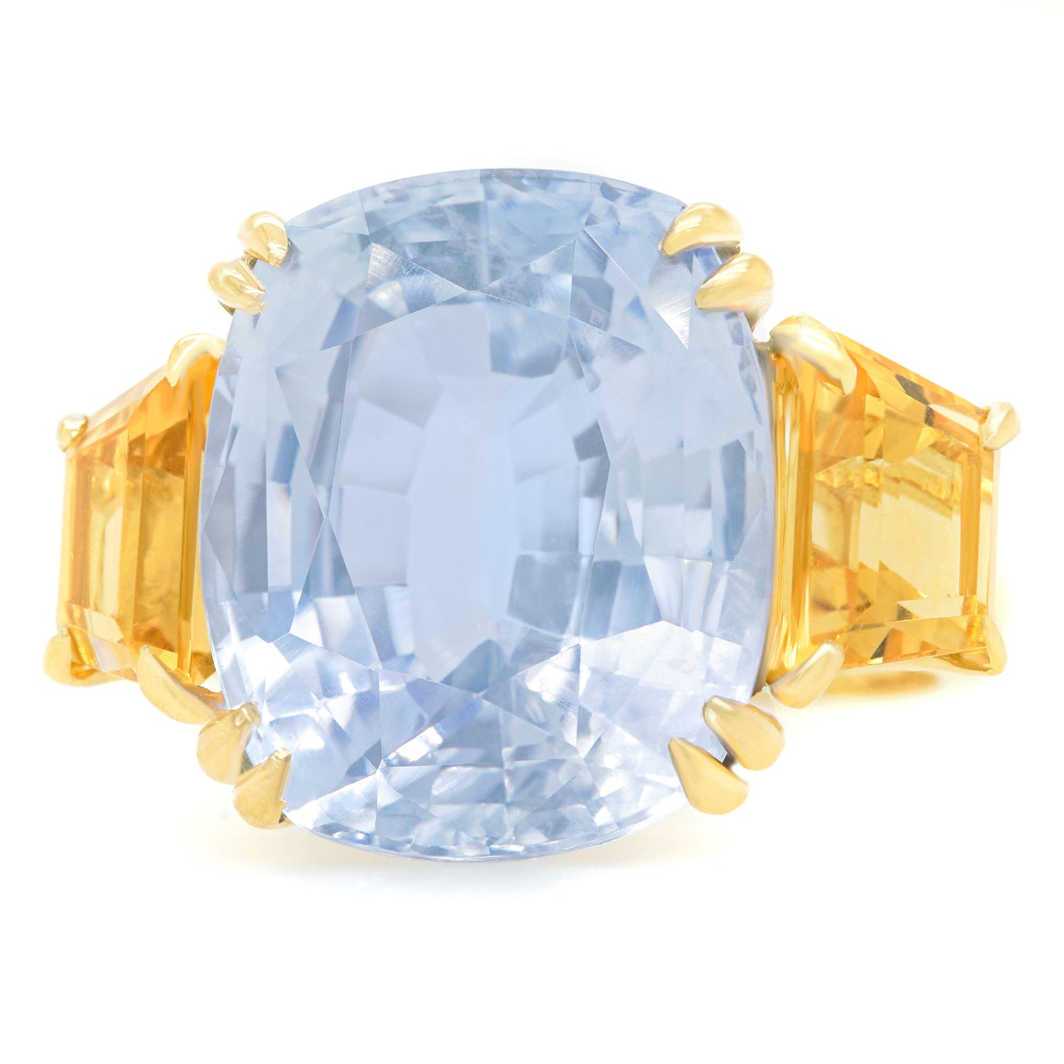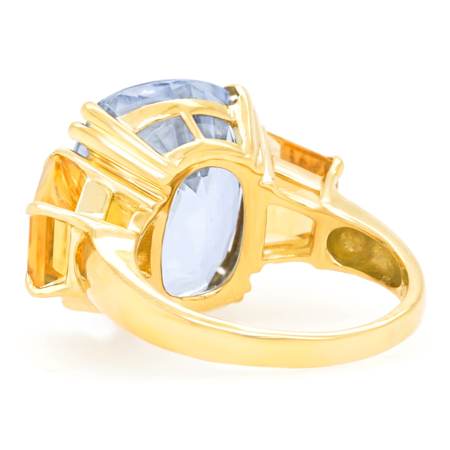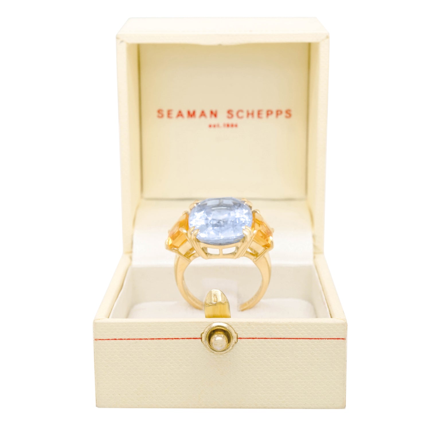 Circa late 20th Century, 18k, by Seaman Schepps, American. This spectacular Seaman Schepps ring features an 18.81-carat antique cushion cut sapphire flanked by a pair of trapezoid citrines. The pastel blue sapphire is a "no heat" Ceylon stone accompanied by a GIA laboratory report. Its color palette, assembled in ideal proportions, is an iconic Seaman Schepps design statement. The look is American Girl Glamour at its catwalk-to-sidewalk best. Meticulously fabricated in 18-karat yellow gold, it is in excellent condition.