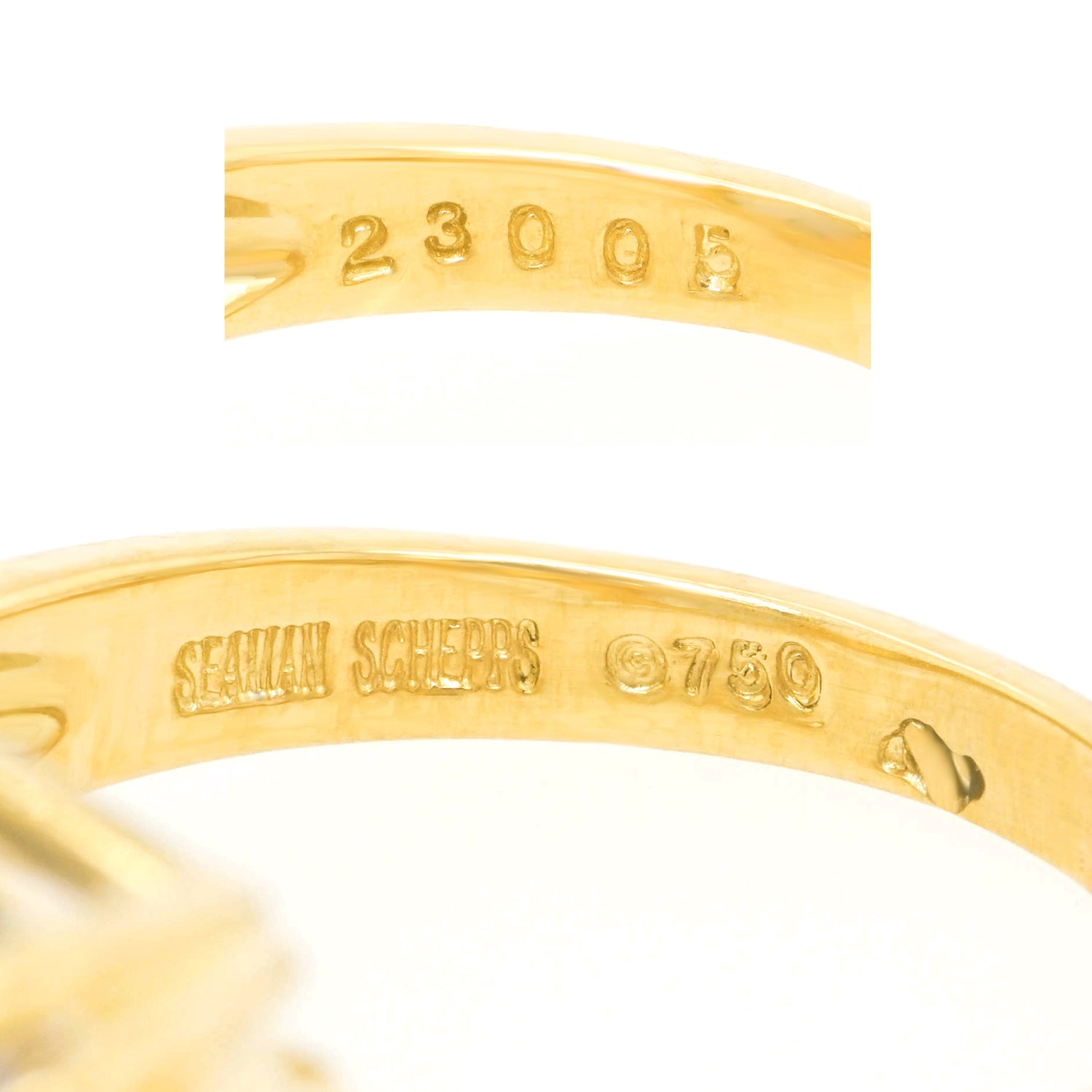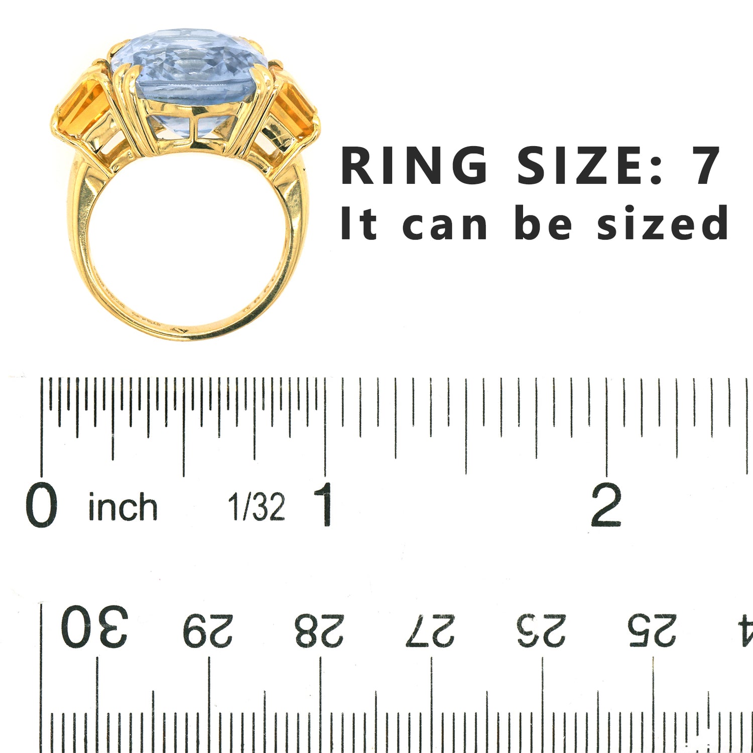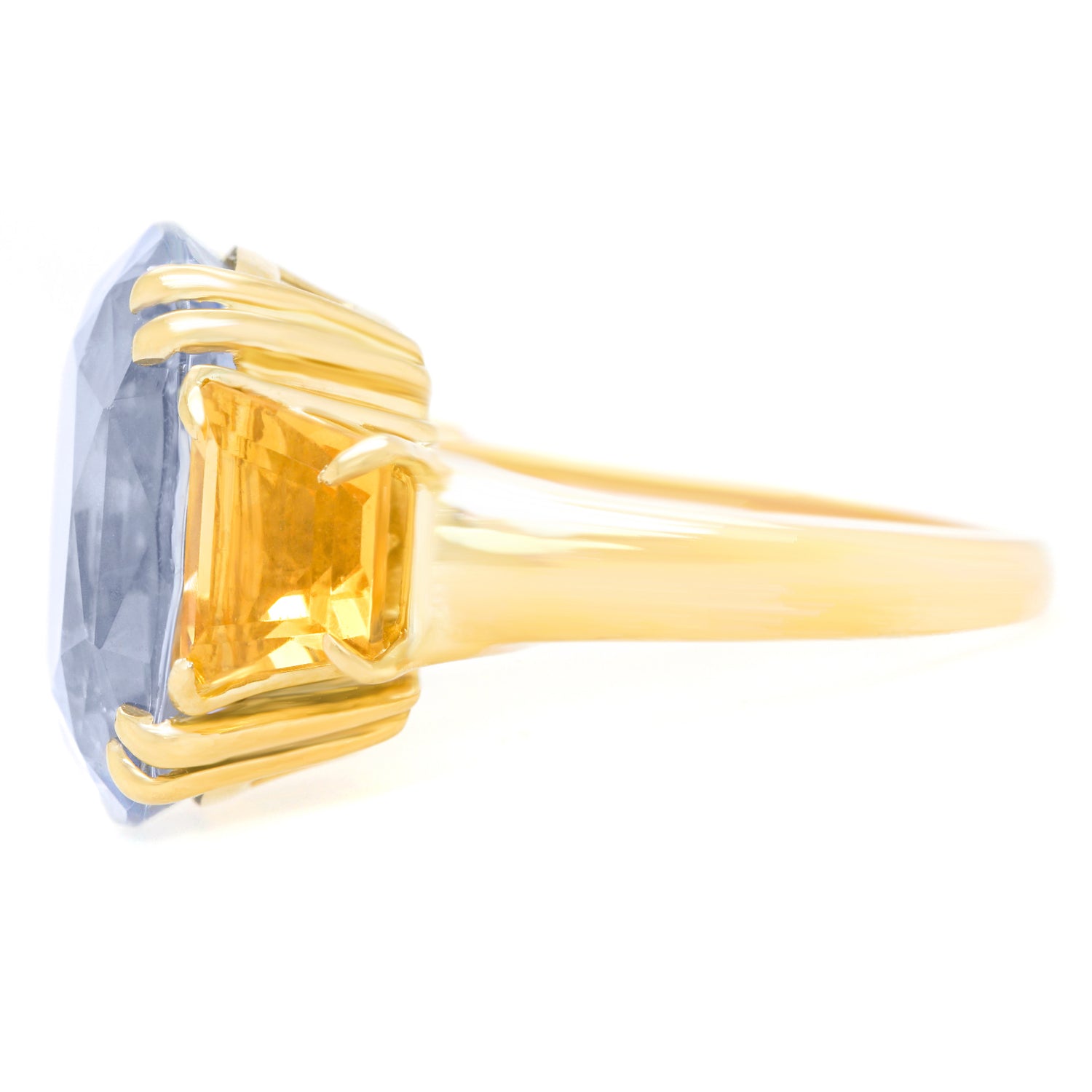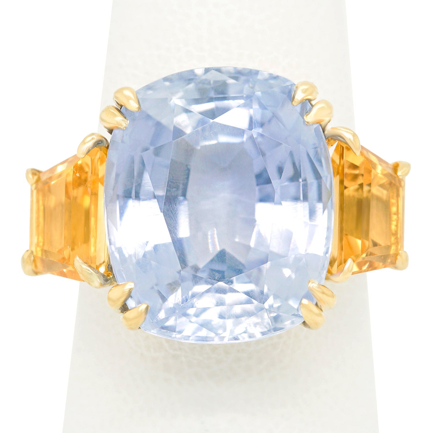 Circa late 20th Century, 18k, by Seaman Schepps, American. This spectacular Seaman Schepps ring features an 18.81-carat antique cushion cut sapphire flanked by a pair of trapezoid citrines. The pastel blue sapphire is a "no heat" Ceylon stone accompanied by a GIA laboratory report. Its color palette, assembled in ideal proportions, is an iconic Seaman Schepps design statement. The look is American Girl Glamour at its catwalk-to-sidewalk best. Meticulously fabricated in 18-karat yellow gold, it is in excellent condition.