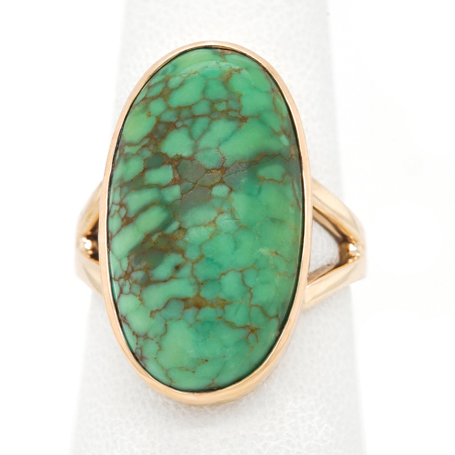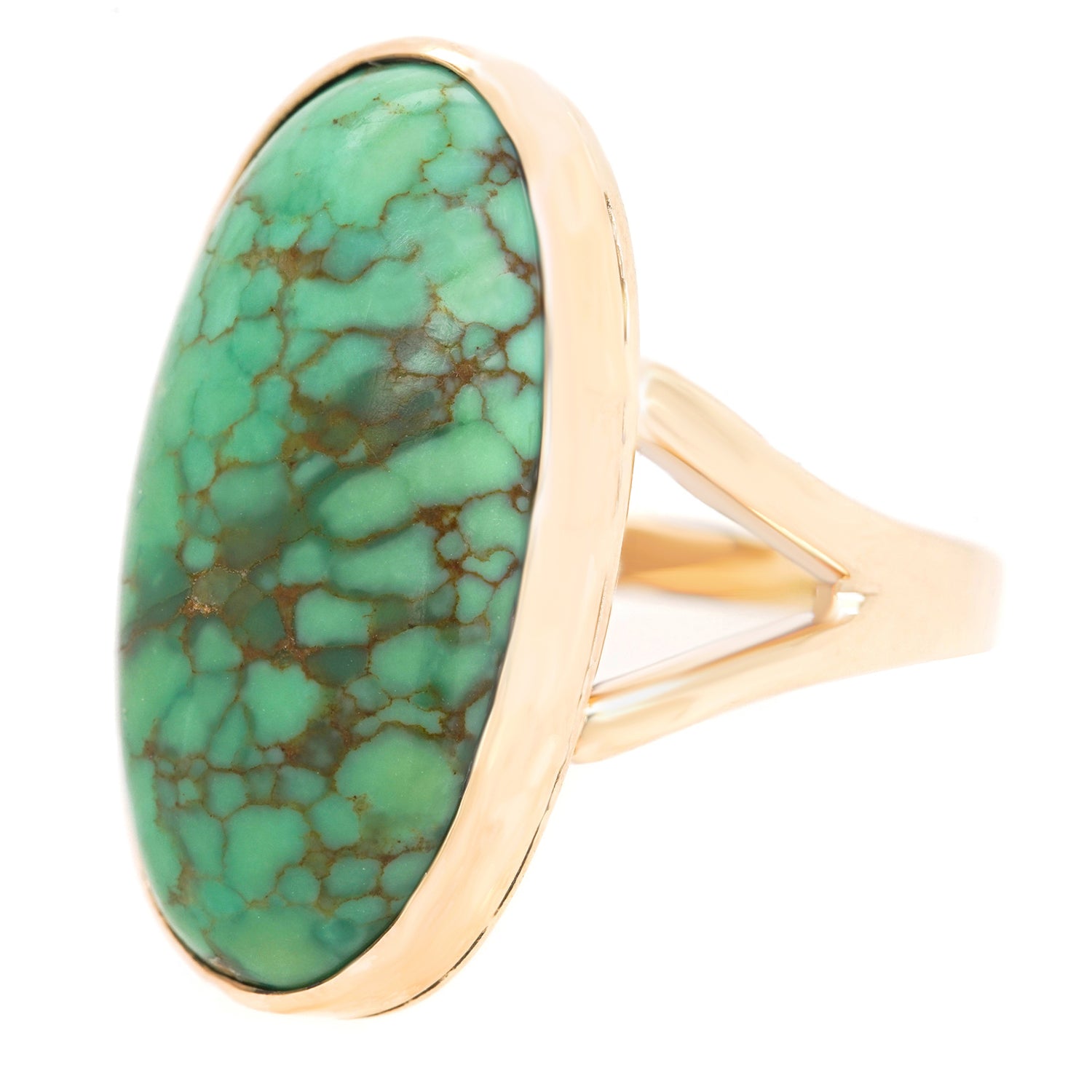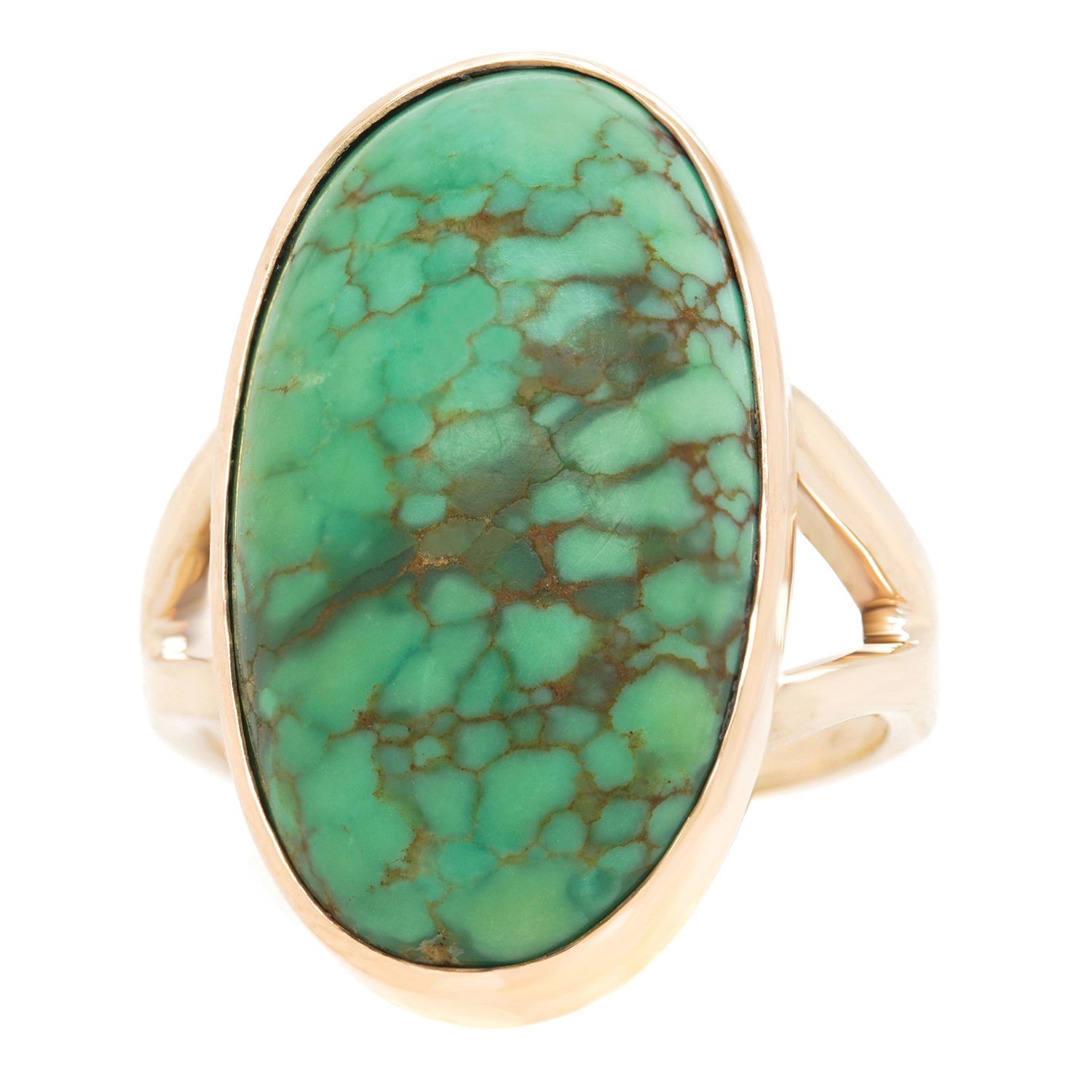 Circa 1960s, 14k, American. This ring is a colorful example of a genre of jewelry that is entirely American. Self-taught hippie goldsmiths from the village in New York to beach communities in California were fearlessly making whatever they could imagine. In a world where everything was up for discussion, women were speaking their minds with bold new styles and colors, rings like this one were part of that conversation. The turquoise is a delicate green with a distinctive matrix that compliments the simple organic form. Beautifully made with a solid feel on the hand, it is in excellent condition.