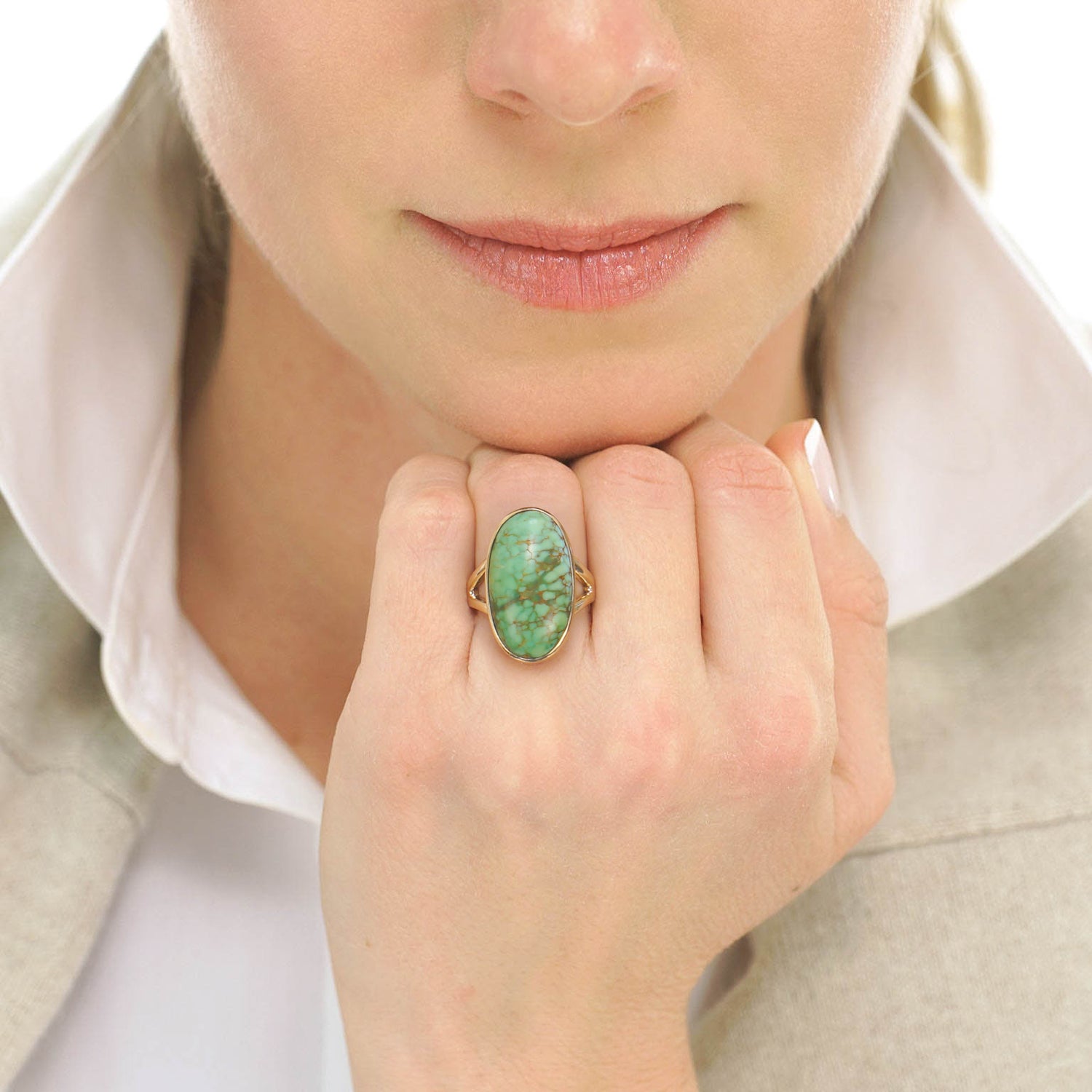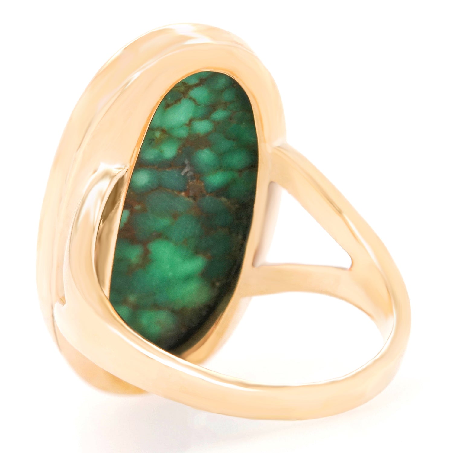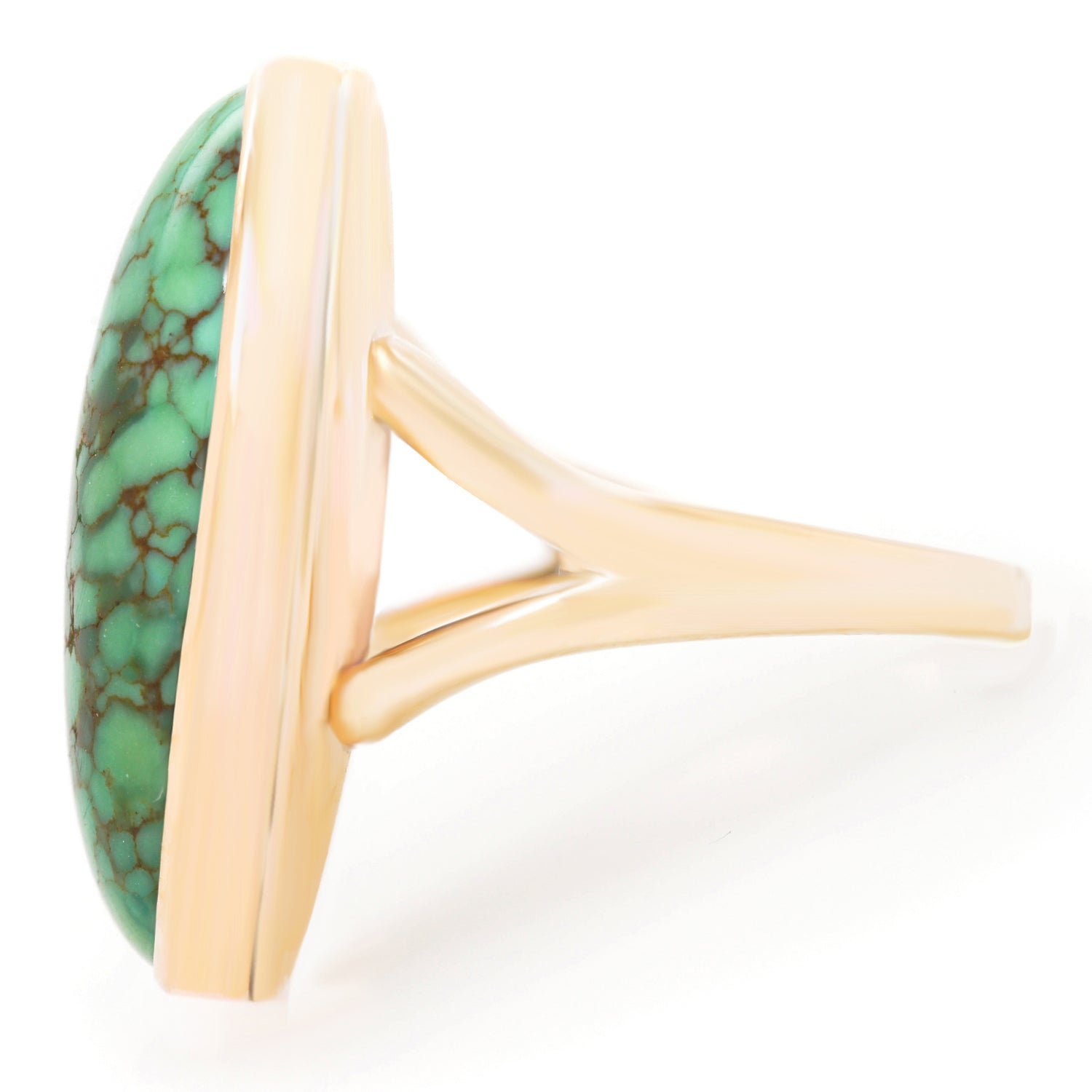 Circa 1960s, 14k, American. This ring is a colorful example of a genre of jewelry that is entirely American. Self-taught hippie goldsmiths from the village in New York to beach communities in California were fearlessly making whatever they could imagine. In a world where everything was up for discussion, women were speaking their minds with bold new styles and colors, rings like this one were part of that conversation. The turquoise is a delicate green with a distinctive matrix that compliments the simple organic form. Beautifully made with a solid feel on the hand, it is in excellent condition.
