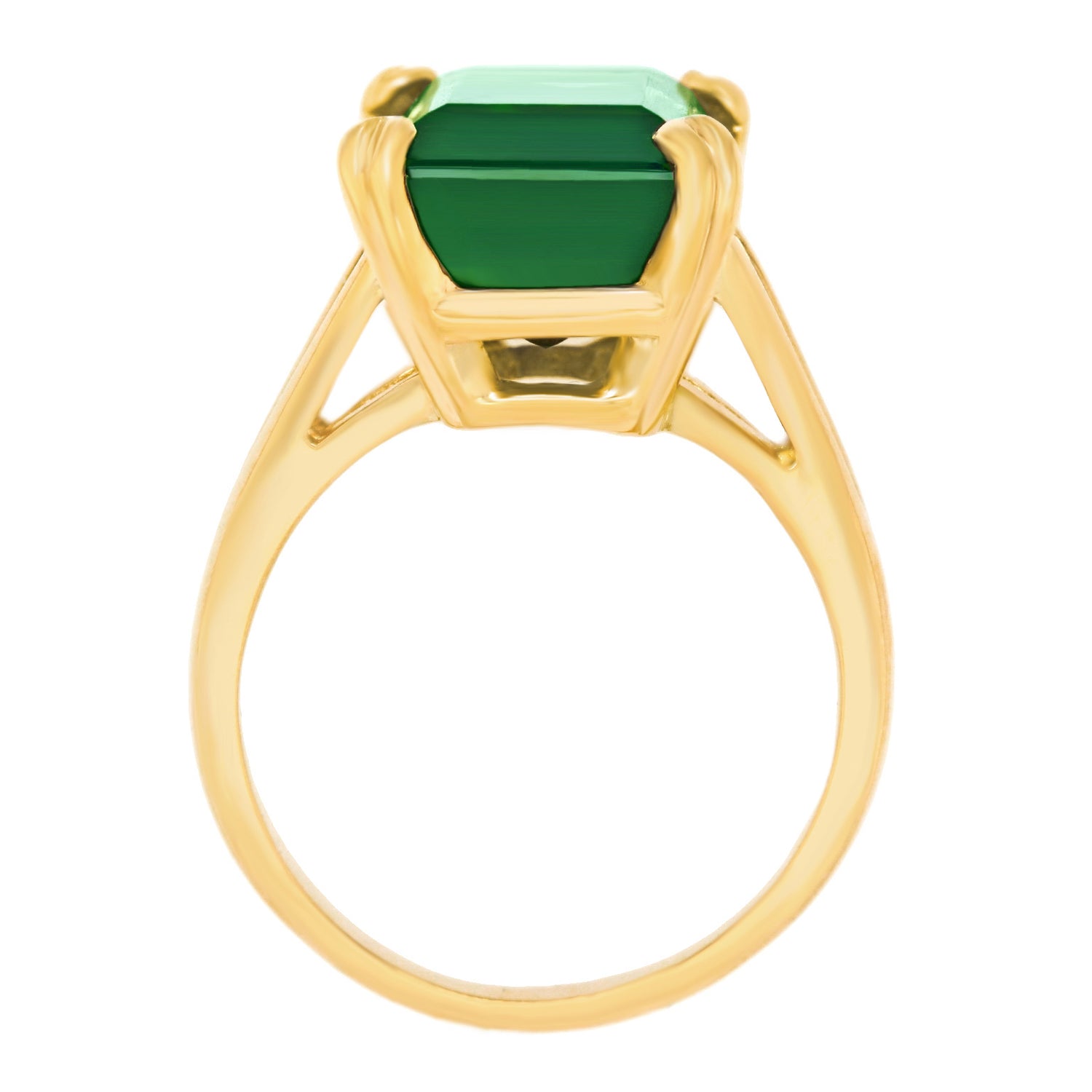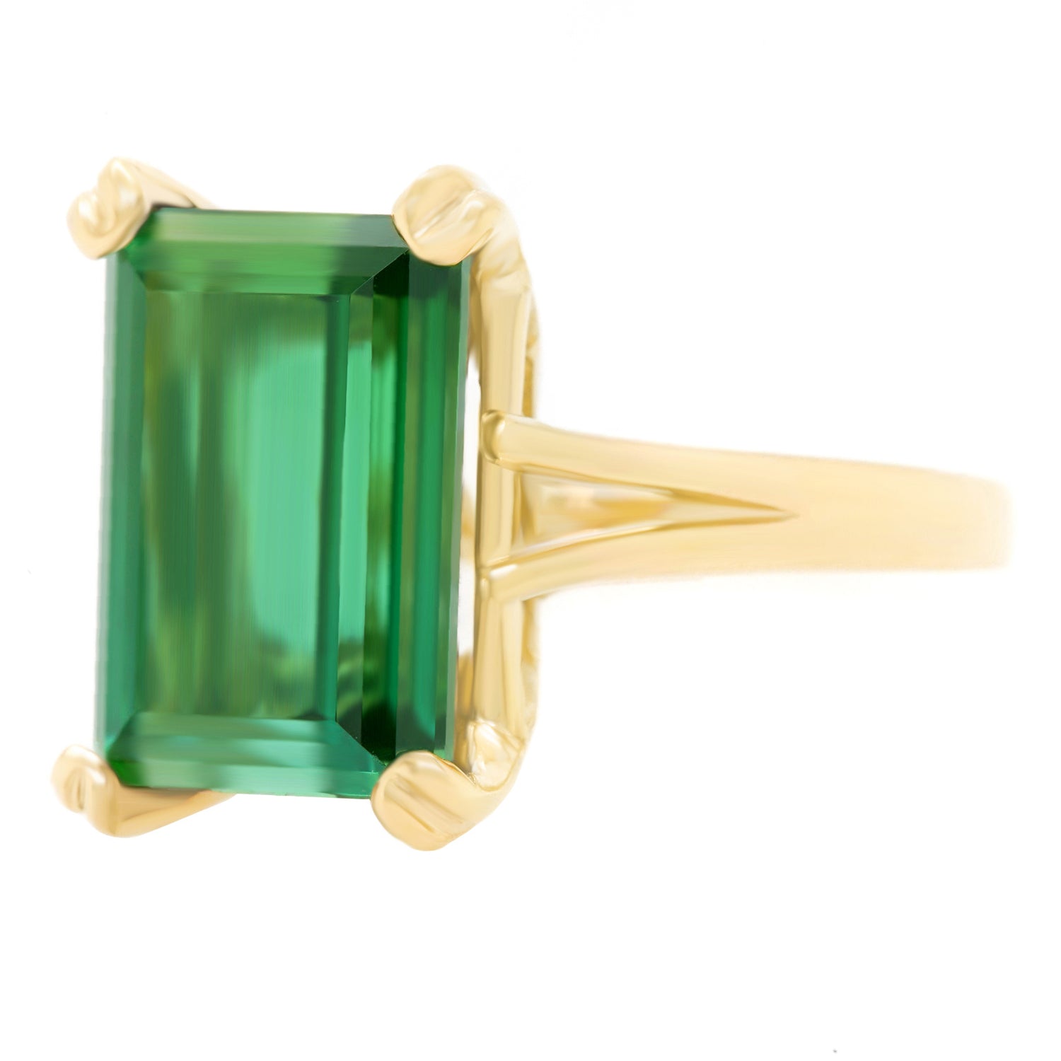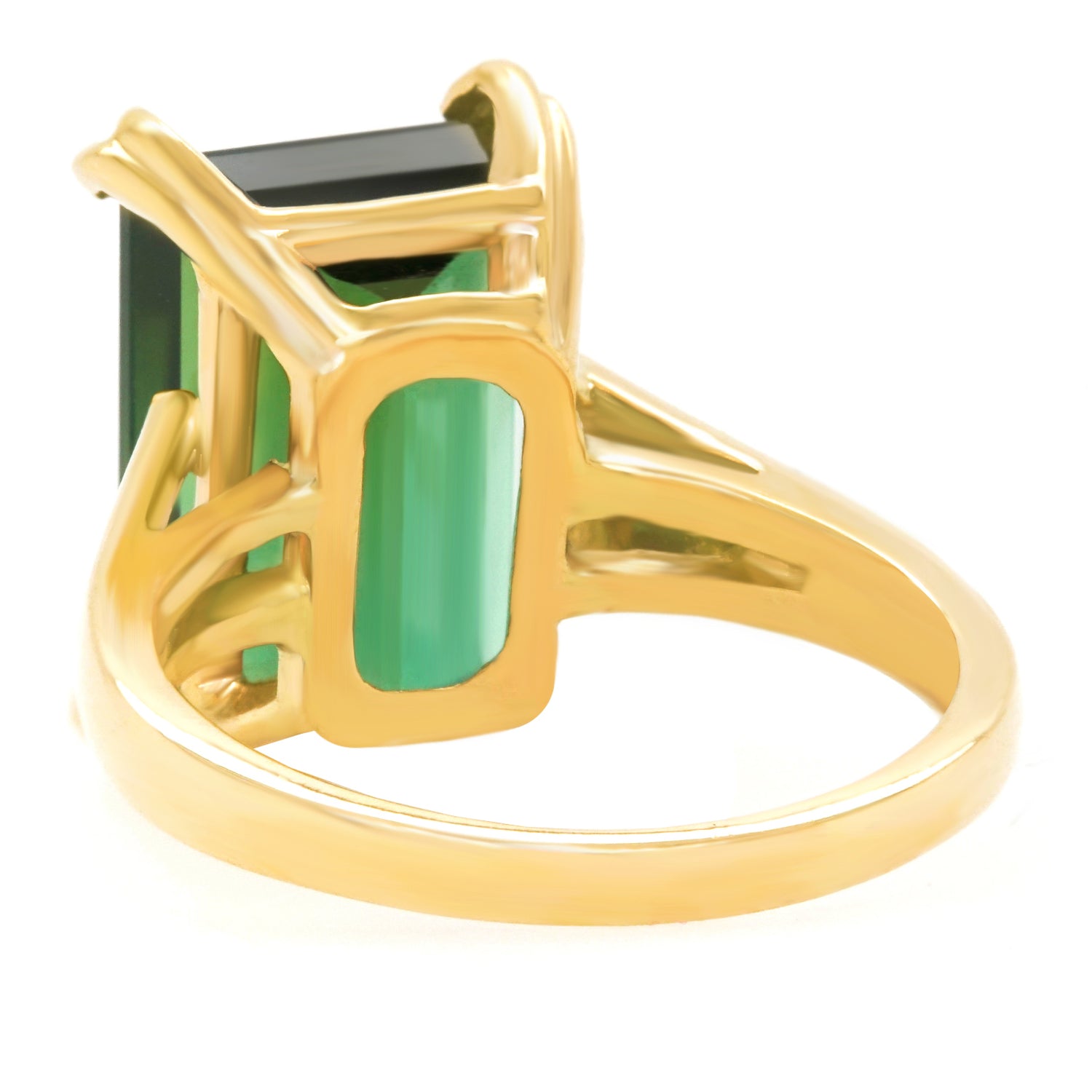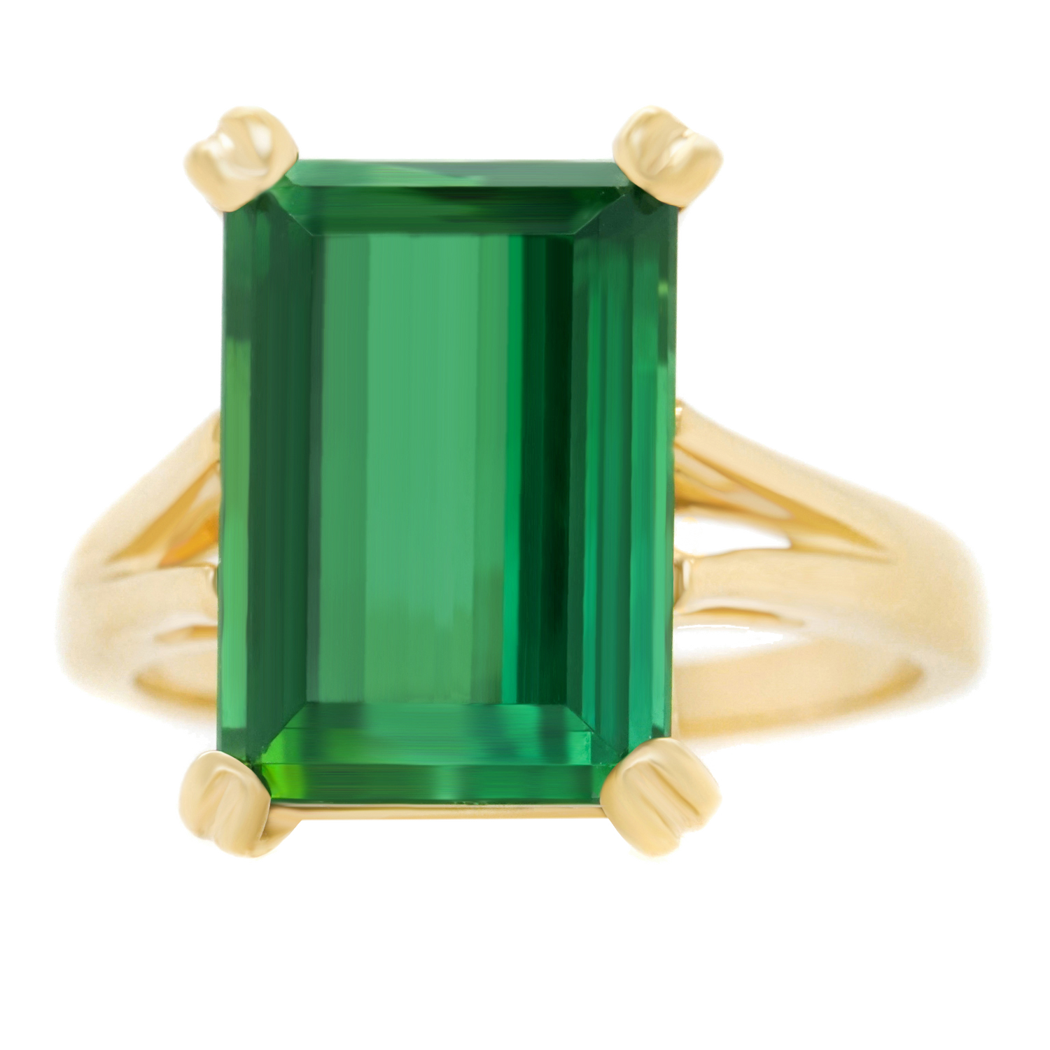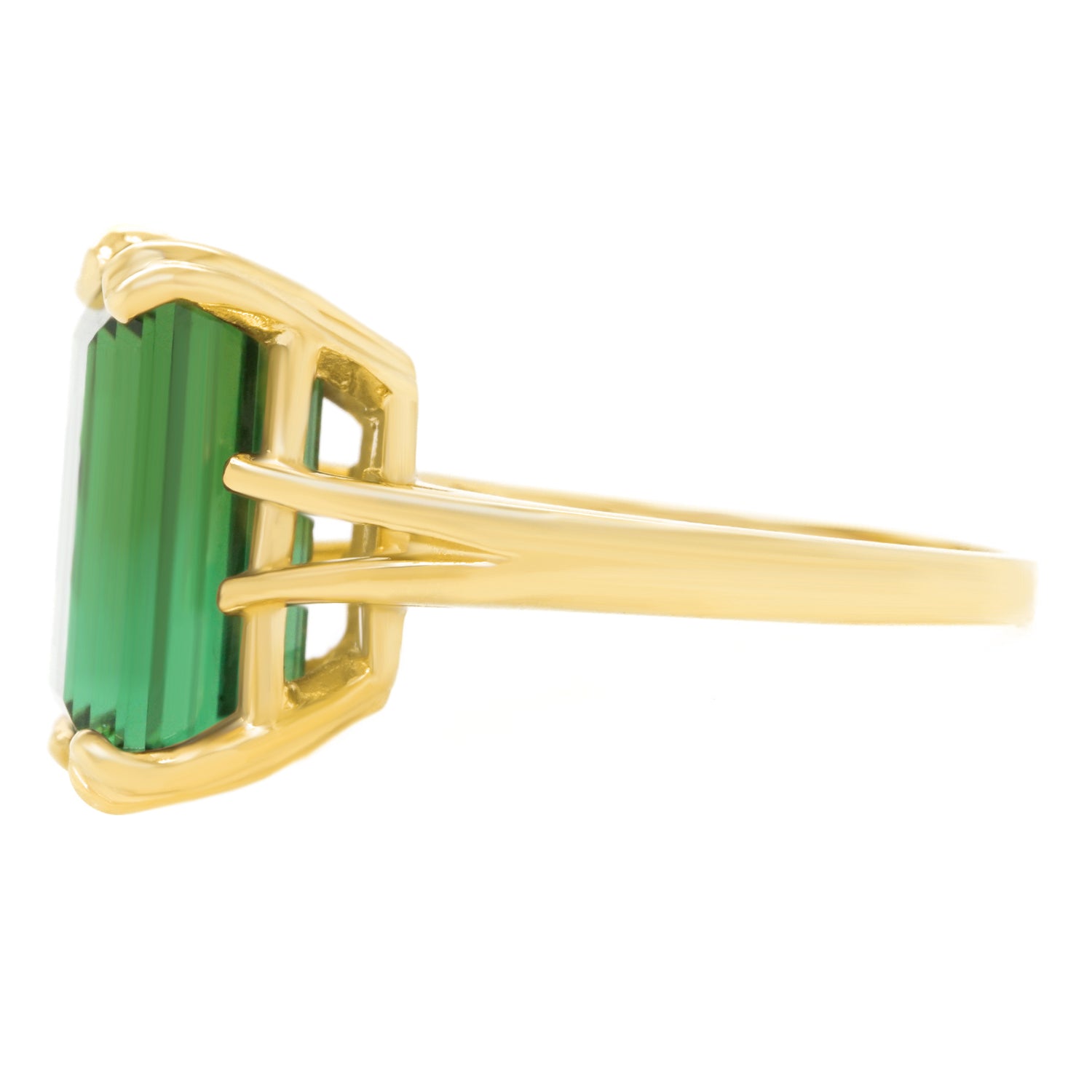 Circa 2021, 14k, American. Redolent of sixties Retro, this timeless American jewel features an intense green 9.06-carat emerald-cut tourmaline. Finely made in 14k yellow gold, this ring is in excellent condition.