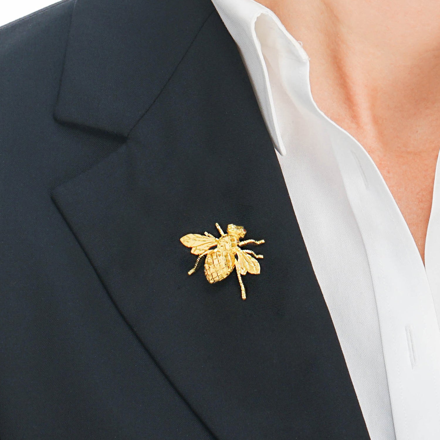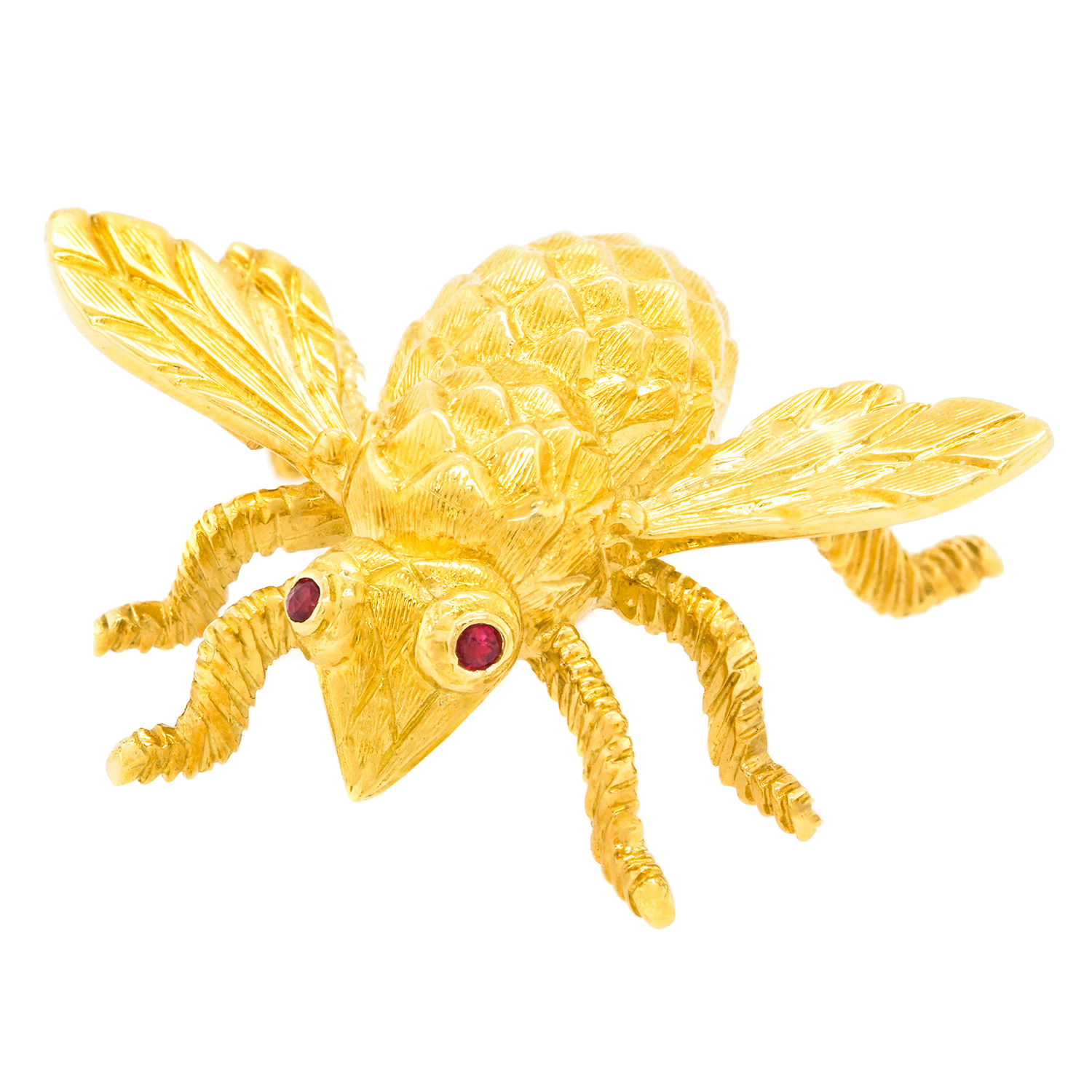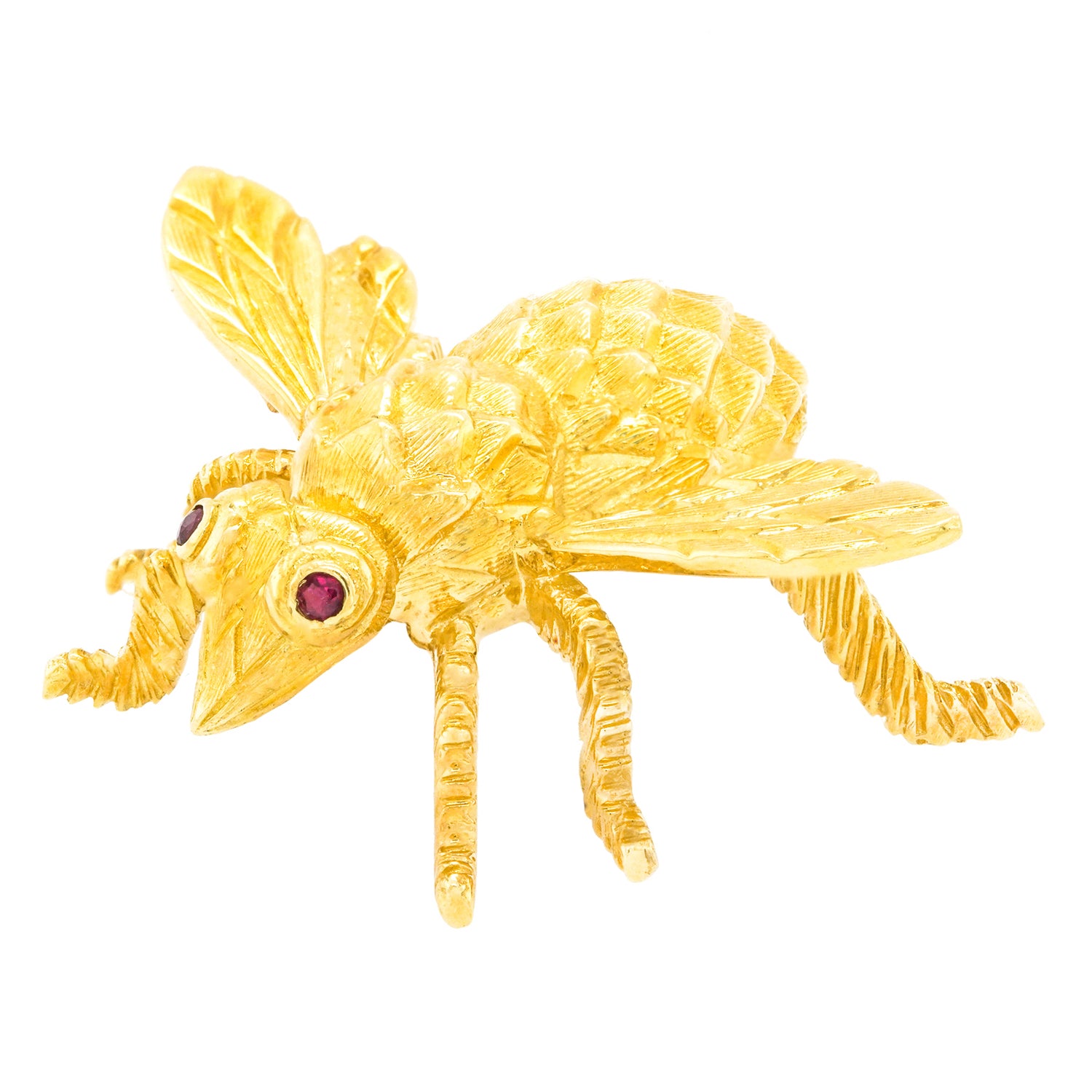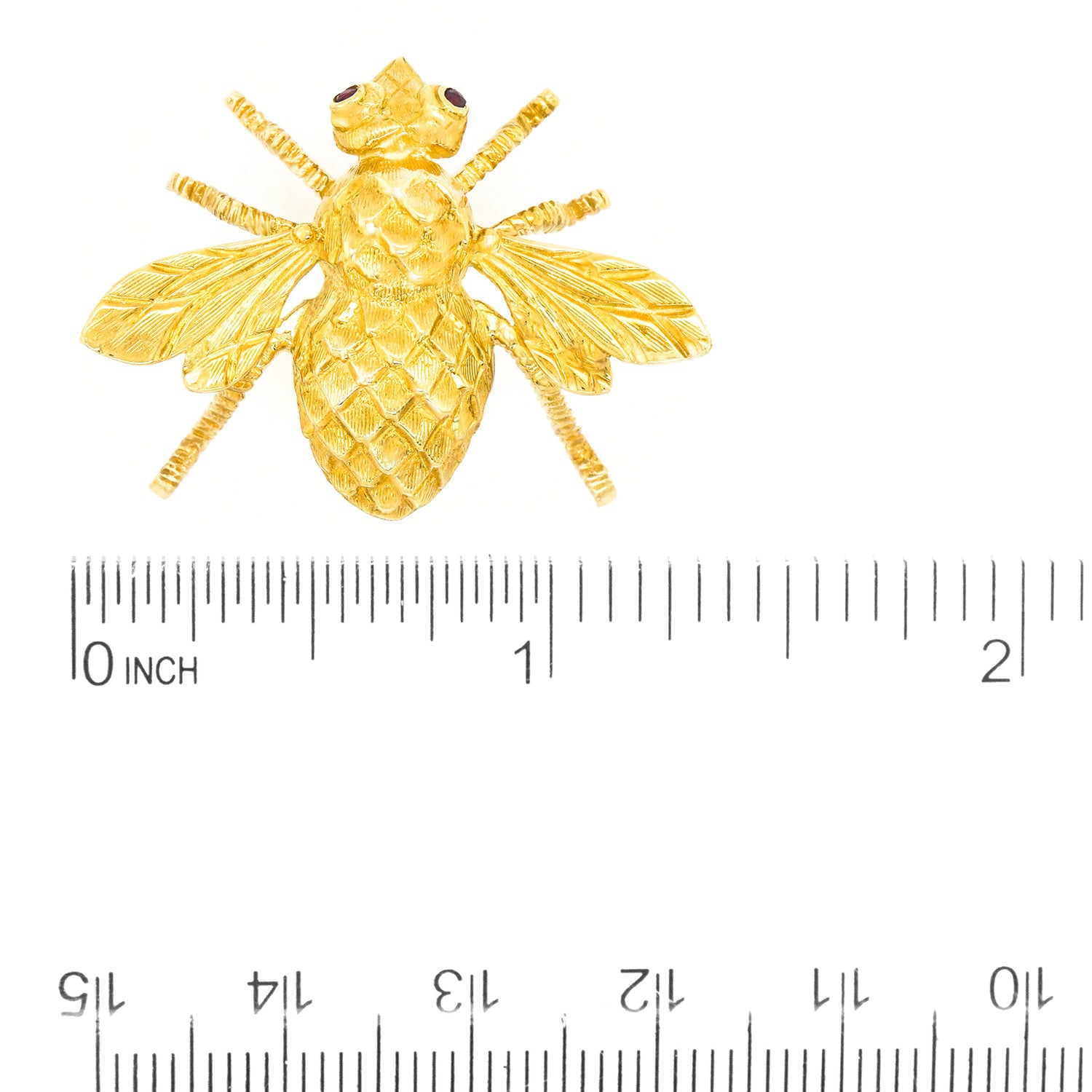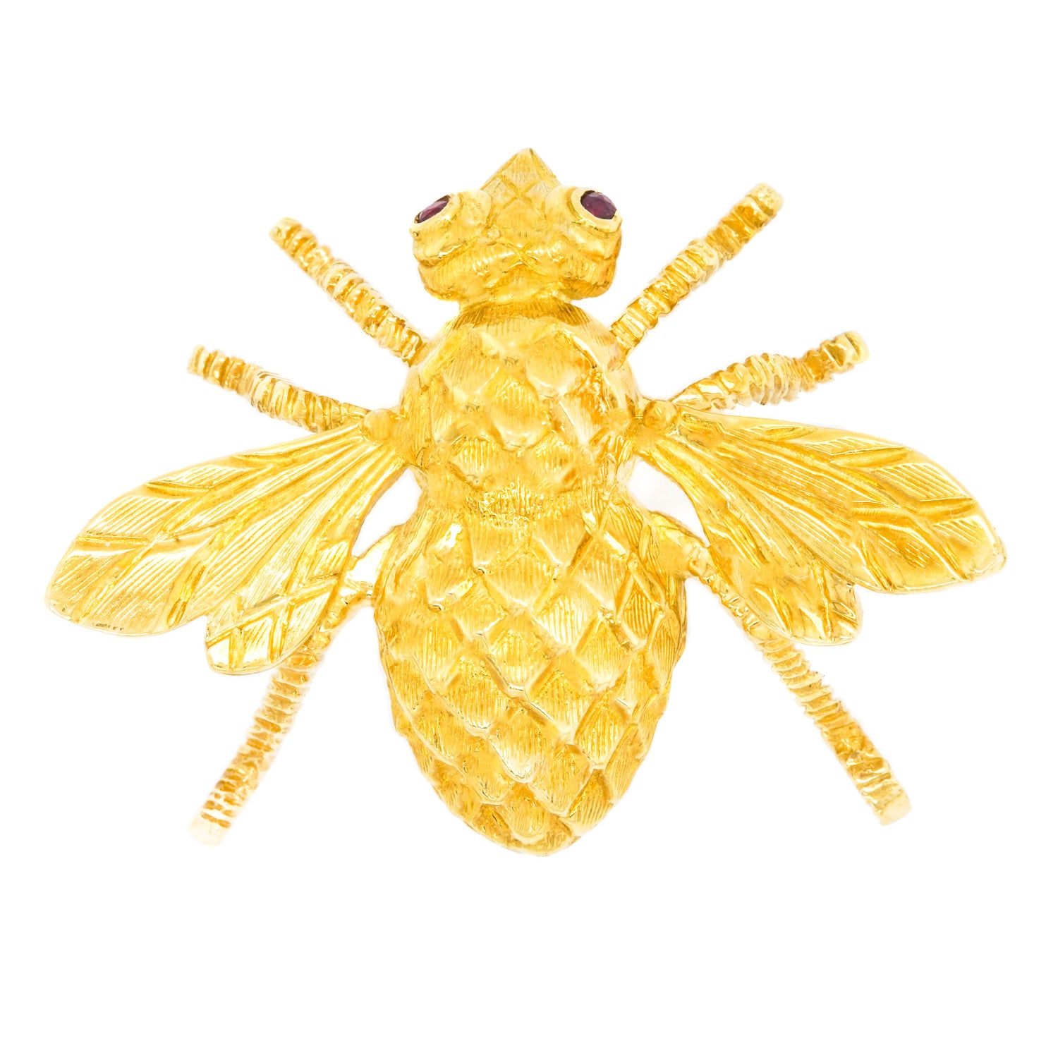 Circa 1970s, 18k, by Herbert Rosenthal for Tiffany & Co., American. This charming bee pin by Herbert Rosenthal was made in 18k yellow gold accented by ruby eyes. Rosenthal Bees are the chic culmination of a centuries-long fascination with insect jewelry. Their exquisite design is underscored by meticulous fabrication. Gold-only bees are uncommon. Excellent condition.