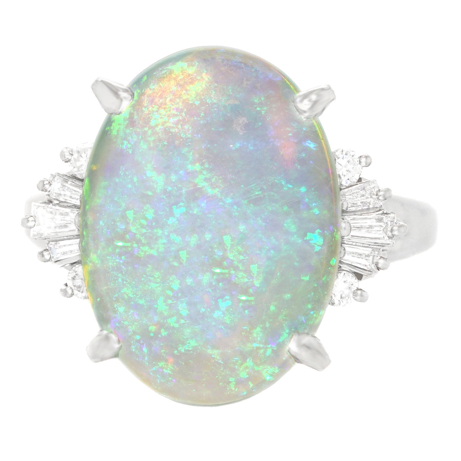 Circa 1950s, Platinum, American. The fine 5.0-carat opal in this gorgeous platinum fifties ring is accented by .21 carats of brilliant white diamonds. Displaying green, yellow, blue, purple, and some red-orange in varying hues, this stone has excellent fire, scintillation, and movement of light. The look is lush and timeless. Meticulously handmade, it is in excellent condition.