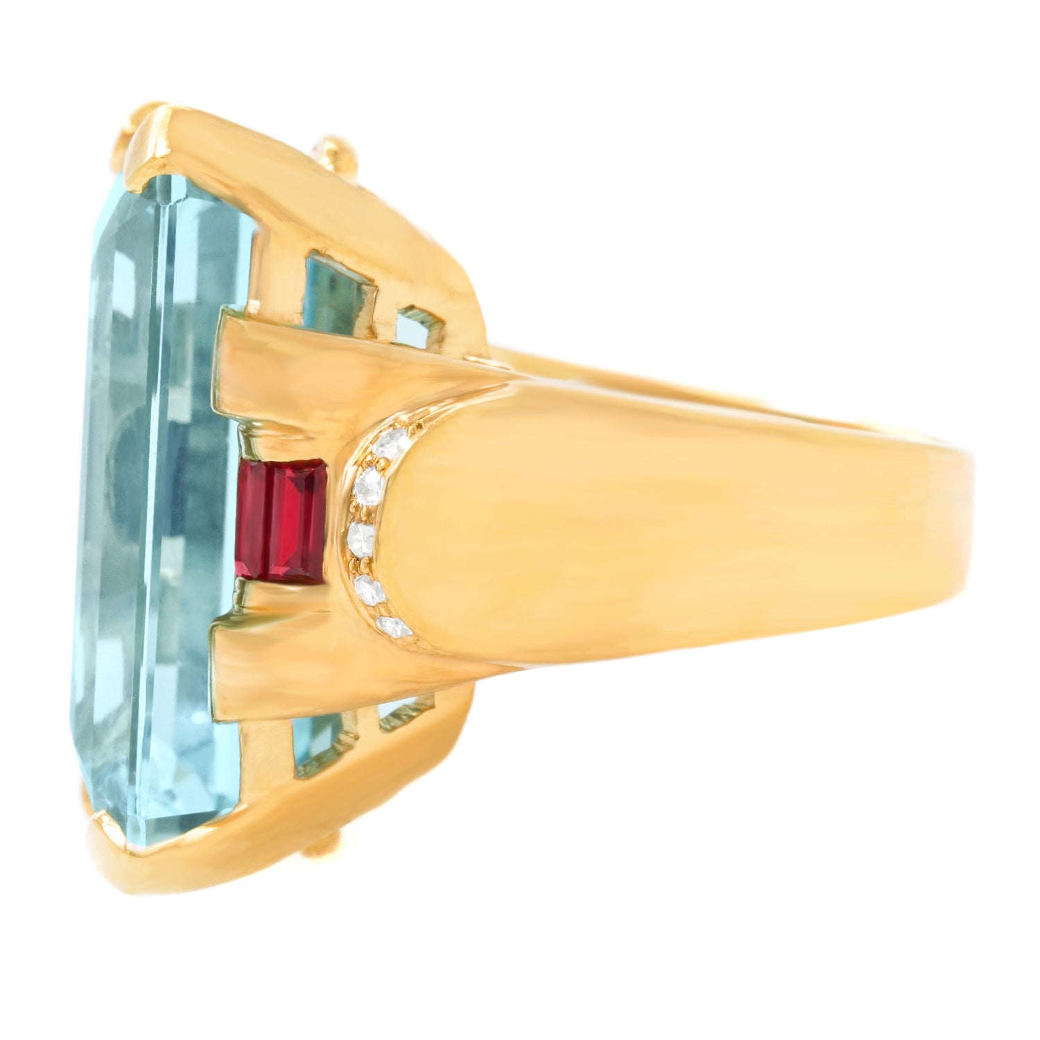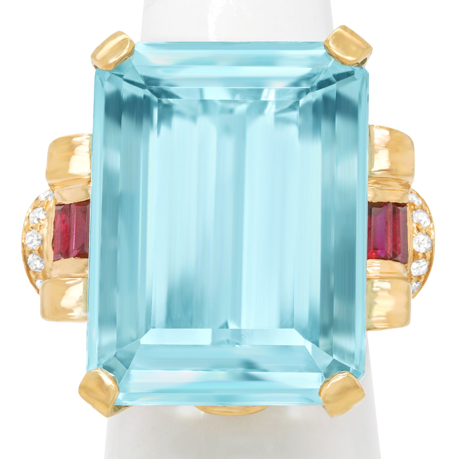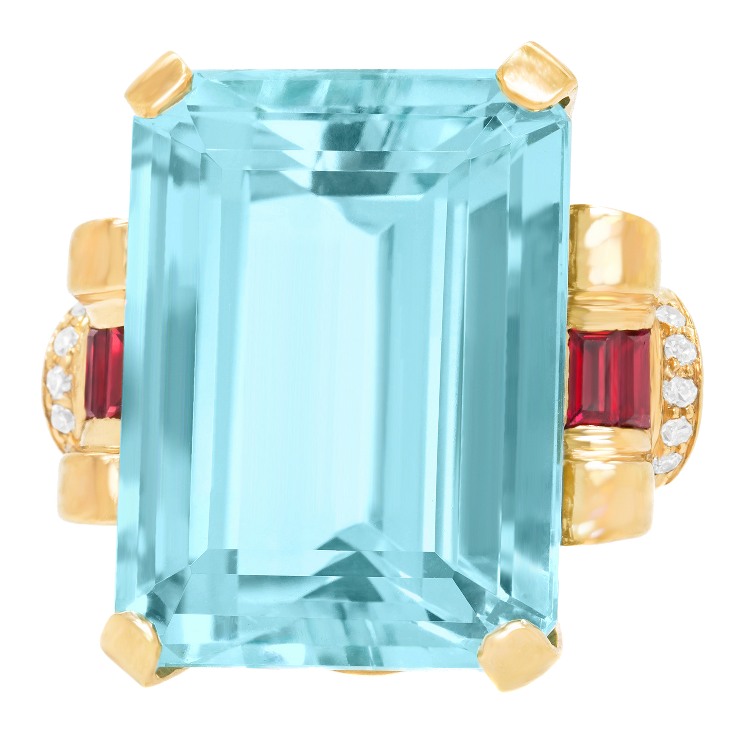 Circa 1940s, 14k, American. This classic Retro ring features a superb 40.50-carat aquamarine accented by .70 carats of fine rubies. The look is confidently American, colorfully Retro, and glamorously chic. This ring is outsized jewelry fashion at its big and bold best! Finely fabricated, it is well-balanced and comfortable to wear. Excellent condition.