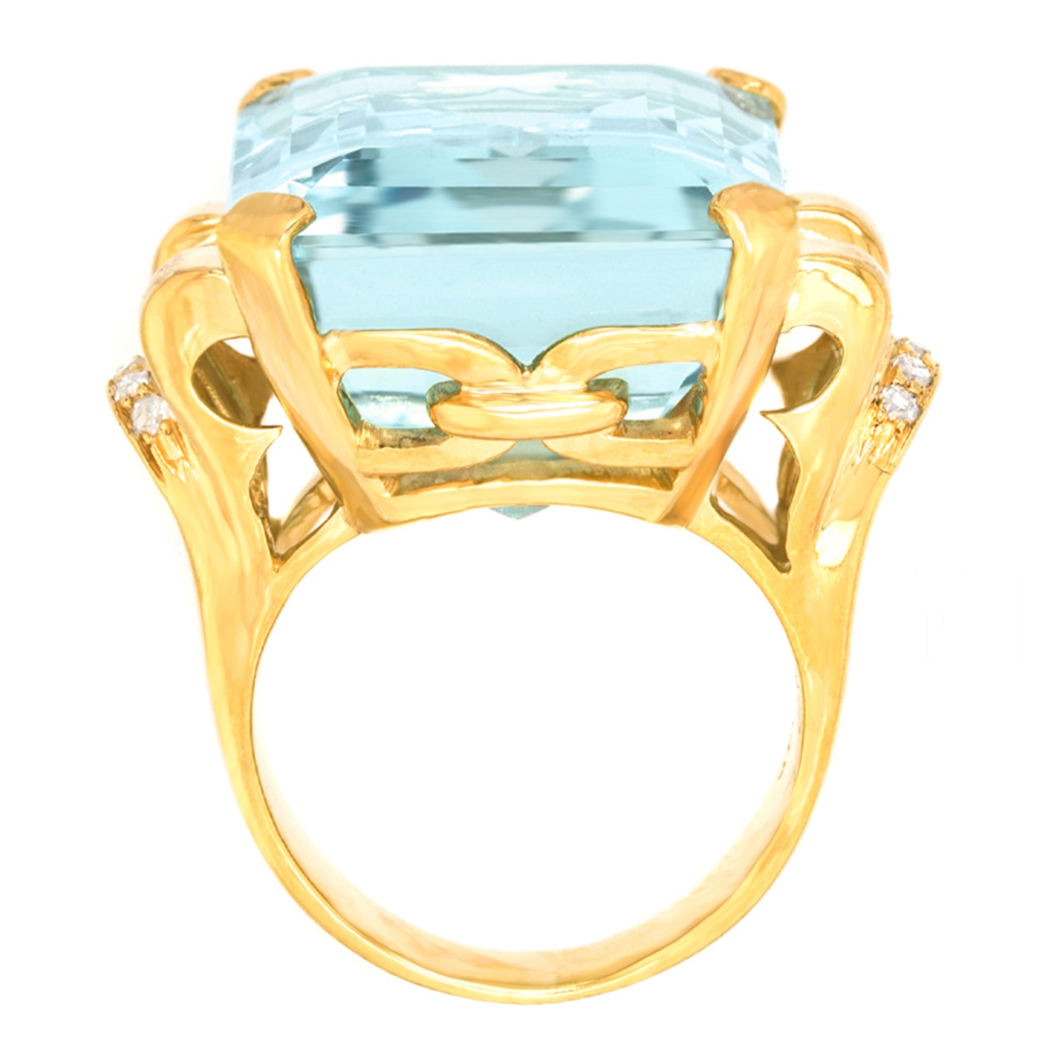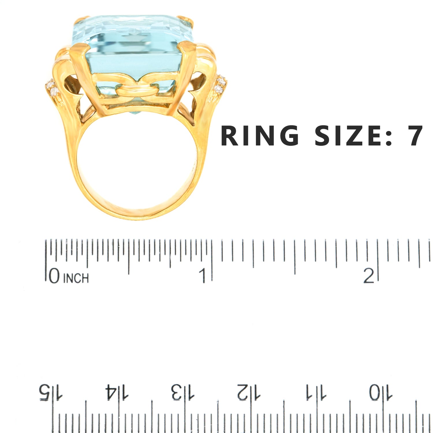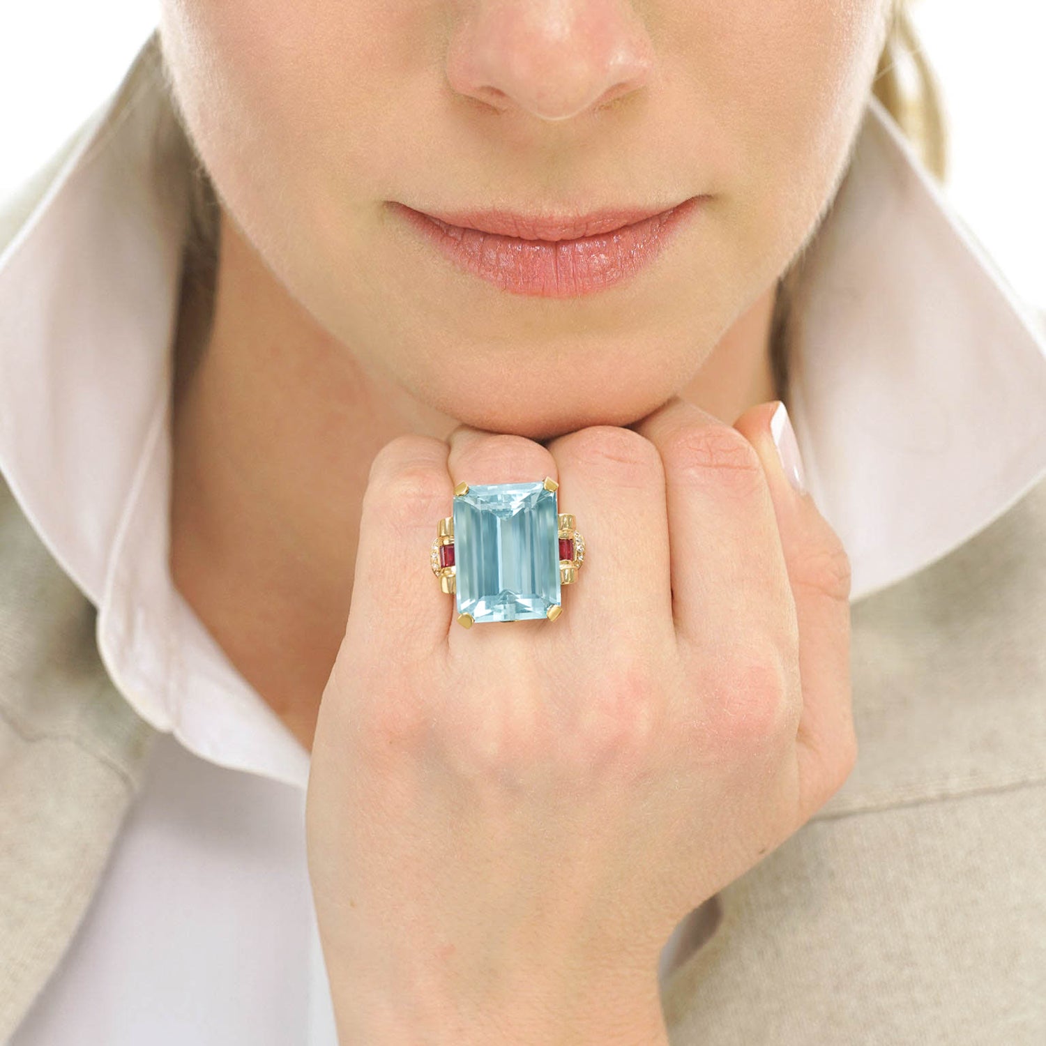 Circa 1940s, 14k, American. This classic Retro ring features a superb 40.50-carat aquamarine accented by .70 carats of fine rubies. The look is confidently American, colorfully Retro, and glamorously chic. This ring is outsized jewelry fashion at its big and bold best! Finely fabricated, it is well-balanced and comfortable to wear. Excellent condition.