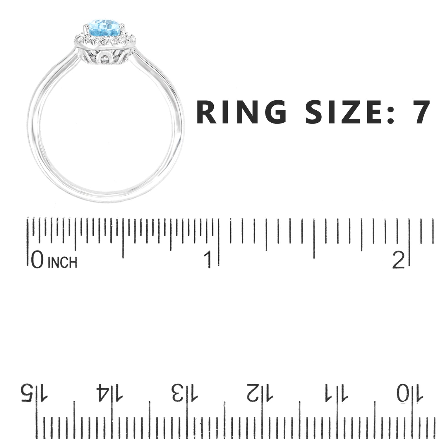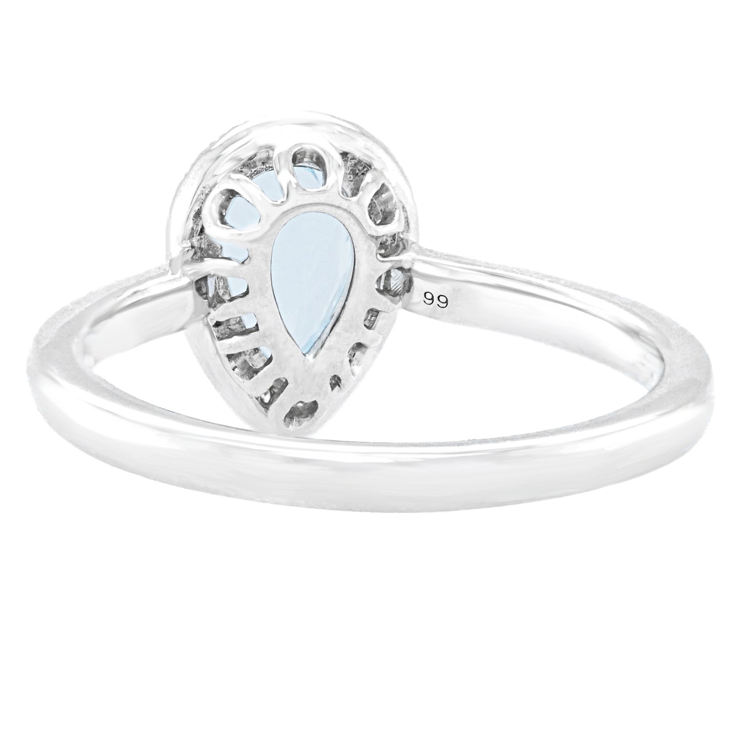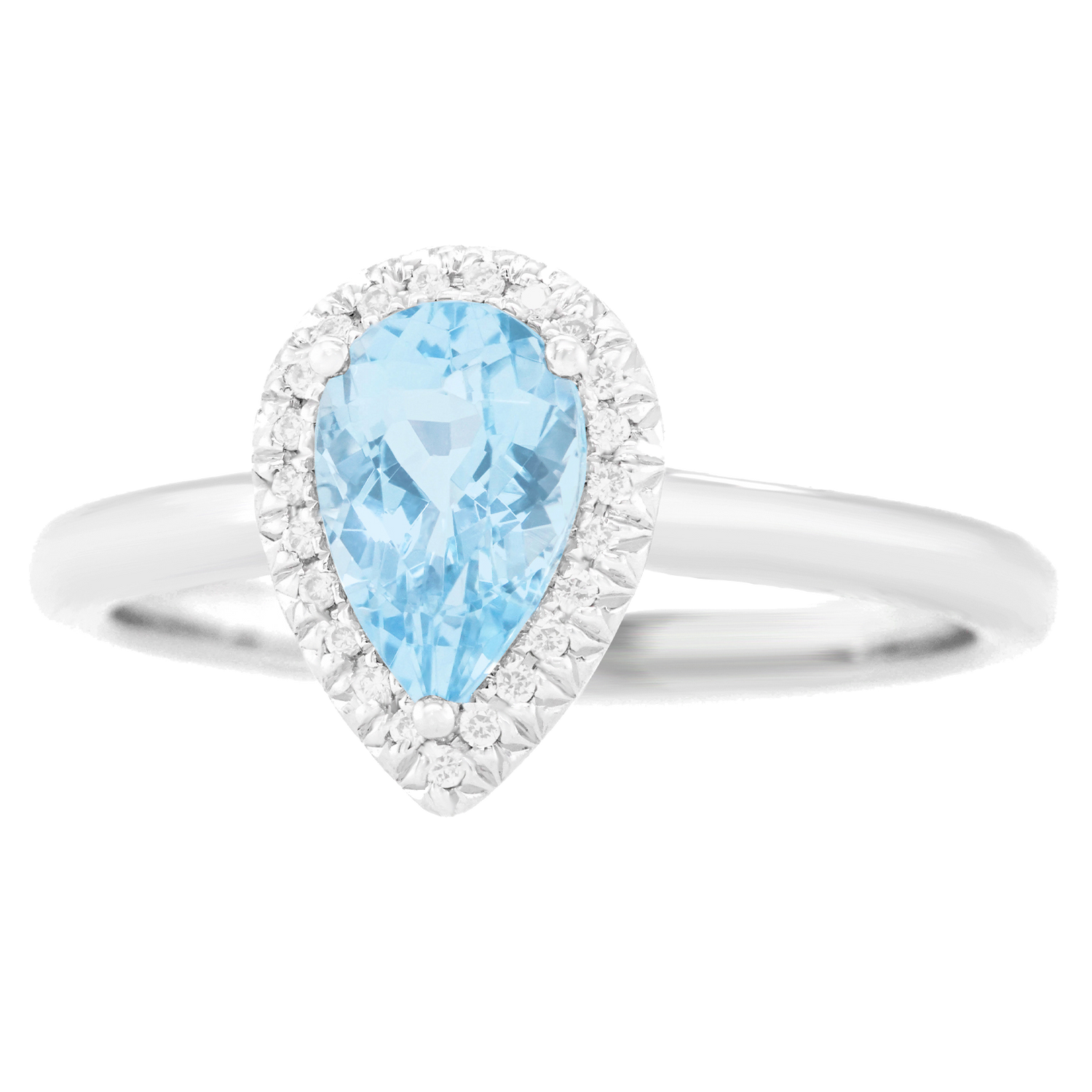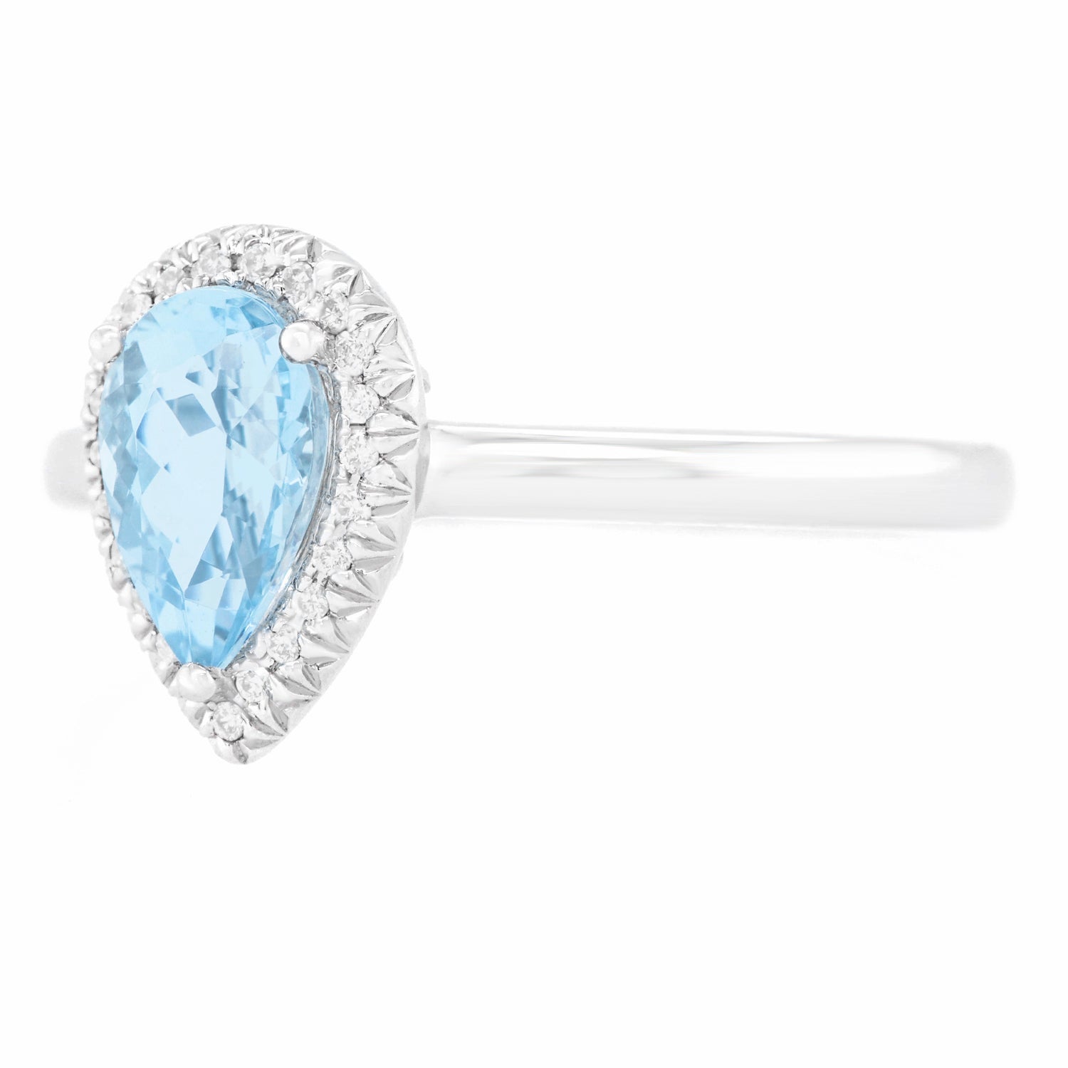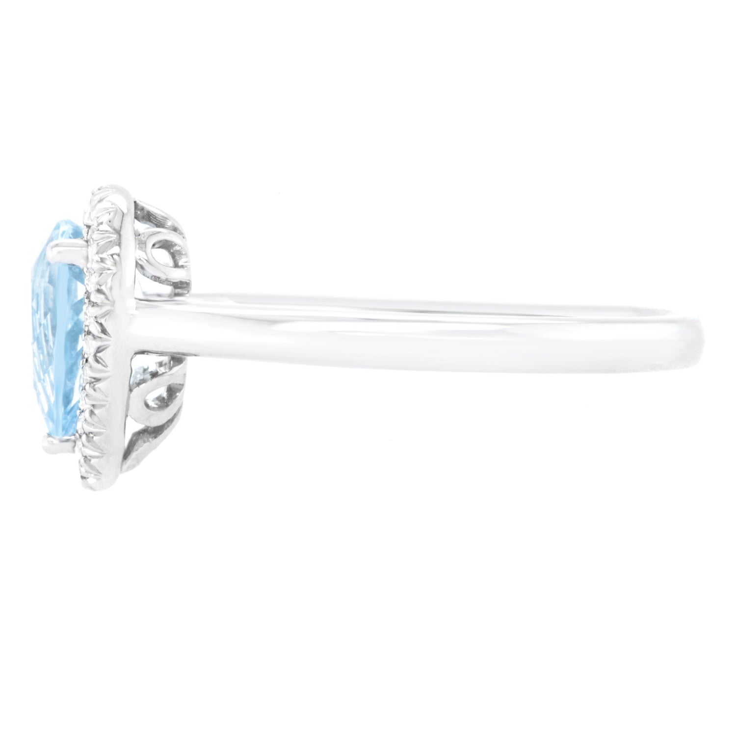 Circa 2000, 14k, American. This classic with a twist ring is set with a lovely 1.0-carat pear-shaped aquamarine framed by .06 carats of brilliant white diamonds. The look is classic meets contemporary, effortlessly going from flats and jeans to cocktail dresses. Fine fabrication in 14k white gold completes the glamorous look. Excellent condition.
