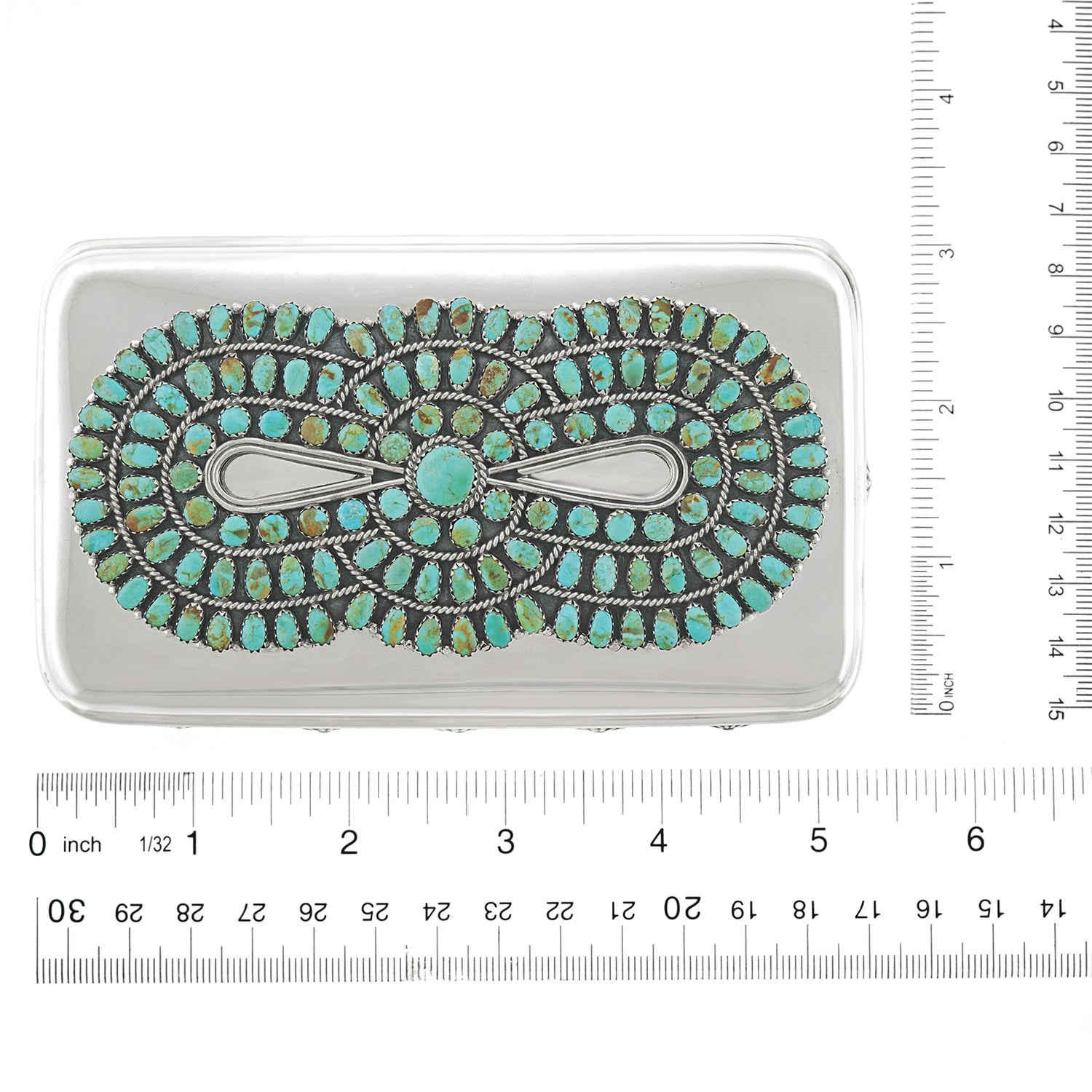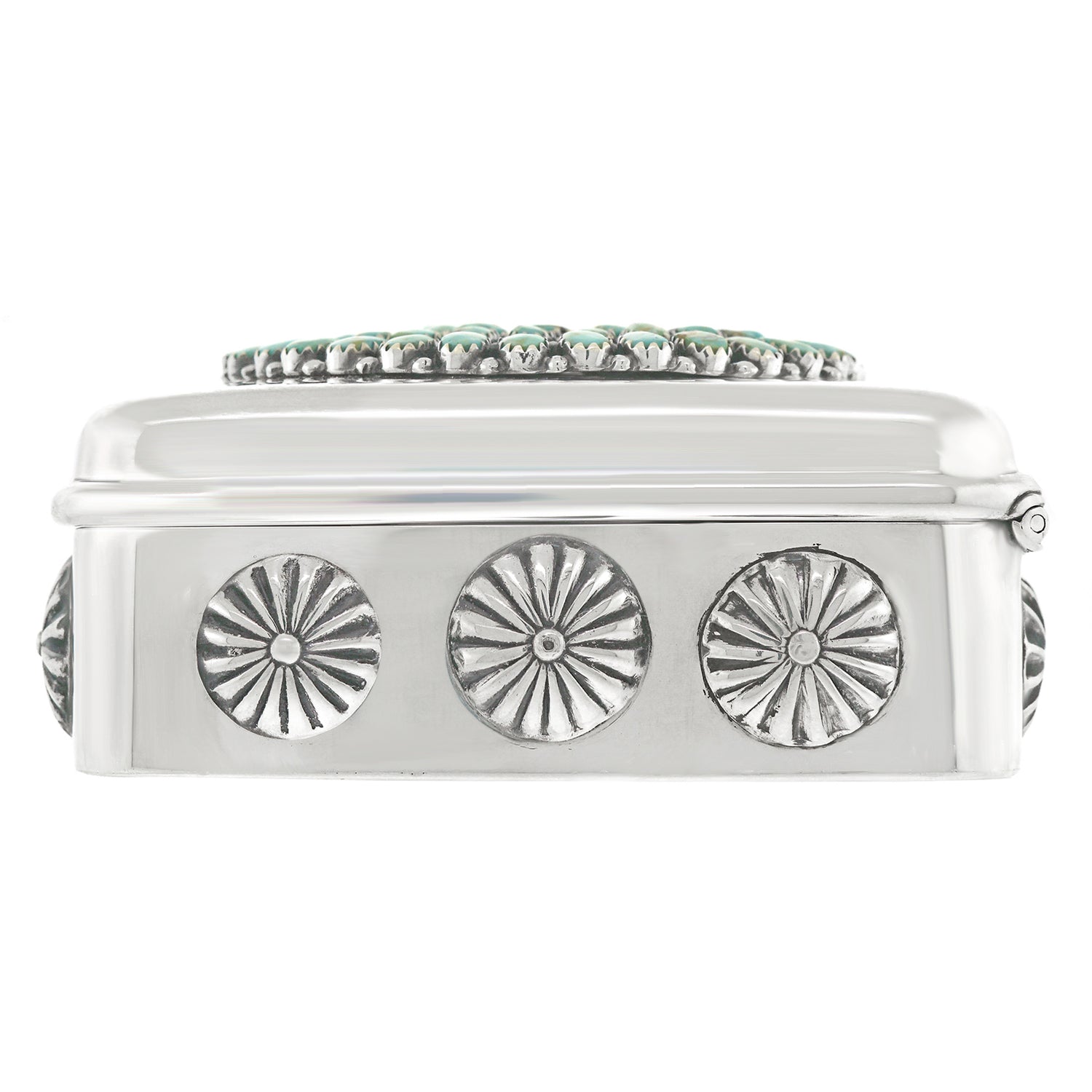 Circa 1920s, Navajo pin and buttons, Tiffany sterling box, circa 1950s. Navajo pin and buttons added by Lawrence Jeffrey circa 2021, ALL American. We have decorated an understated Tiffany & Co sterling box with a magnificent Navajo brooch and rare matching early Navajo silver buttons. The look is bold and unabashedly American. Perfect for any décor, one-of-a-kind. Excellent condition.
