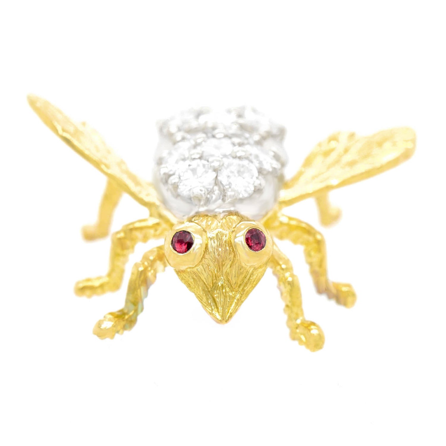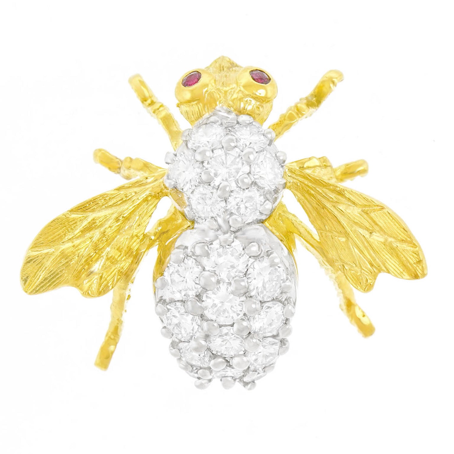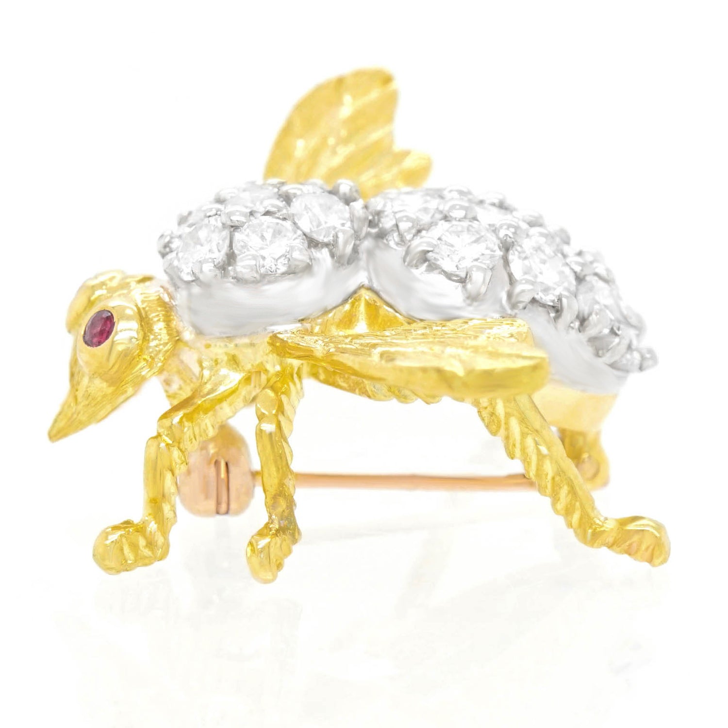 Circa 1970s, by Herbert Rosenthal, 18k, New York. This charming bee pin by Herbert Rosenthal is set with 2.50 carats of brilliant white diamonds (F color, VS clarity). Rosenthal bees are the chic culmination of a centuries-long fascination with insect jewelry. Their exquisite design is underscored by meticulous fabrication and sublime stones. Excellent condition.