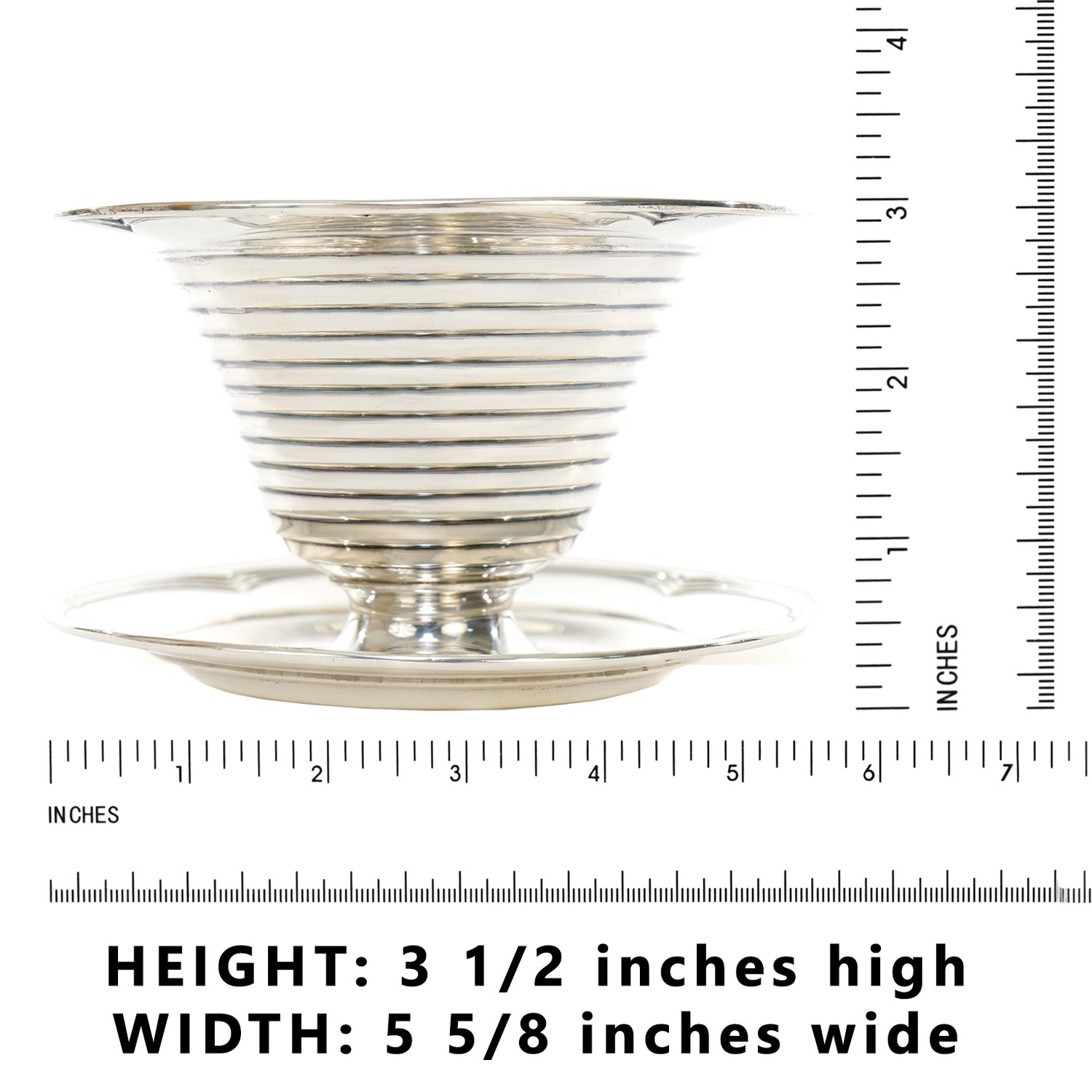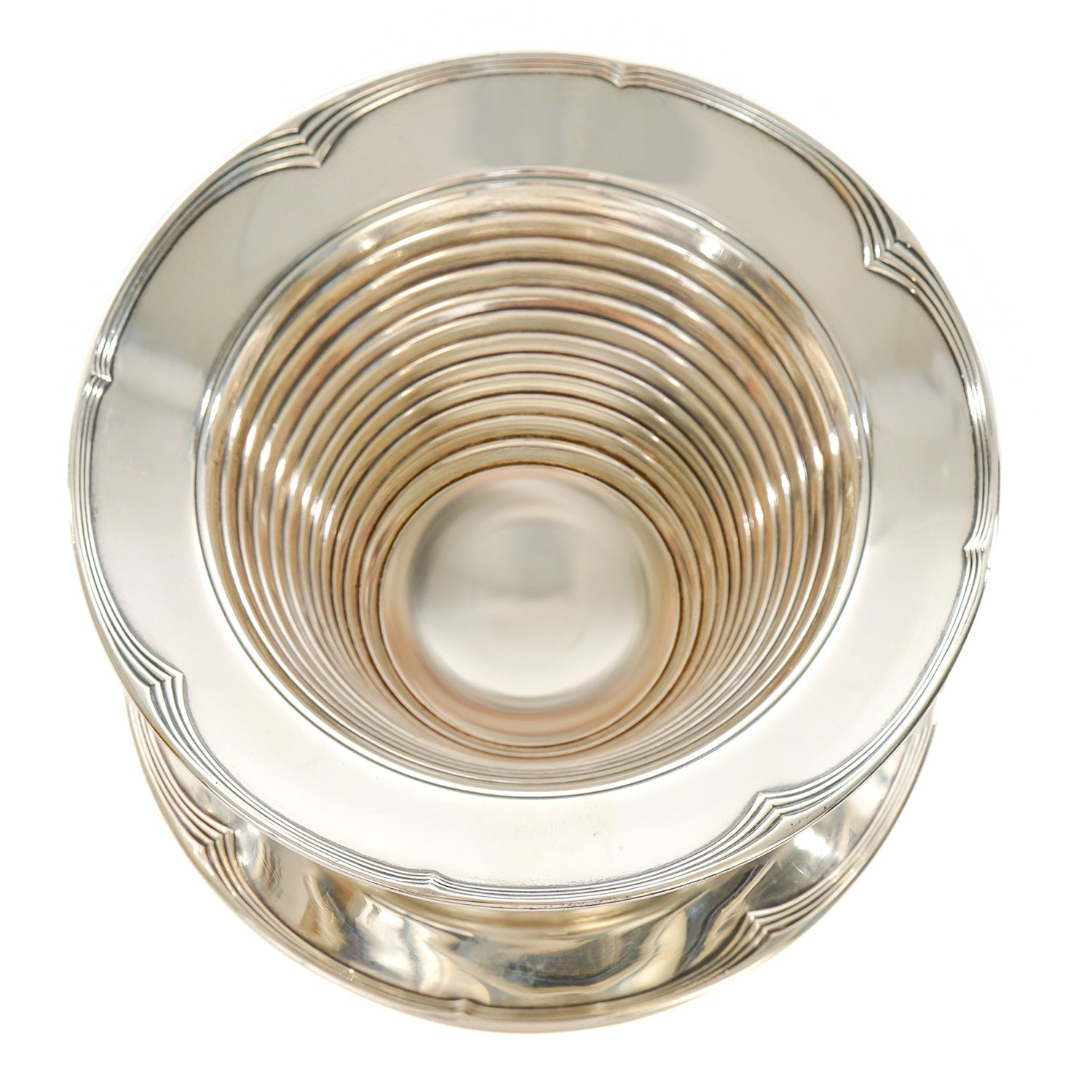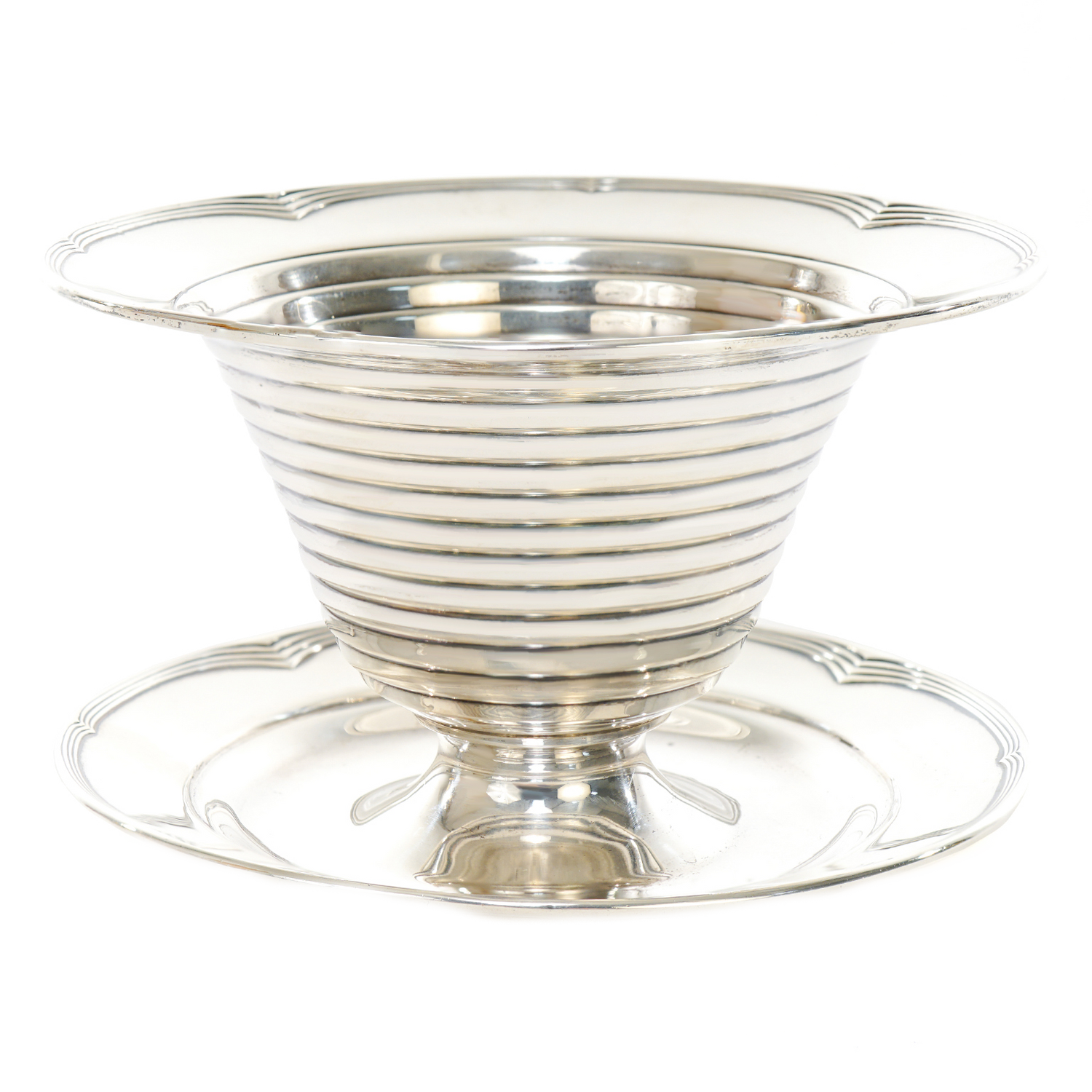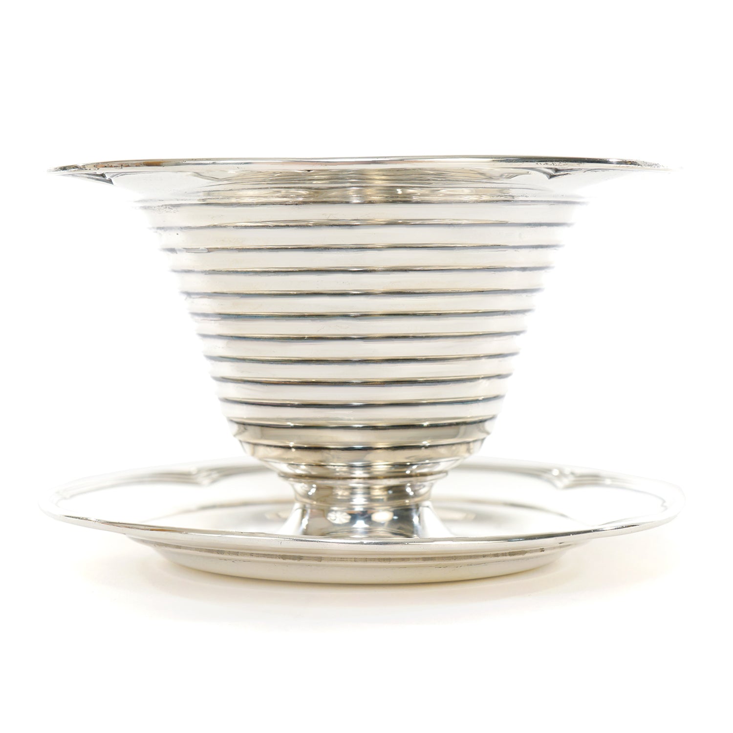 Circa 1928, Sterling, by Alfred Kintz for International Silver Co., Meriden, Connecticut. This sterling whipped cream bowl is American Art Deco at its very best. Introduced in 1928, the Ebb Tide pattern by International Silver is stunning, sophisticated, and rare. Most pieces are currently in museum collections, chief among them the renowned American Modernist Silver Collection of The Dallas Museum of Art which has an example of this piece. Perfect for your modern décor, this piece is in excellent condition.