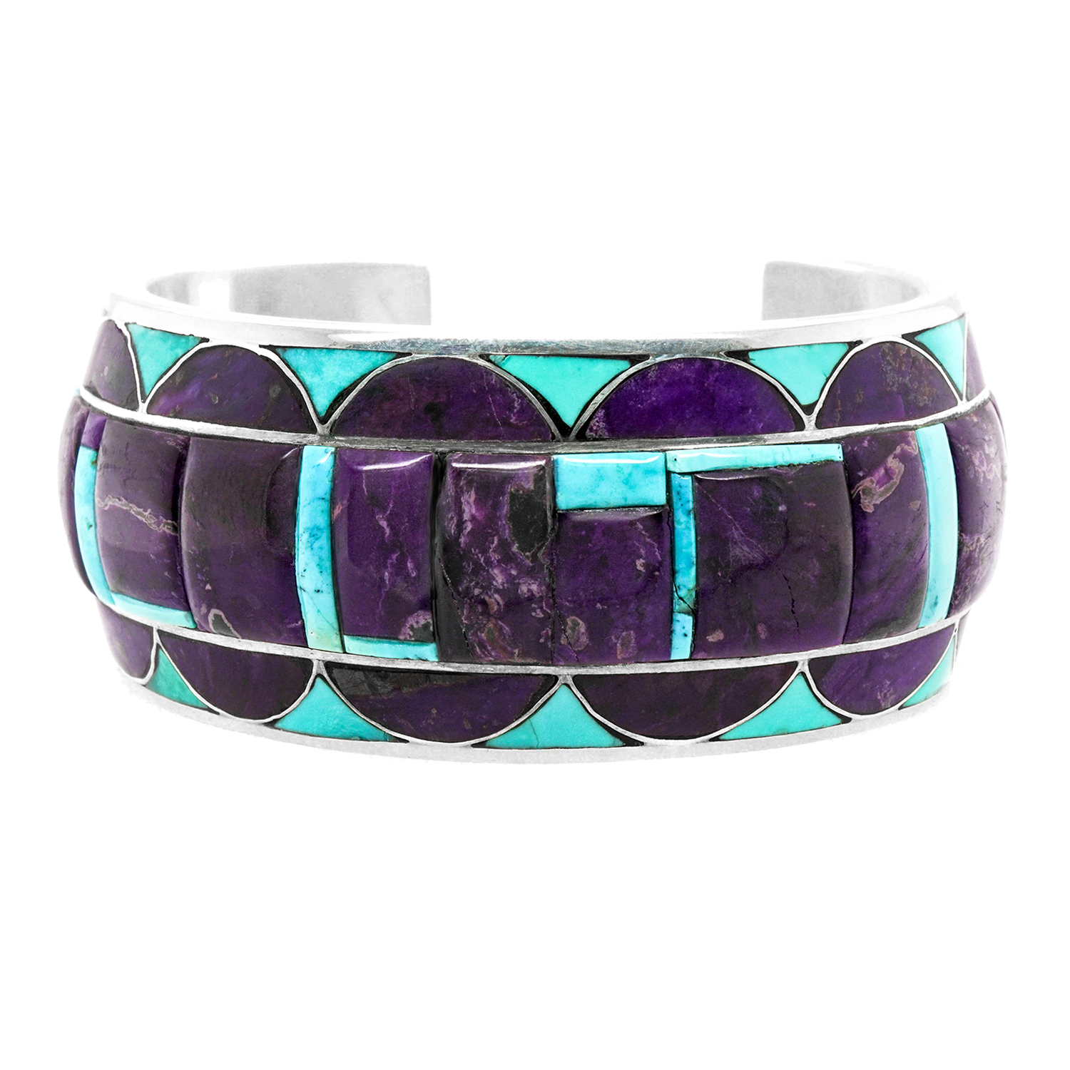 Circa 2000s, Sterling, by Danny Stewart, Navajo, American. This contemporary bracelet by Danny Stewart has it all. The wonderful, brilliantly-colored turquoise and sugilite are paired in a three-dimensional retro-seventies motif. The look is straight-up catwalk.