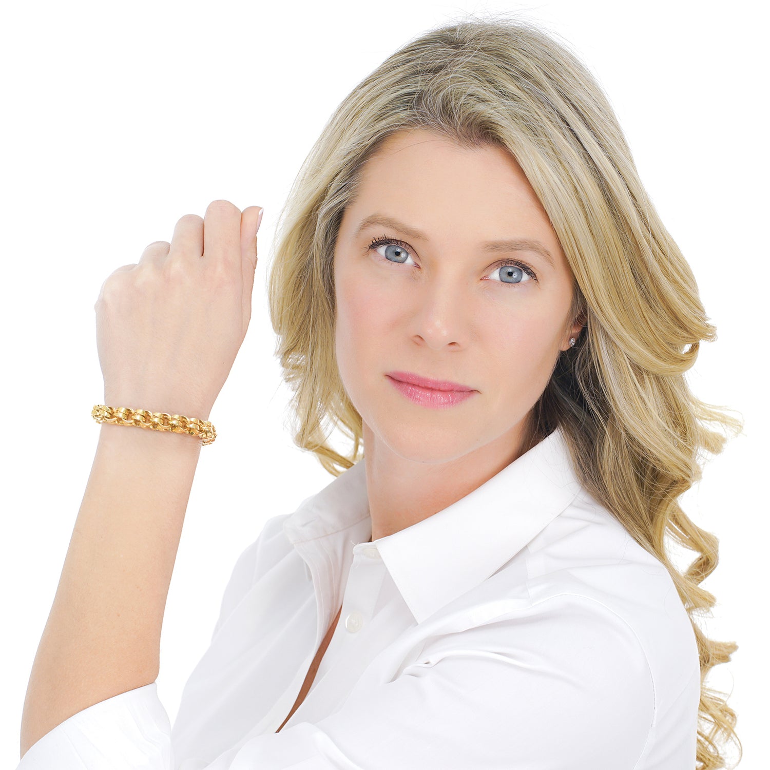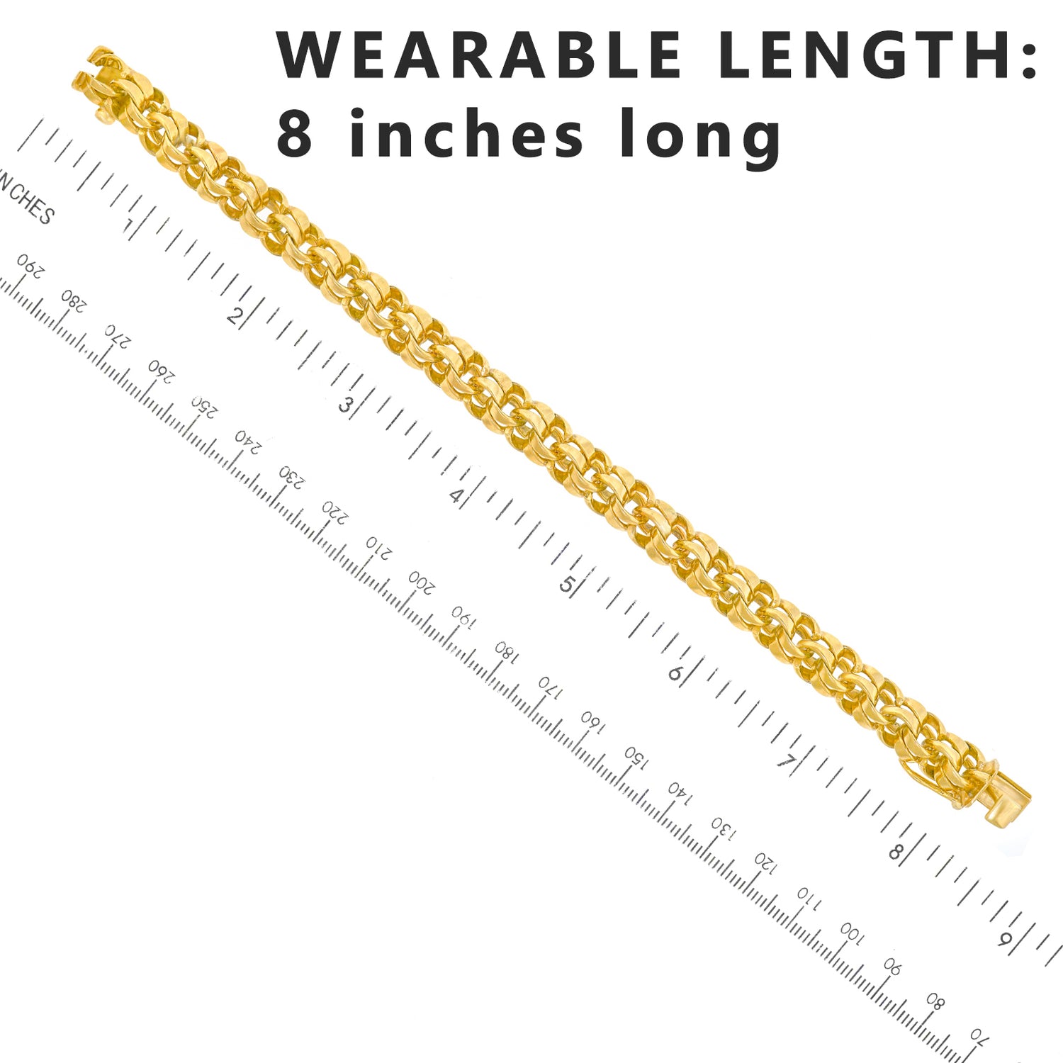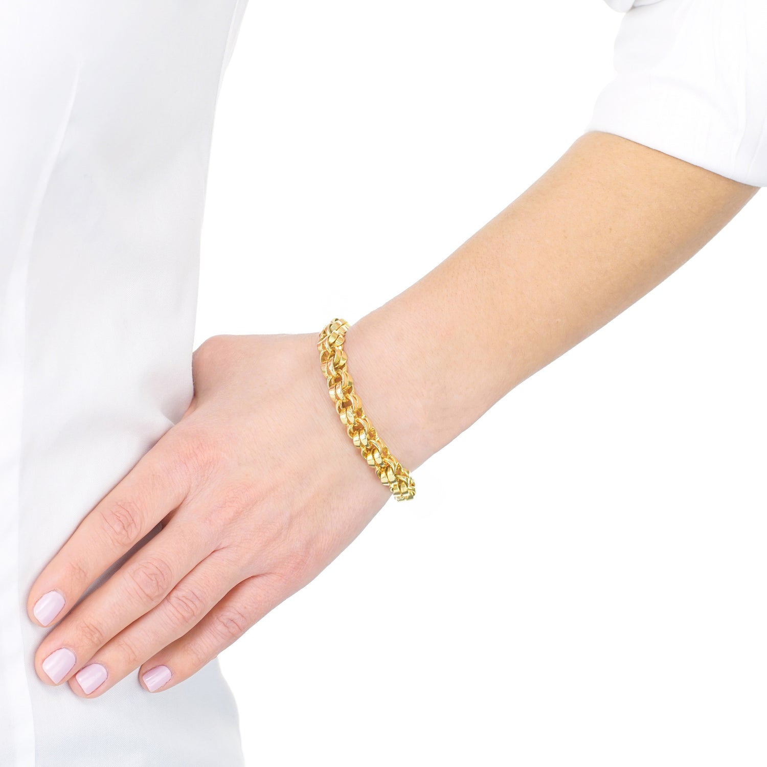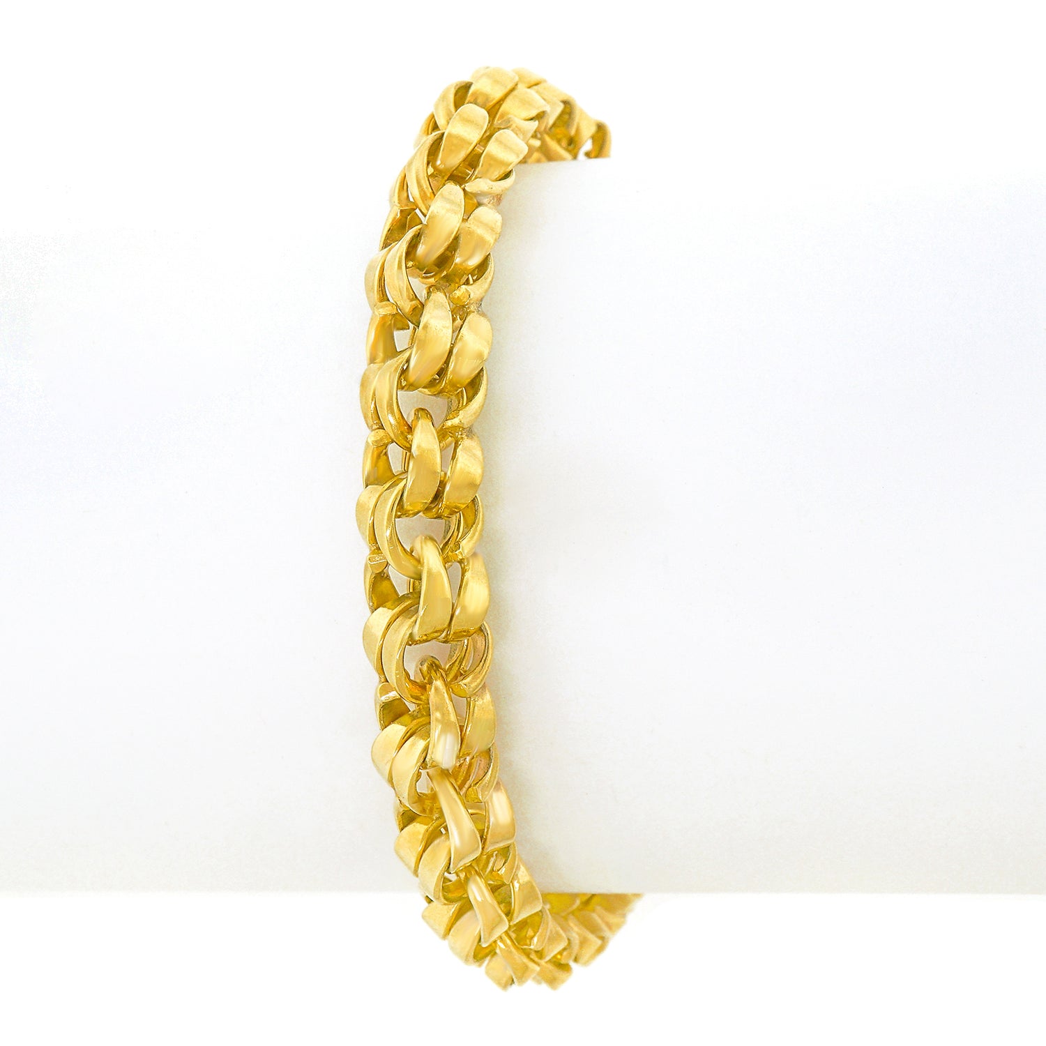 Circa 1950s, 14k, American. This wearable chunky bracelet does it all; heels and jeans to little black dresses. The unusual double link motif is chic American jewelry fashion at its Town and Country every day best. Finely fabricated, it is in excellent condition.