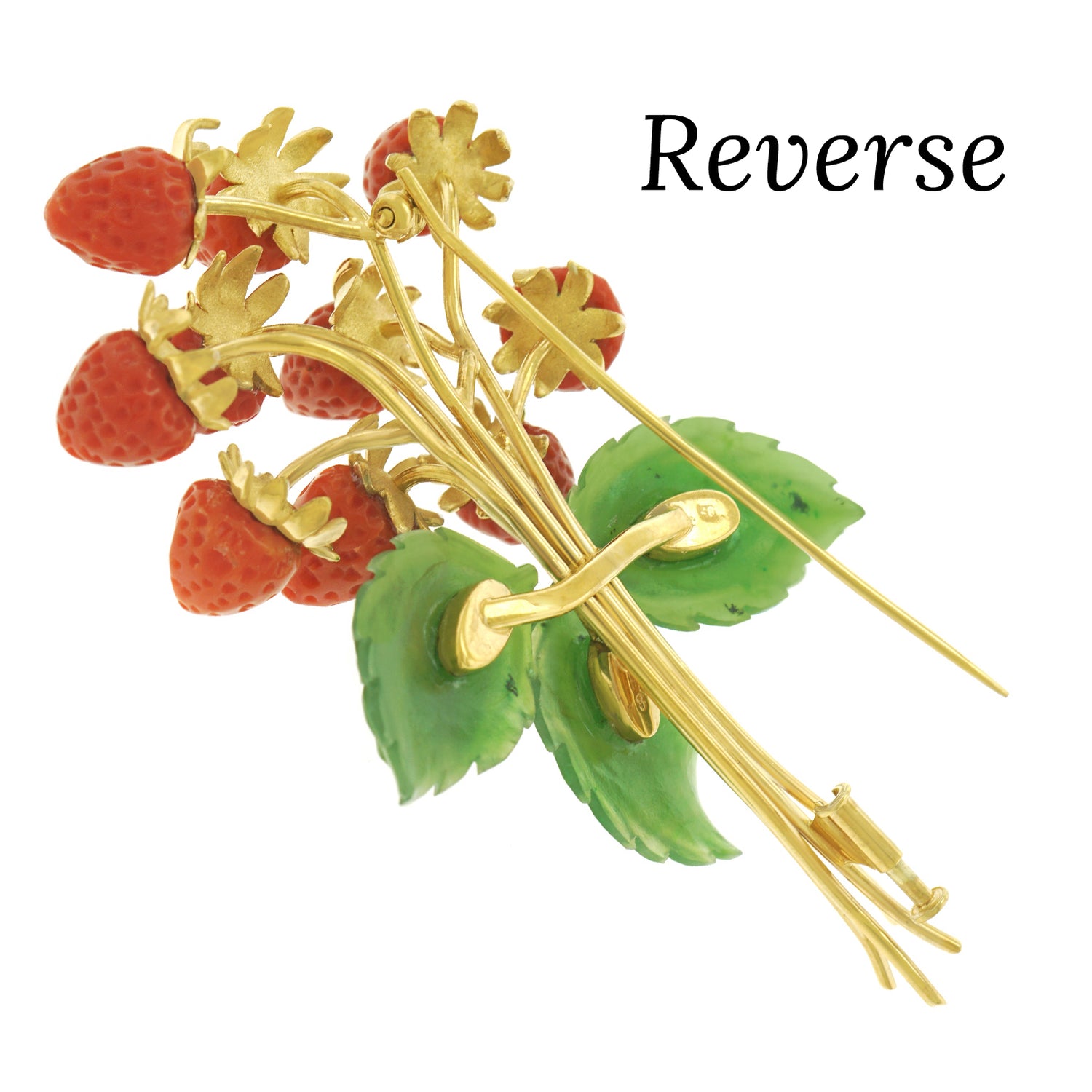Circa 1920s, 14k, Austria. This pin's abundant spray of 10 coral strawberries and lush jade leaves is perfect for a dress or jacket. It's breezy twenties chic effortlessly dresses up or down …try it on the bow of a sash. Hand-carved naturalistic details add to this Austrian brooch’s stylish one-of-a-kind charm. Excellent condition.