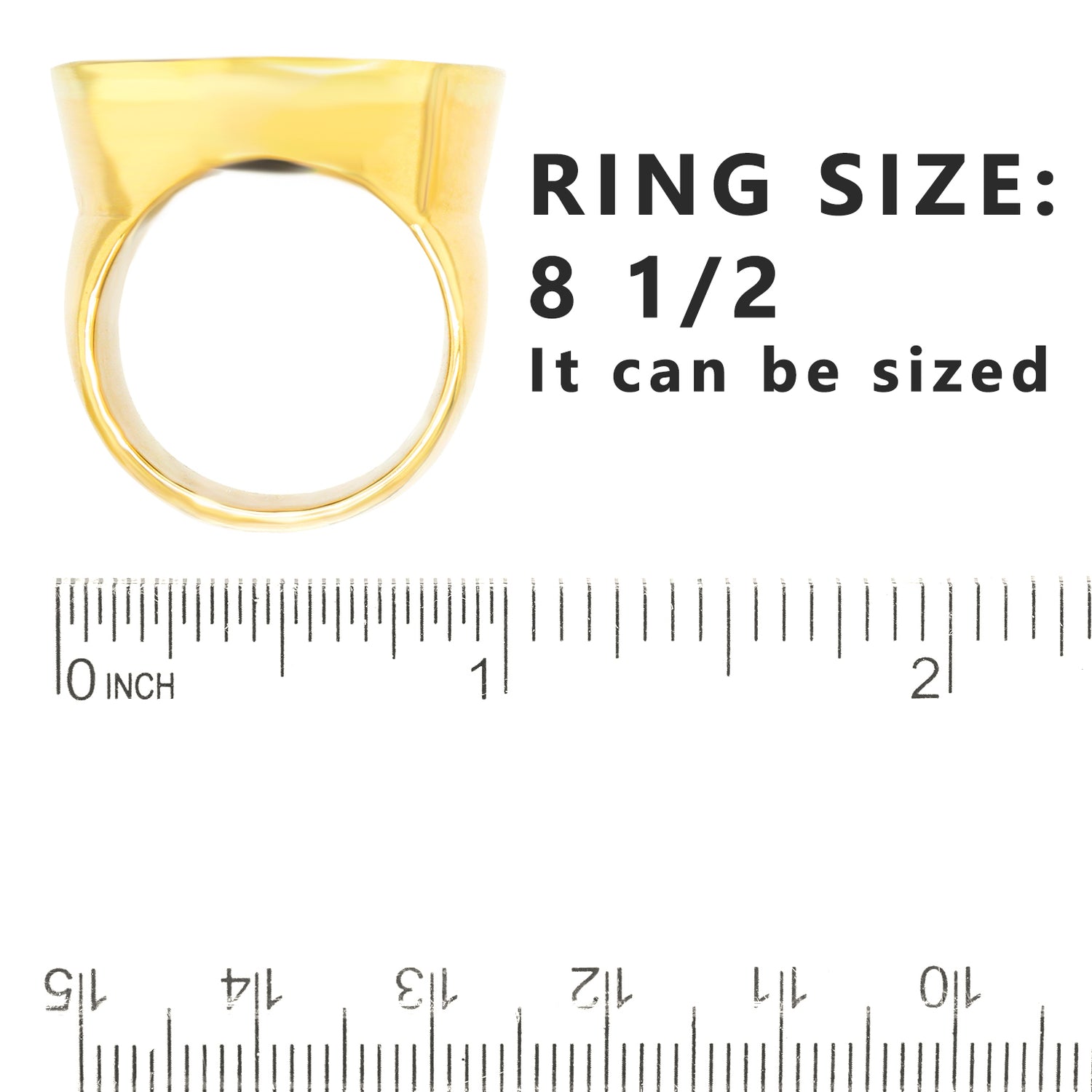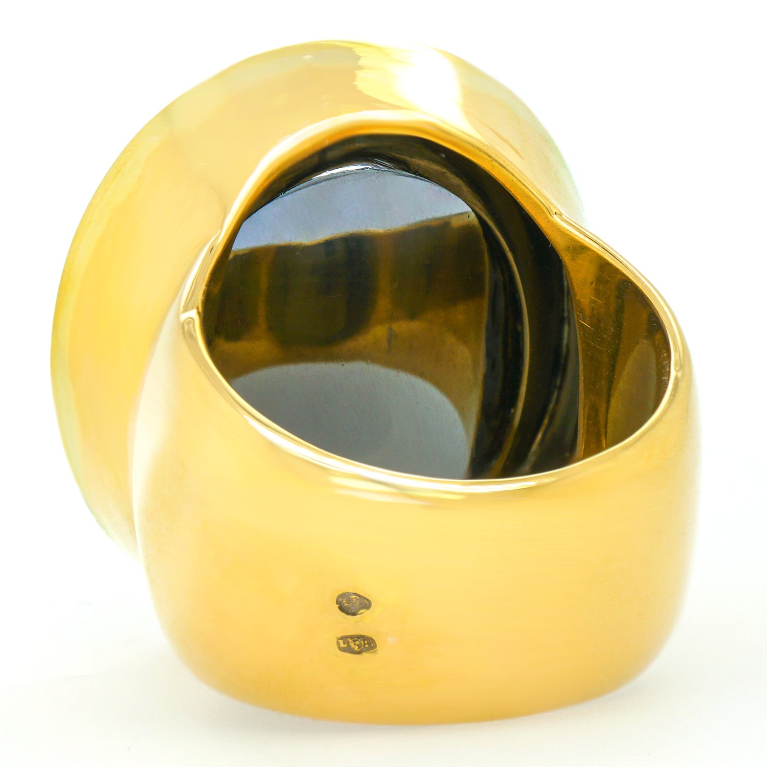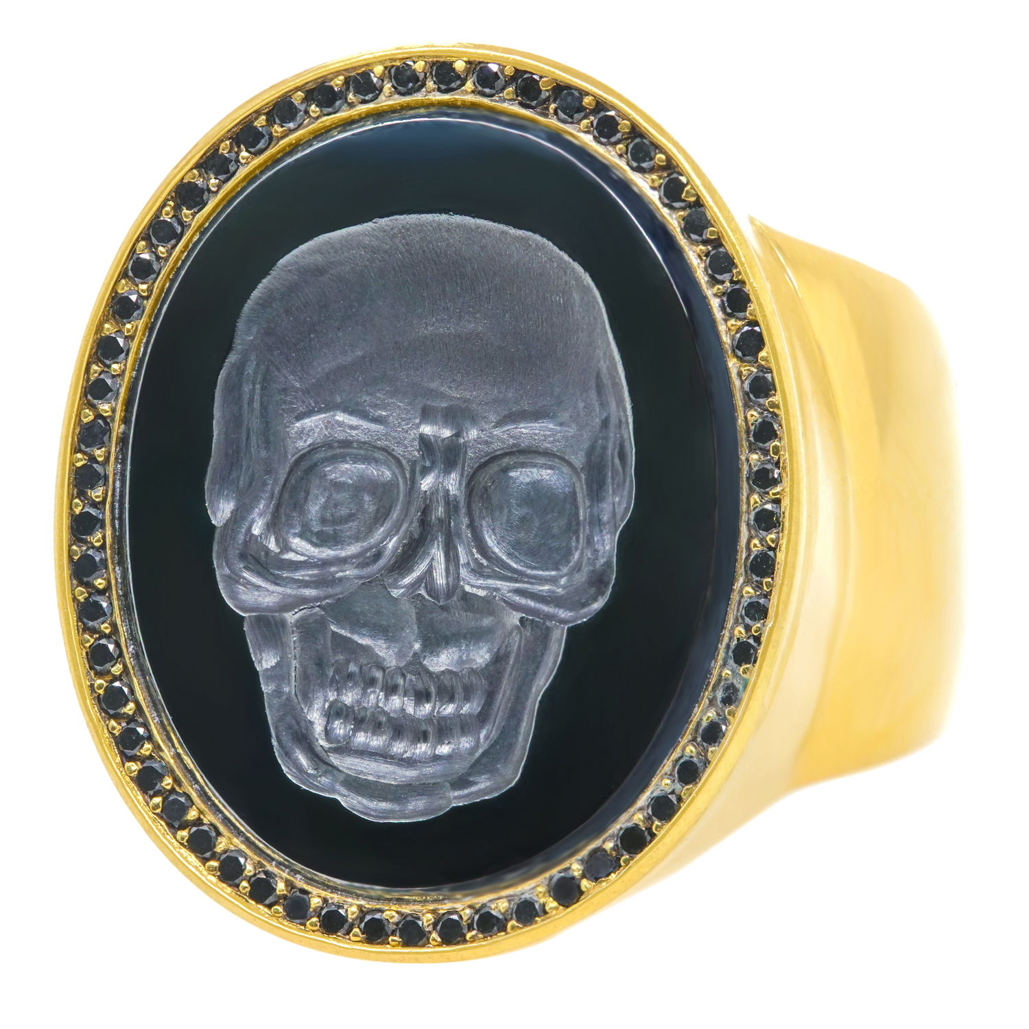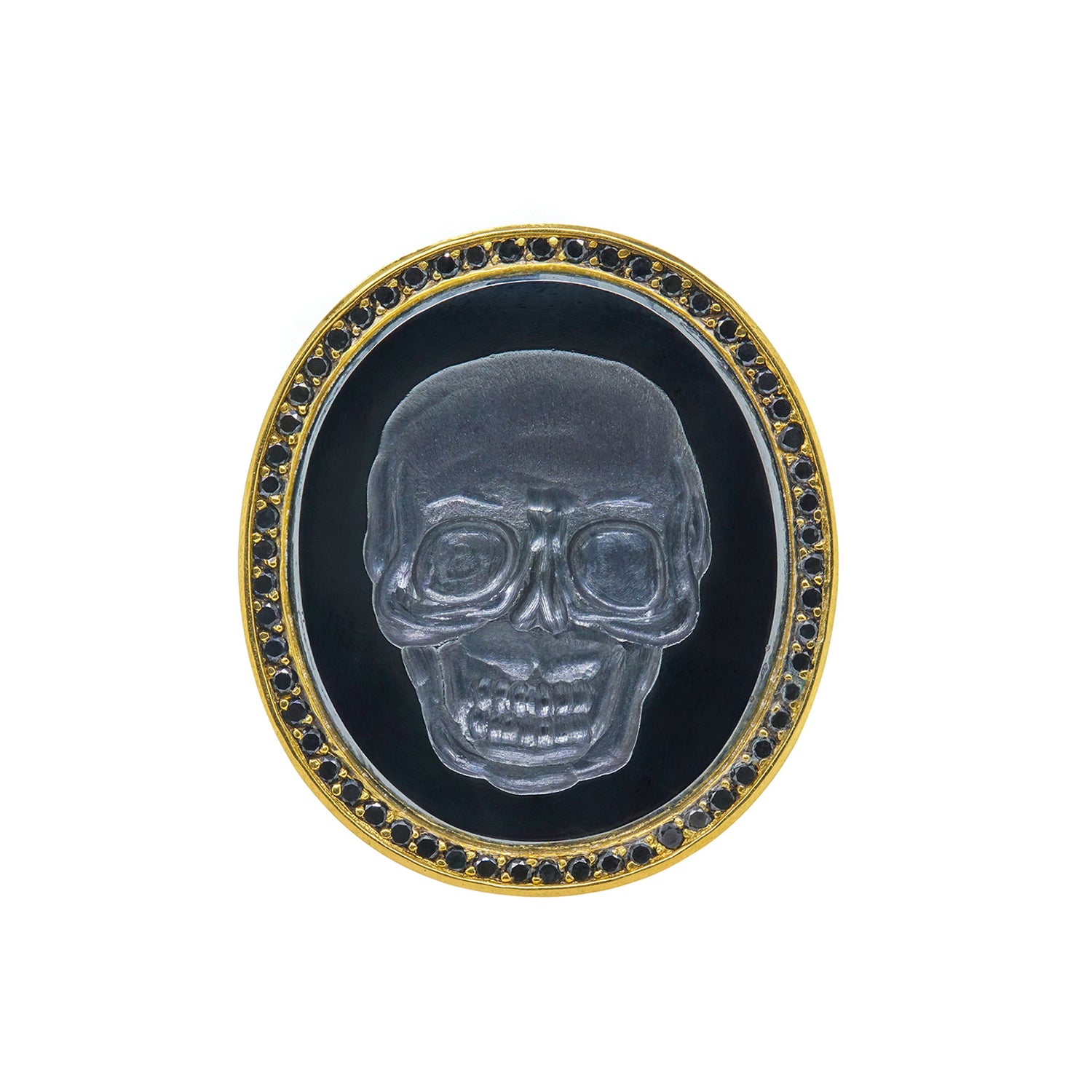 Circa Early 2000's, 18k, by Lydia Courteille, Paris, France. This astonishing signet motif ring is set with a massive intaglio-cut black hematite skull surrounded by black diamonds. The look is Day-of-the-Dead rock star gothic! Lydia Courteille's jewelry is a fantastical, psychedelic fashion dreamscape. Quality construction, superb design, and fine gemstones are part of every piece she produces. Excellent condition.