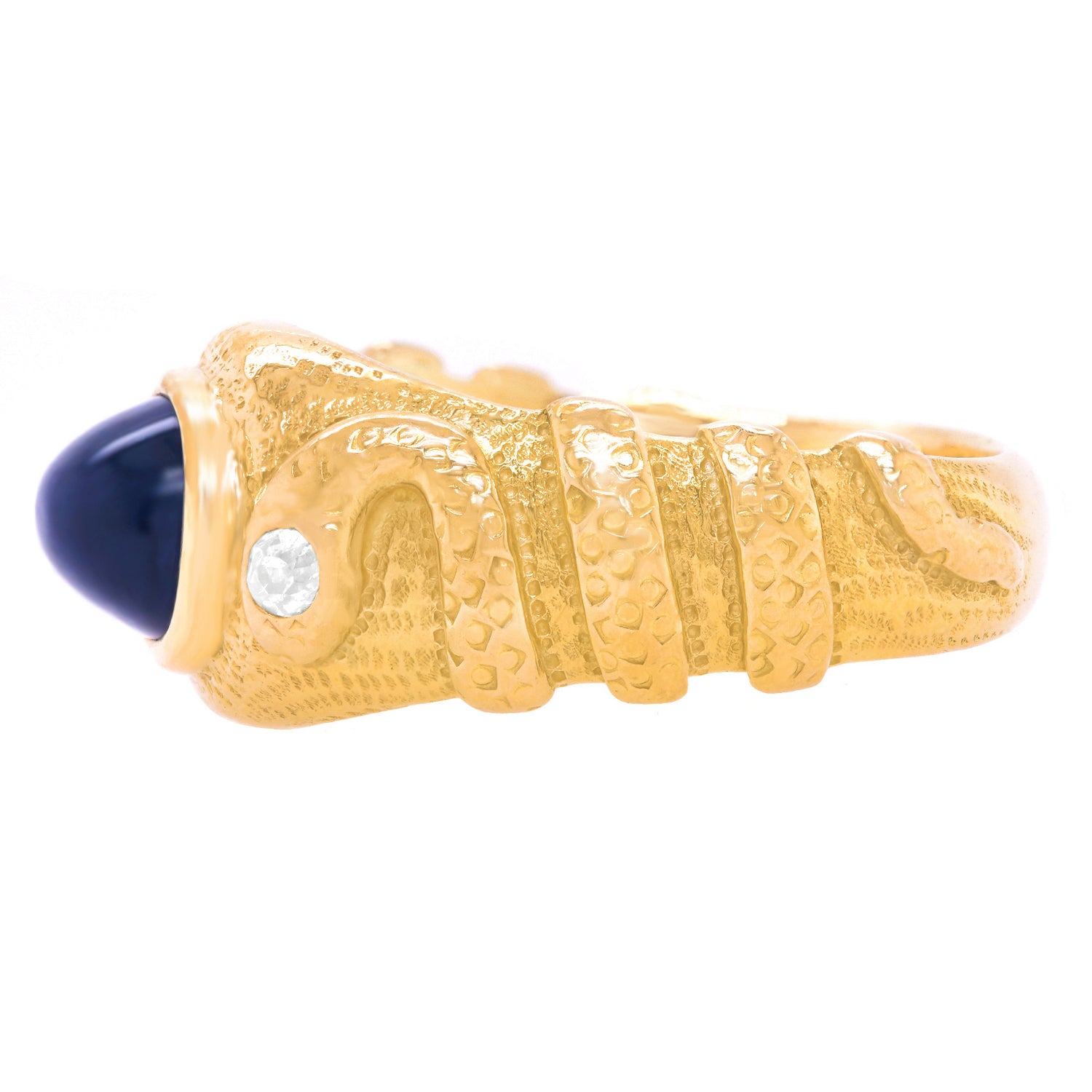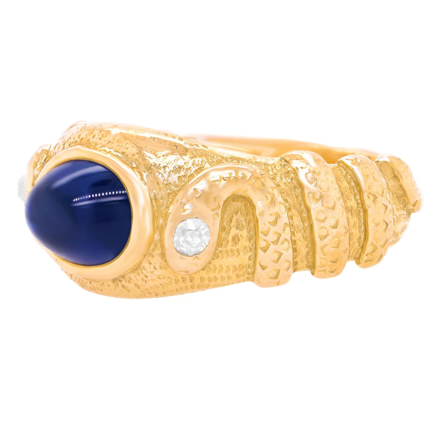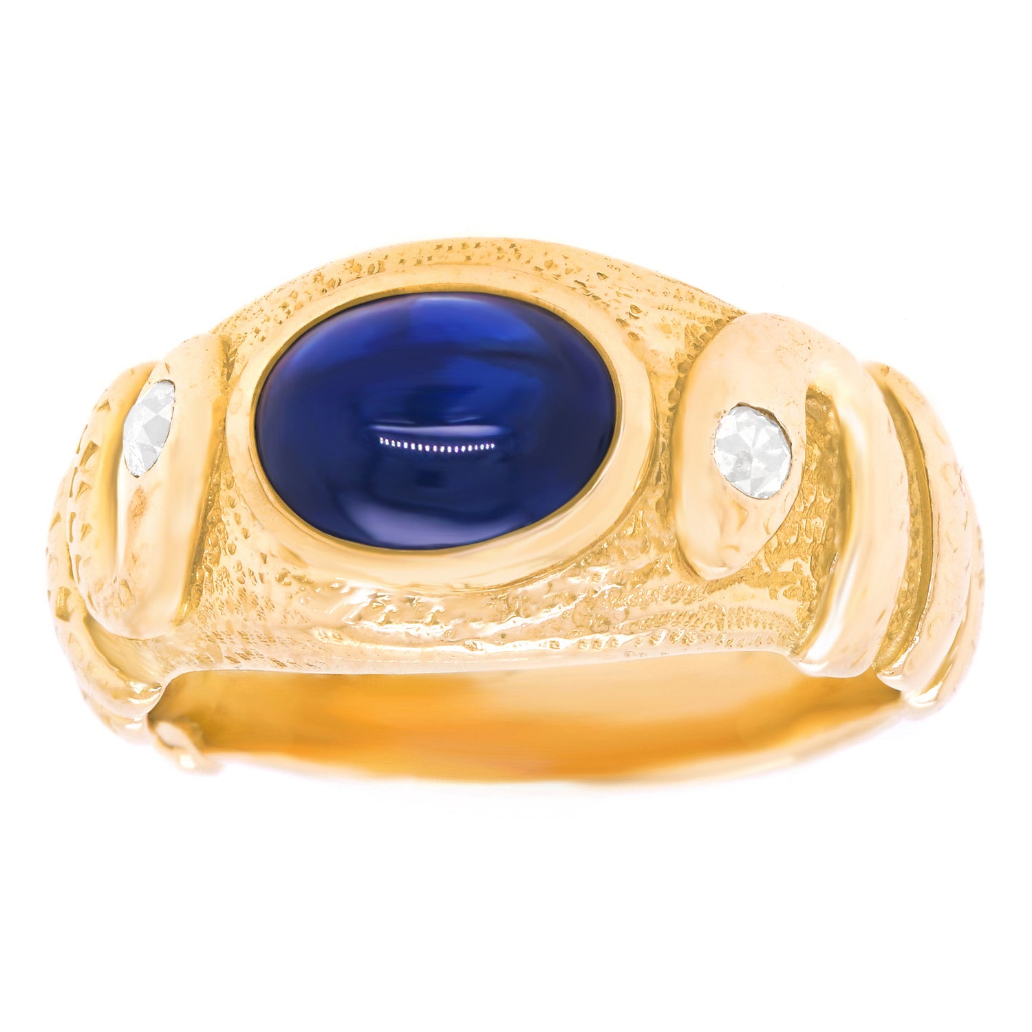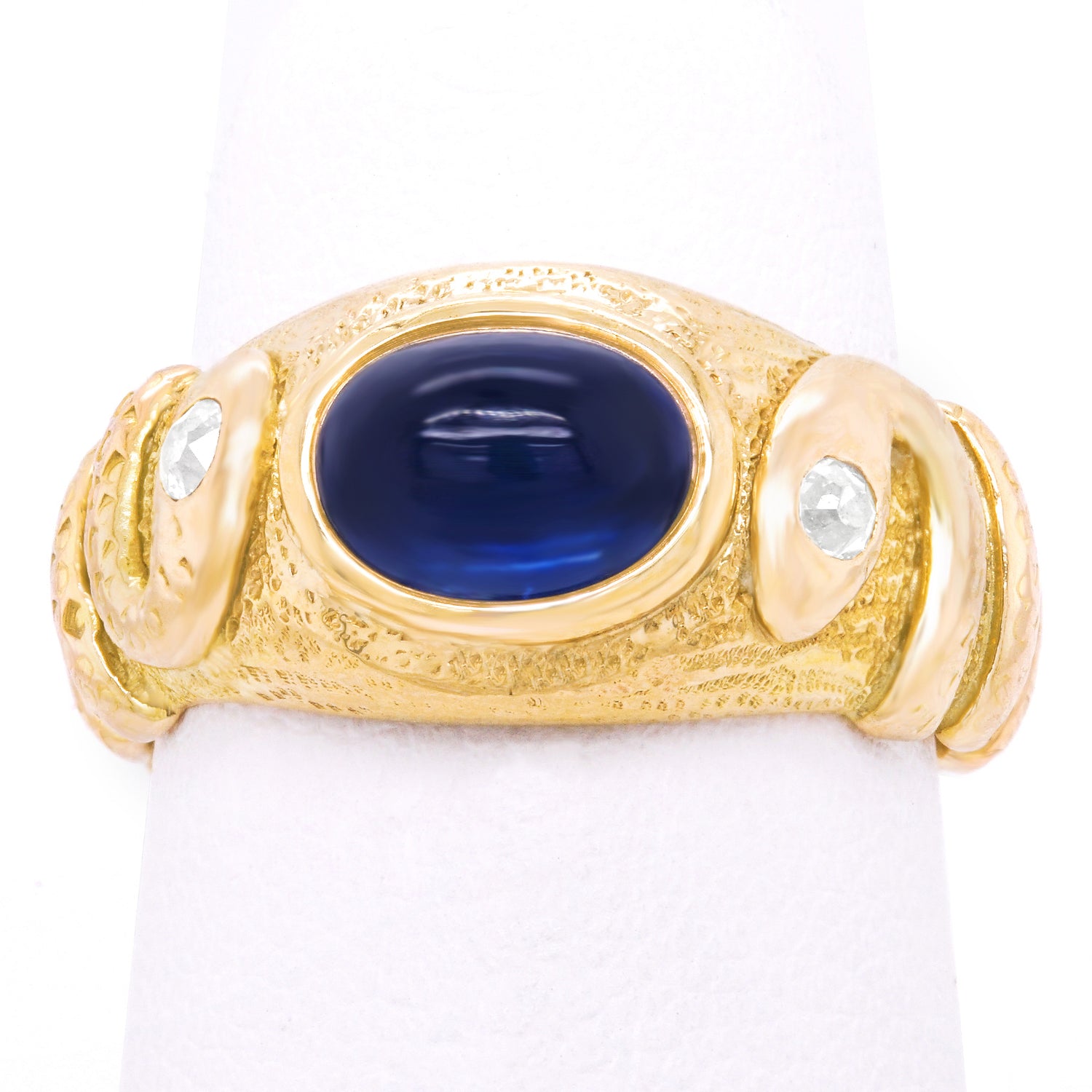 Circa 1880s, 14k, American. This Antique Arts and Crafts double snake ring is a chic one-of-a-kind. Perfect for a modern fashion narrative, snake jewelry has been popular for thousands of years. Set with a 2.10 carat cabochon sapphire this ring has a spiritual vibe that flows into mysticism. Traditionally representing fidelity and friendship, a double snake symbolizes a pair of friends. Meticulously hand made and set with a .20 carat diamond in each head, this ring is in excellent condition.