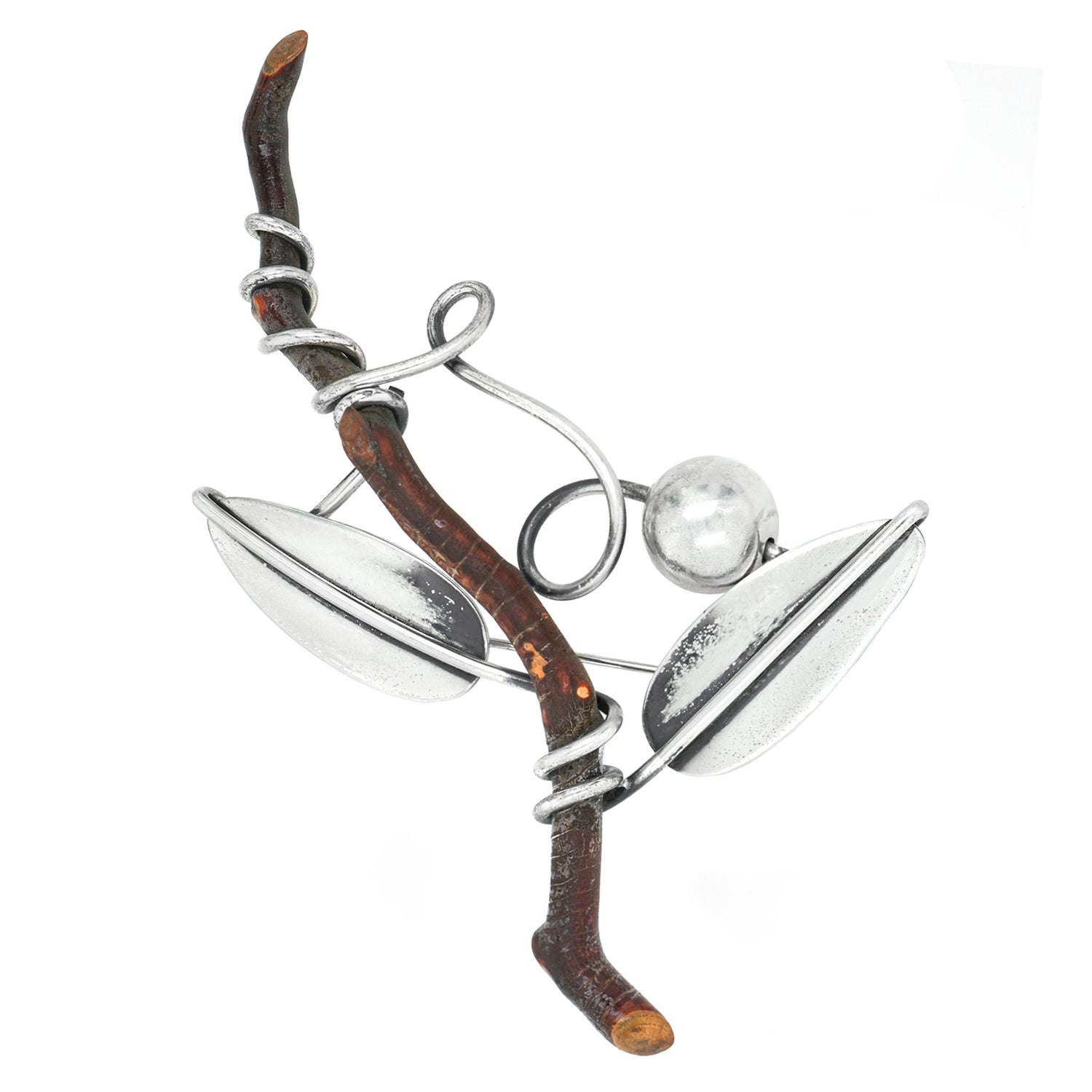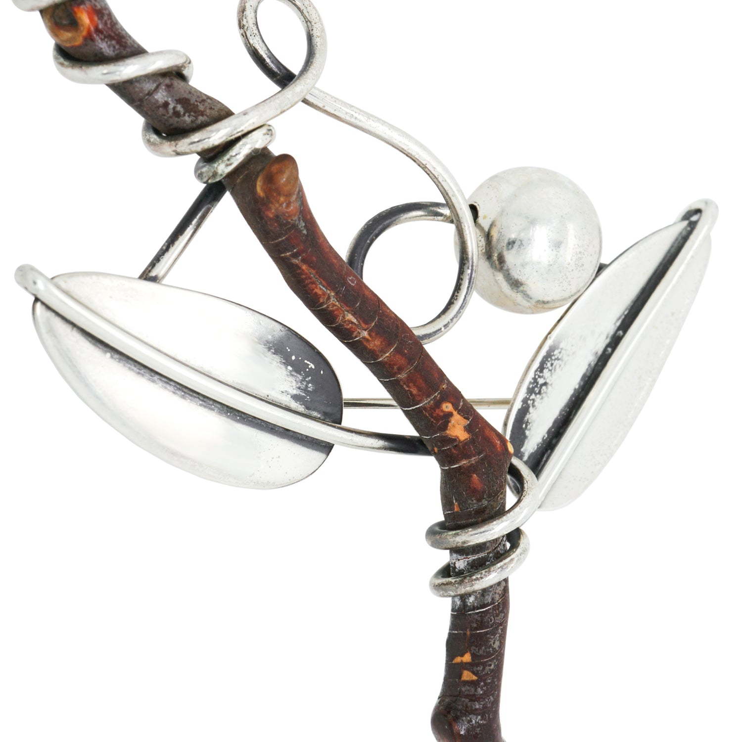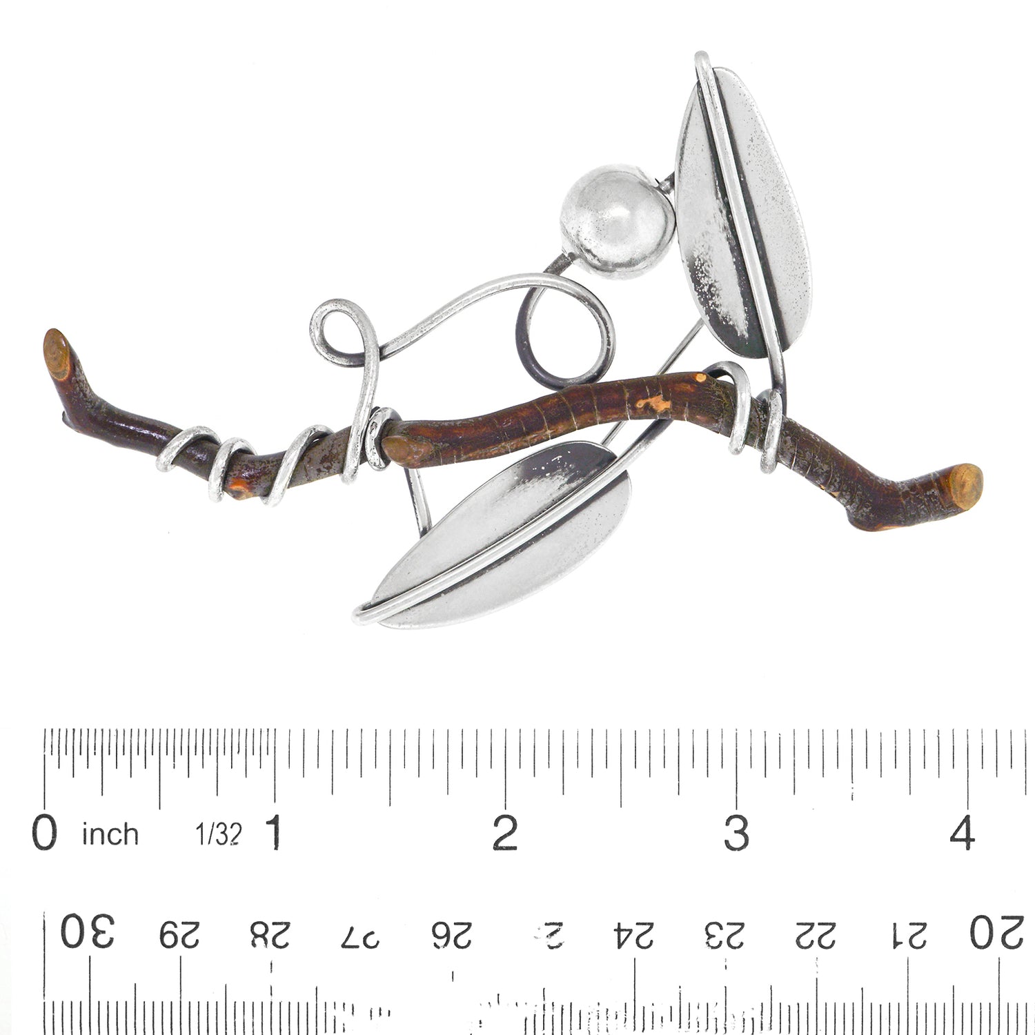 Circa 1950s, Sterling, by Francisco Frank Rebajes, American. Known for his ground-breaking sculpture and jewelry, Frank Rebajes wowed the New York Art scene from his Atelier in Greenwich Village. This modernist brooch cleverly displays his use of a real twig paired with surreal sterling leaves and a berry. The look is Catwalk to sidewalk NYC fashion! One-of-a-kind, this rather large, decidedly fabulous, the brooch is in excellent condition.