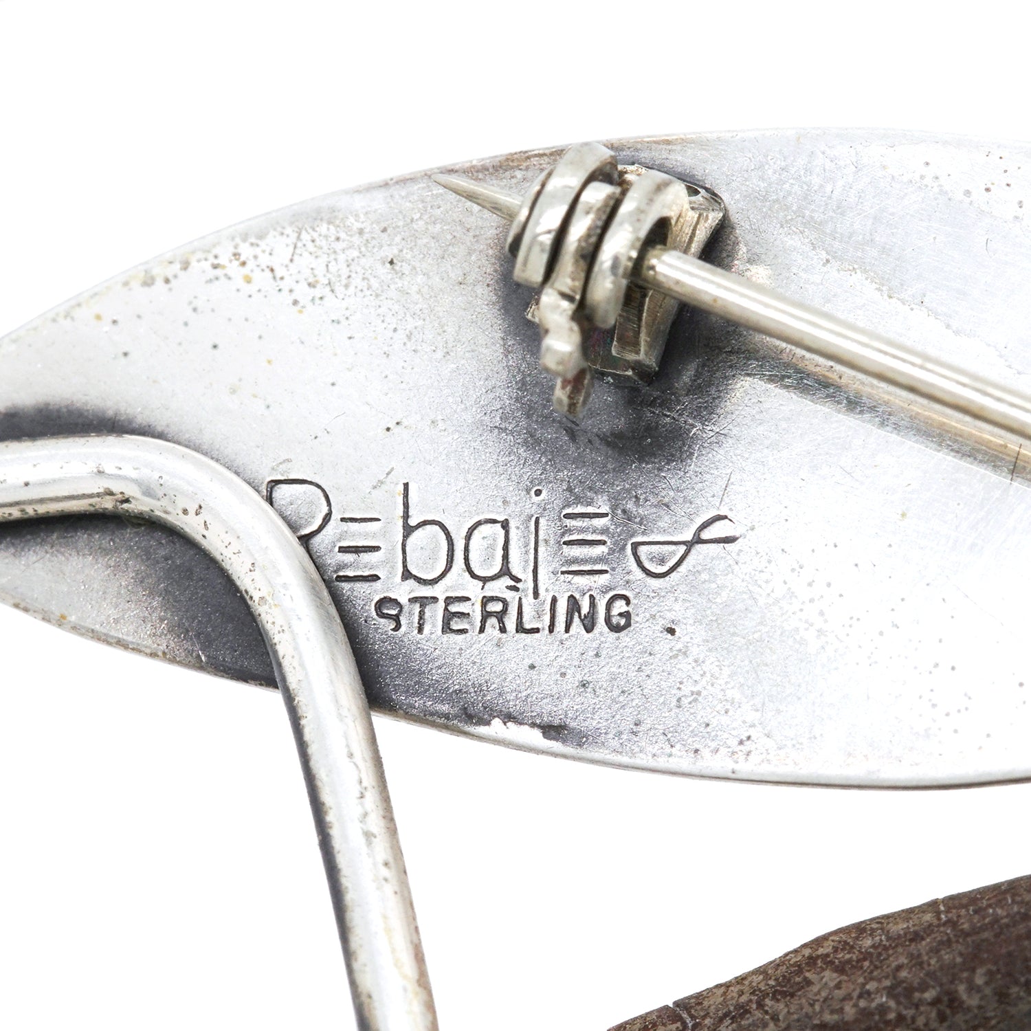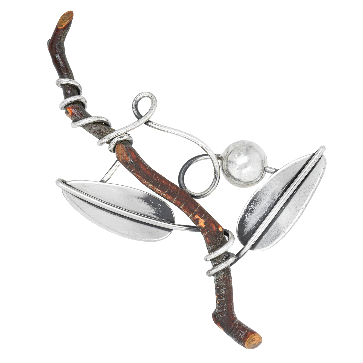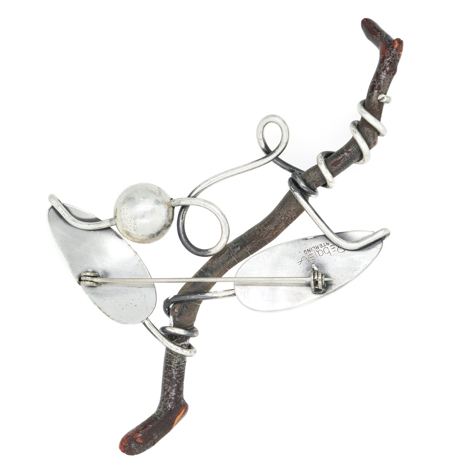Circa 1950s, Sterling, by Francisco Frank Rebajes, American. Known for his ground-breaking sculpture and jewelry, Frank Rebajes wowed the New York Art scene from his Atelier in Greenwich Village. This modernist brooch cleverly displays his use of a real twig paired with surreal sterling leaves and a berry. The look is Catwalk to sidewalk NYC fashion! One-of-a-kind, this rather large, decidedly fabulous, the brooch is in excellent condition.