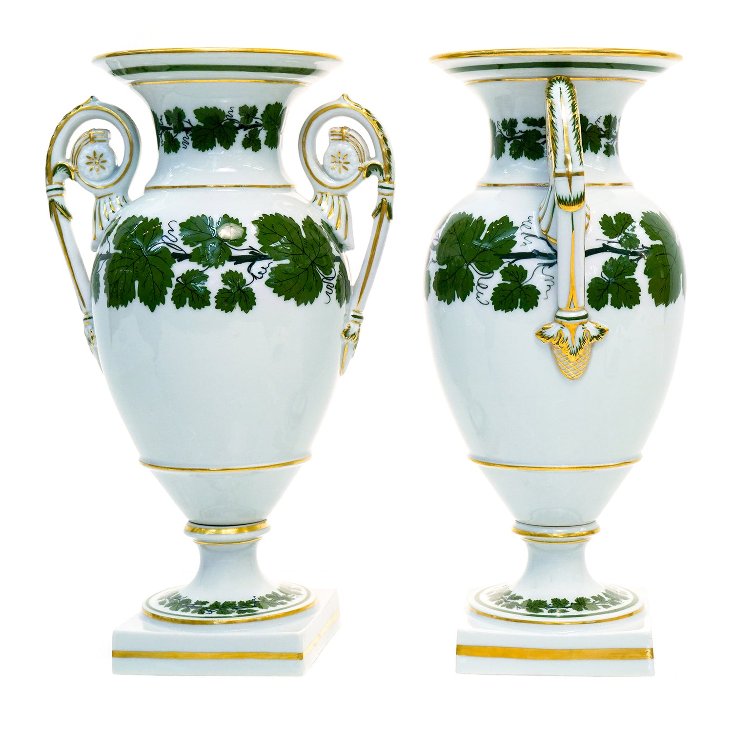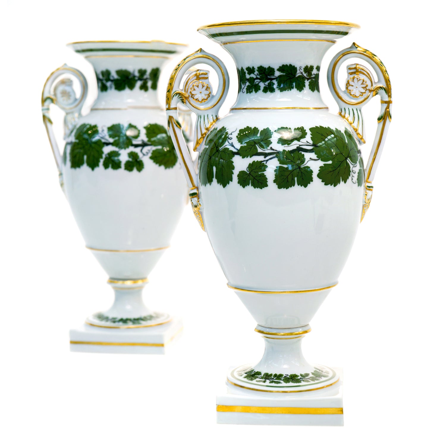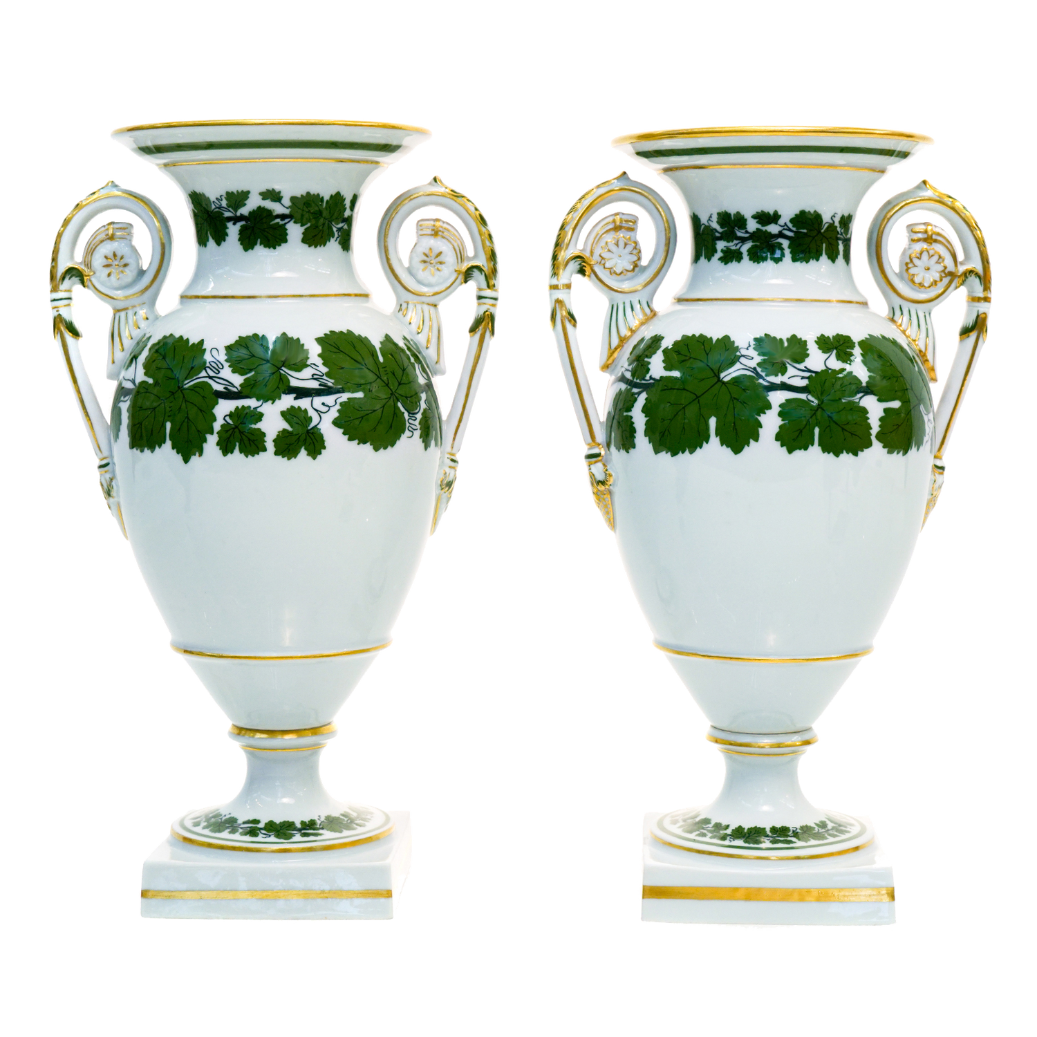 Circa 1890s, by Meissen, Germany. Perfect in any decor this pair of 19th-century Meissen vases feature a timeless neoclassical form adorned with the firm's iconic Ivy motif. Excellent condition.