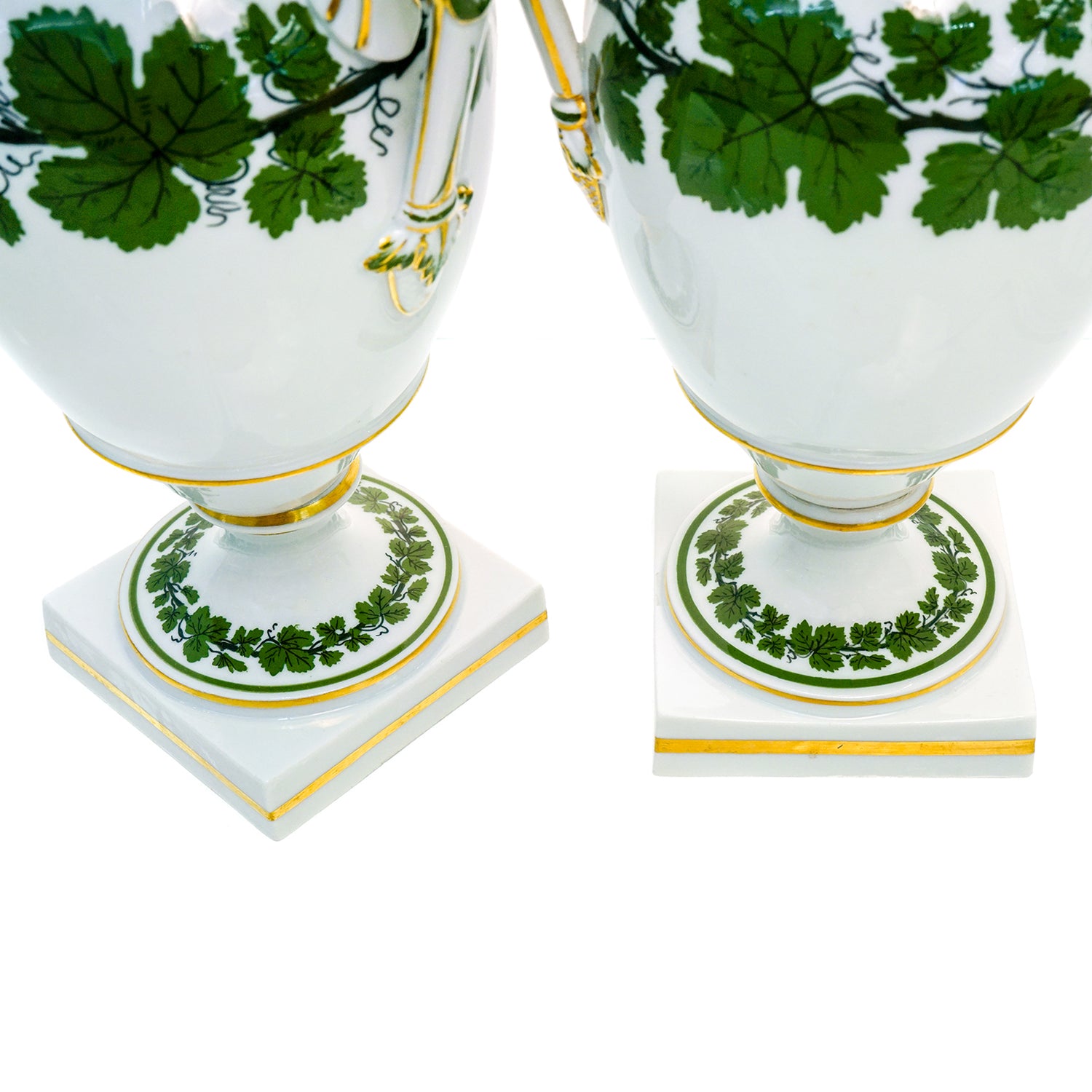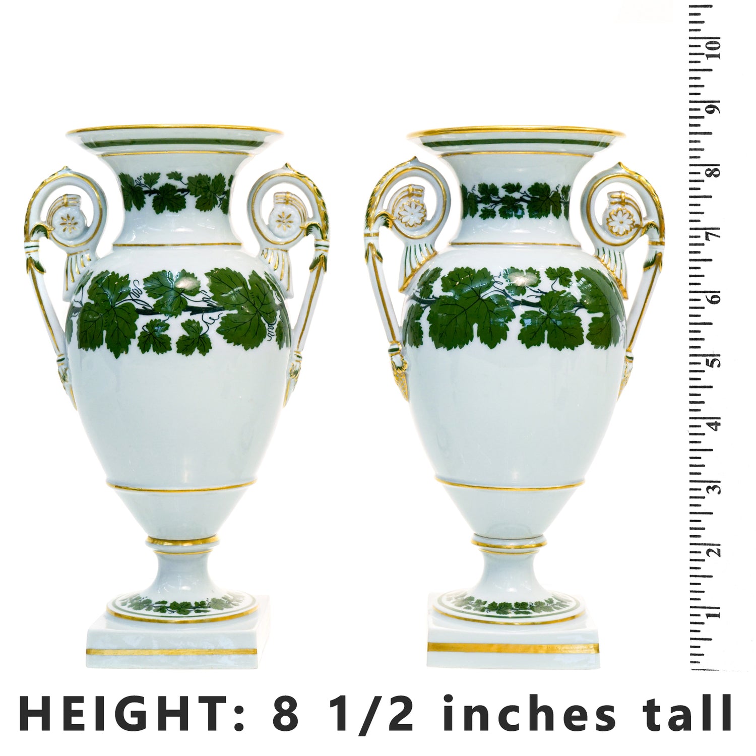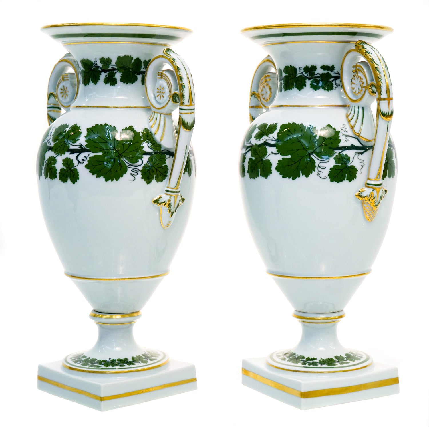Circa 1890s, by Meissen, Germany. Perfect in any decor this pair of 19th-century Meissen vases feature a timeless neoclassical form adorned with the firm's iconic Ivy motif. Excellent condition.