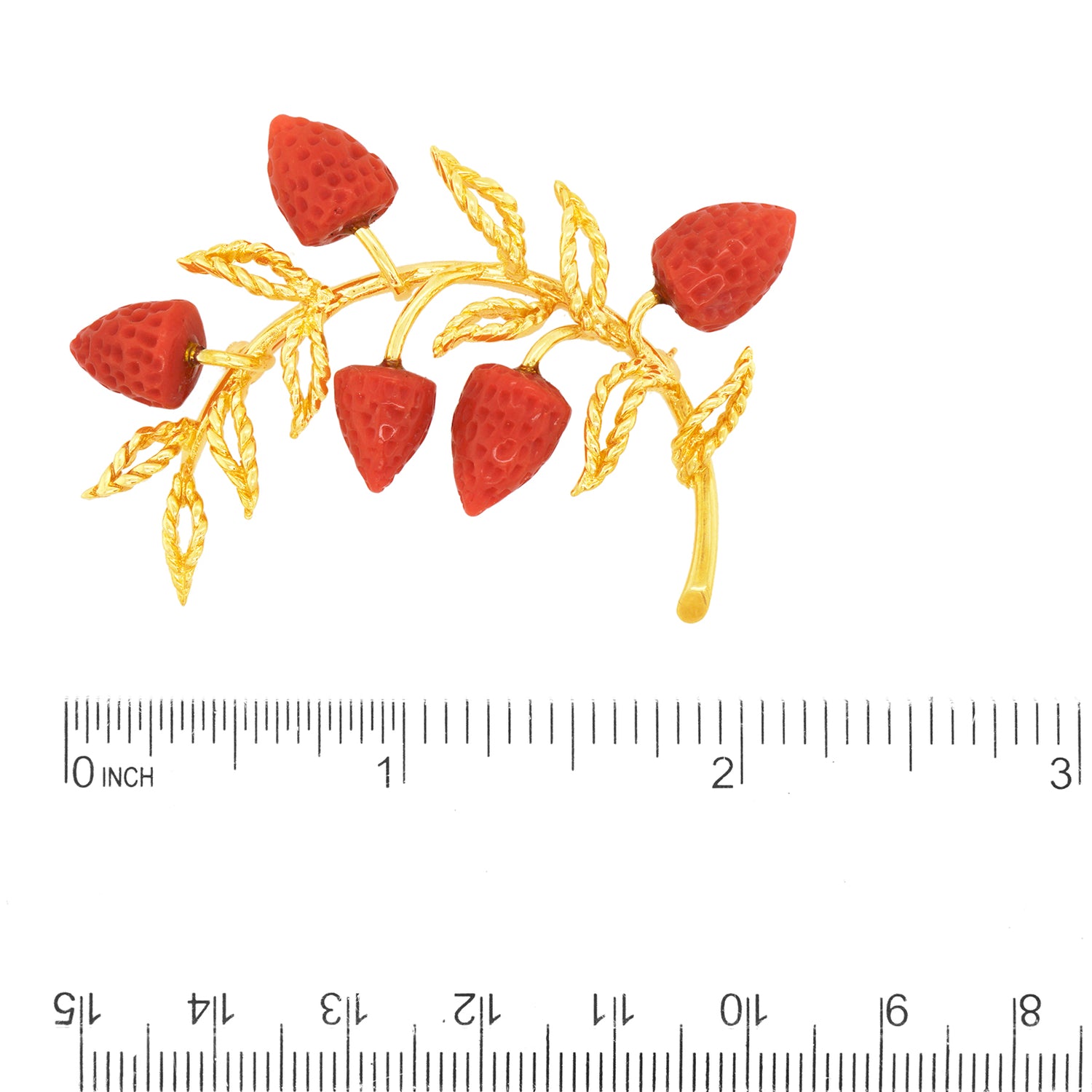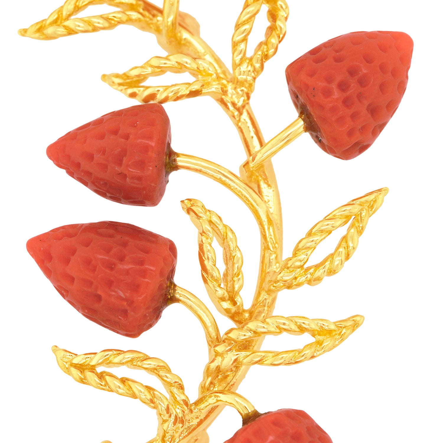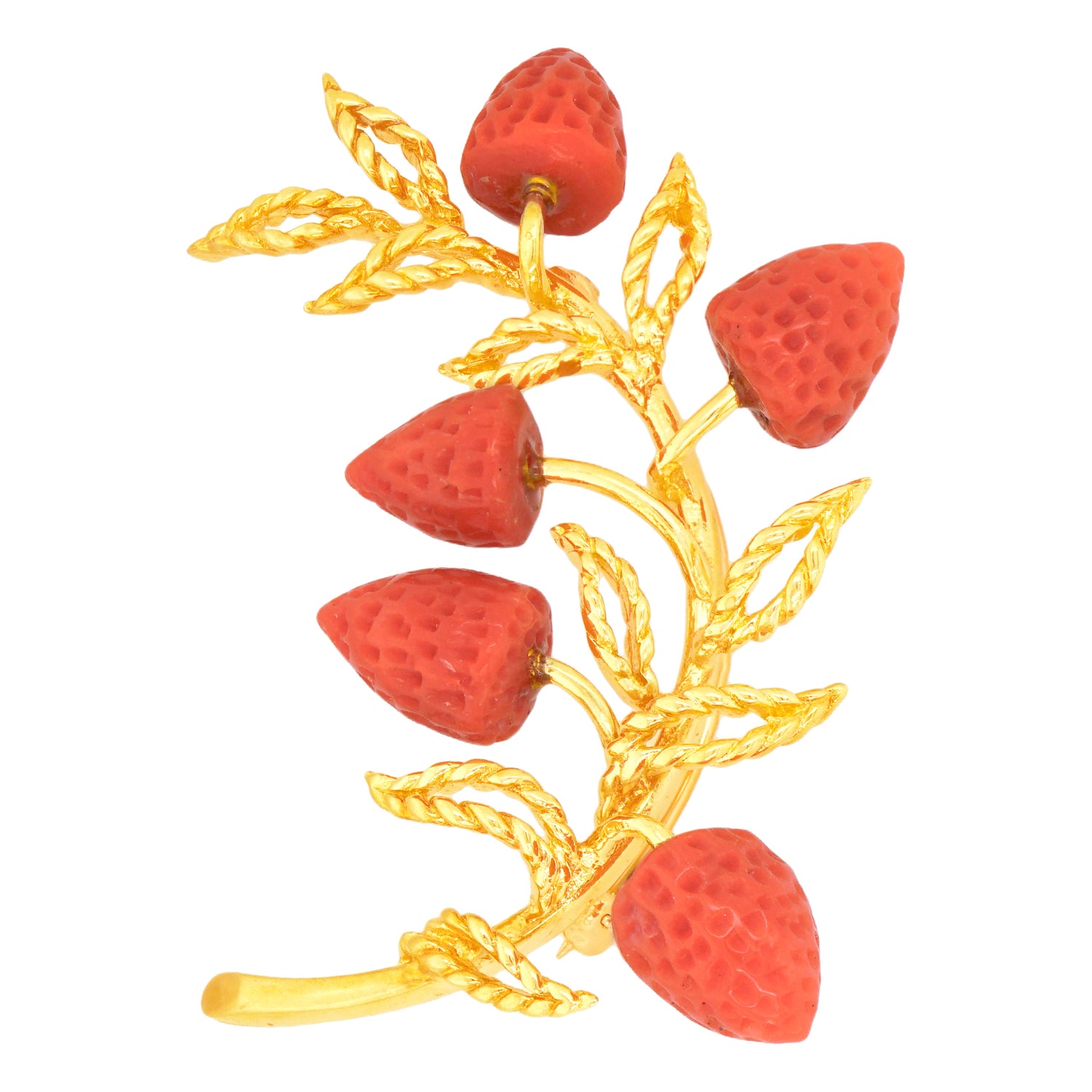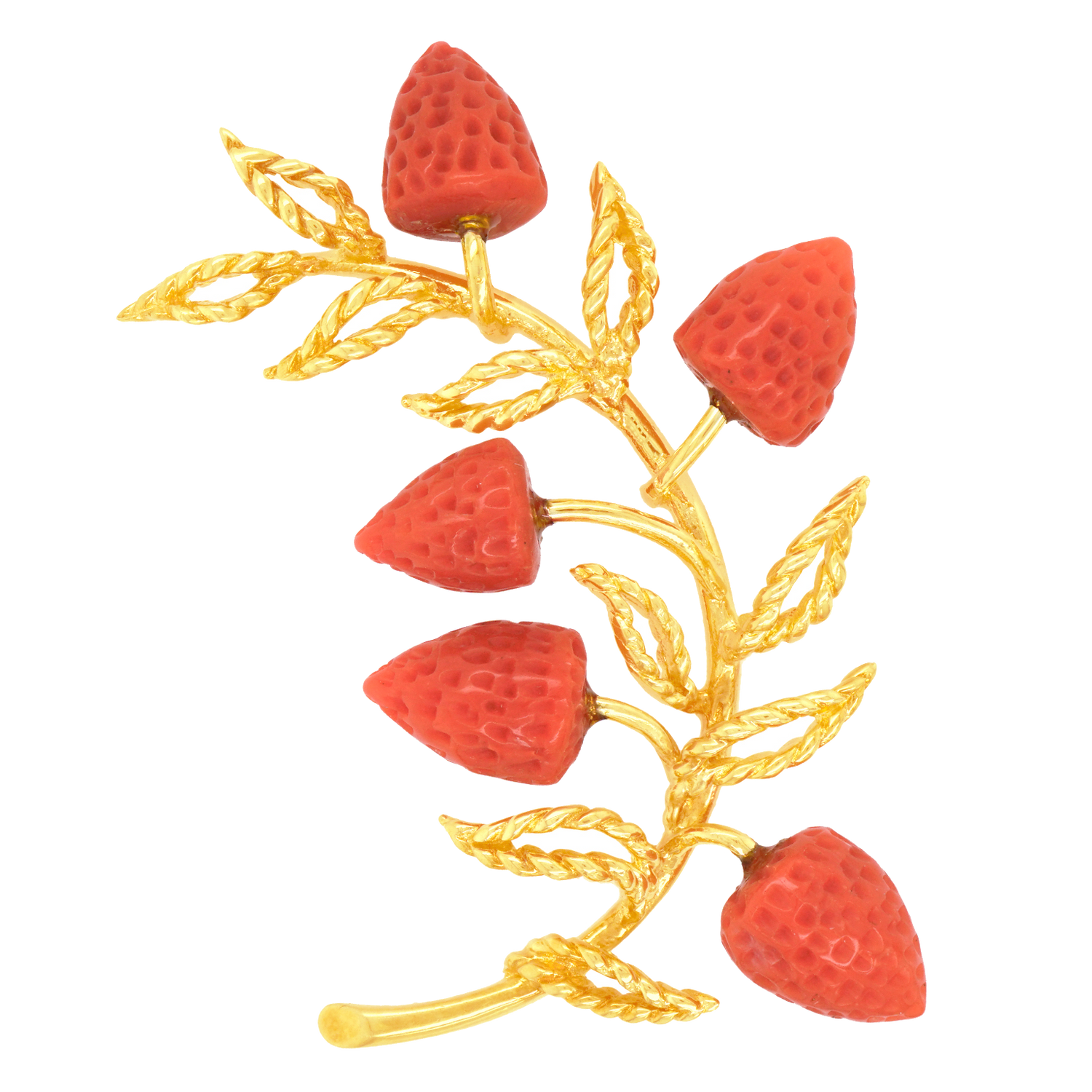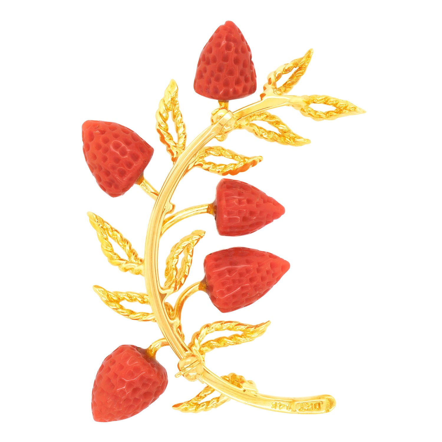 Circa 1970s, 14k, American. This remarkable pin, with its spray of deliciously seventies coral strawberries and twisted wire leaves, is perfect for any moment of fashion, its breezy post-modern chic effortlessly dressing up or down. Hand-carved coral and hand-wrought gold work underscore this brooch’s stylish one-of-a-kind charm. Excellent condition.