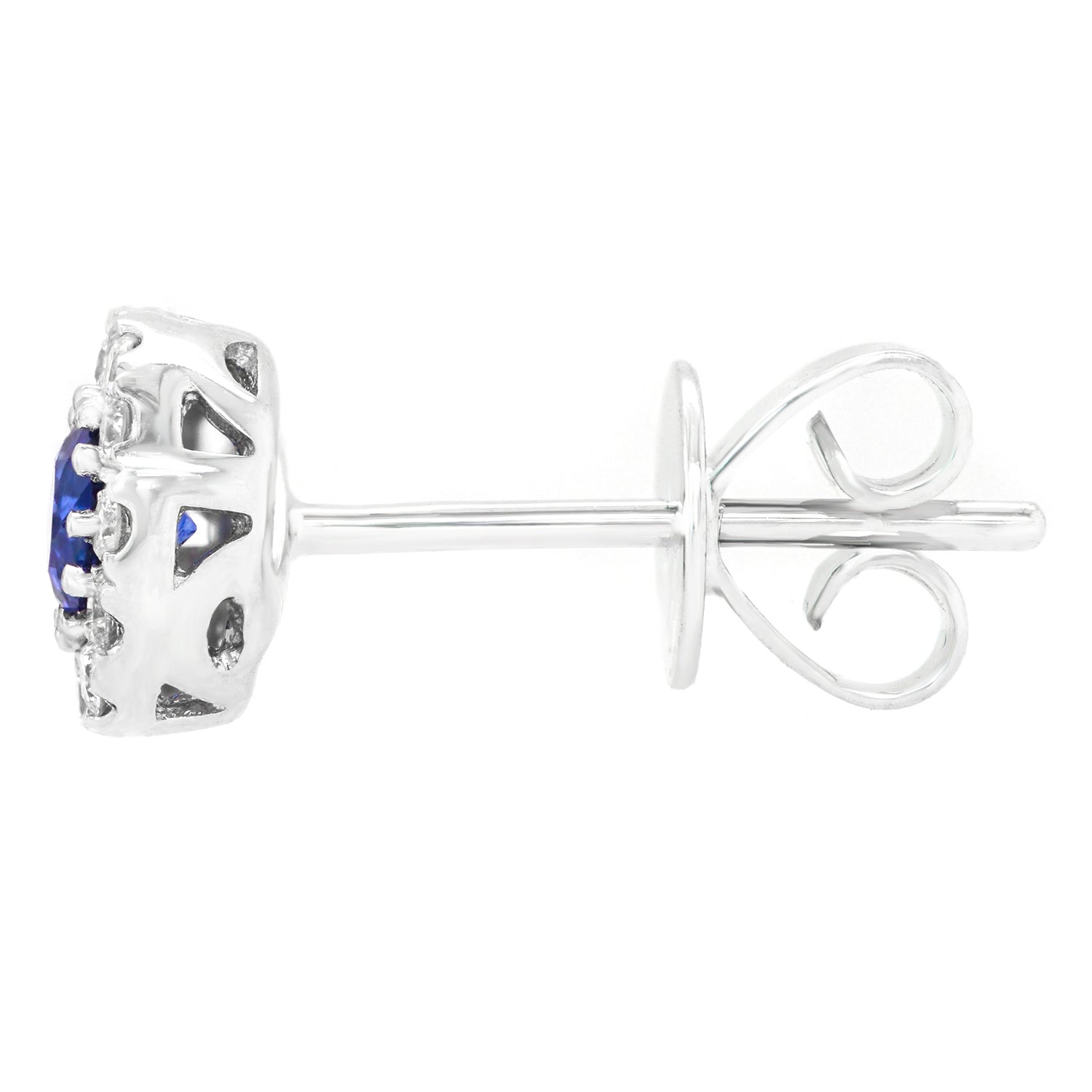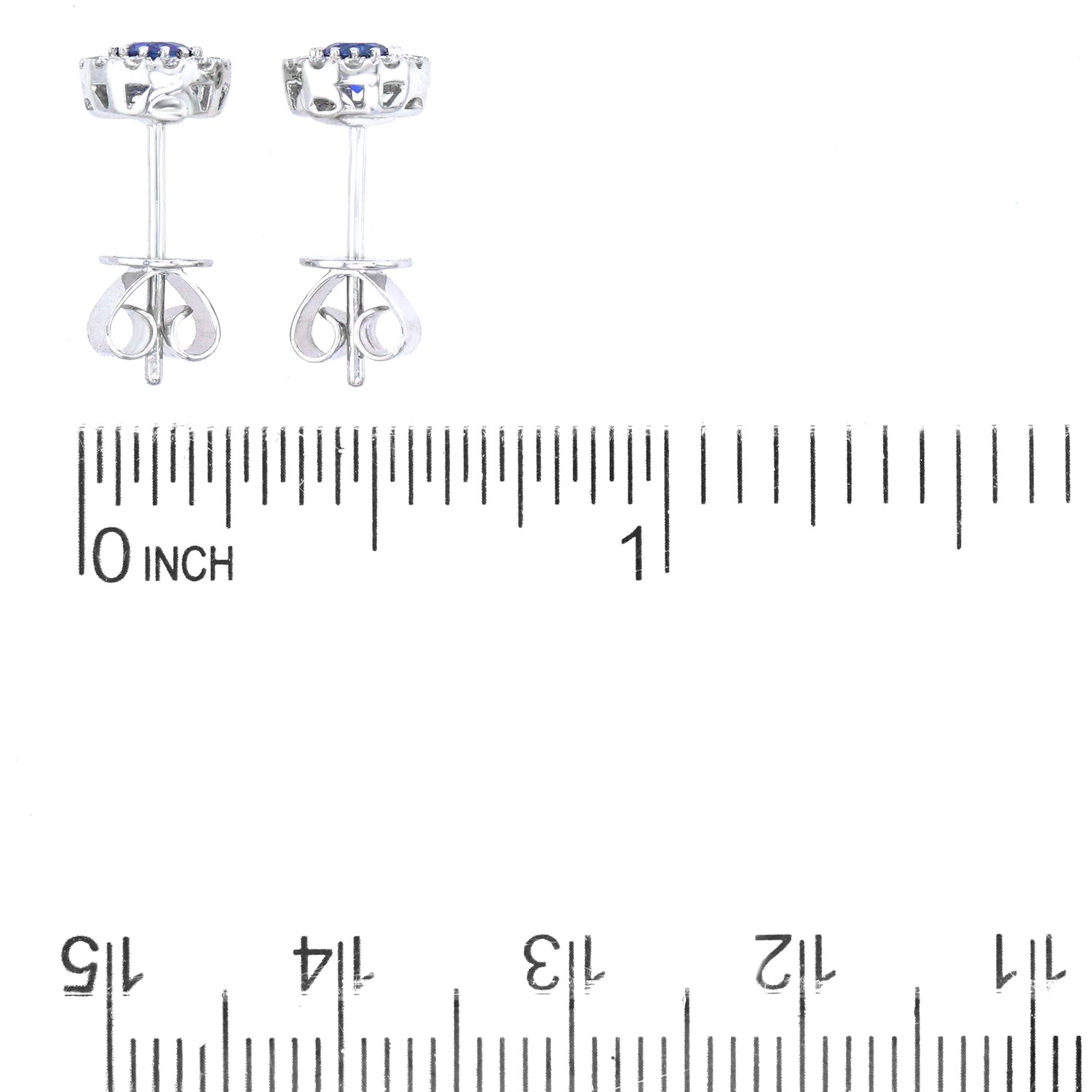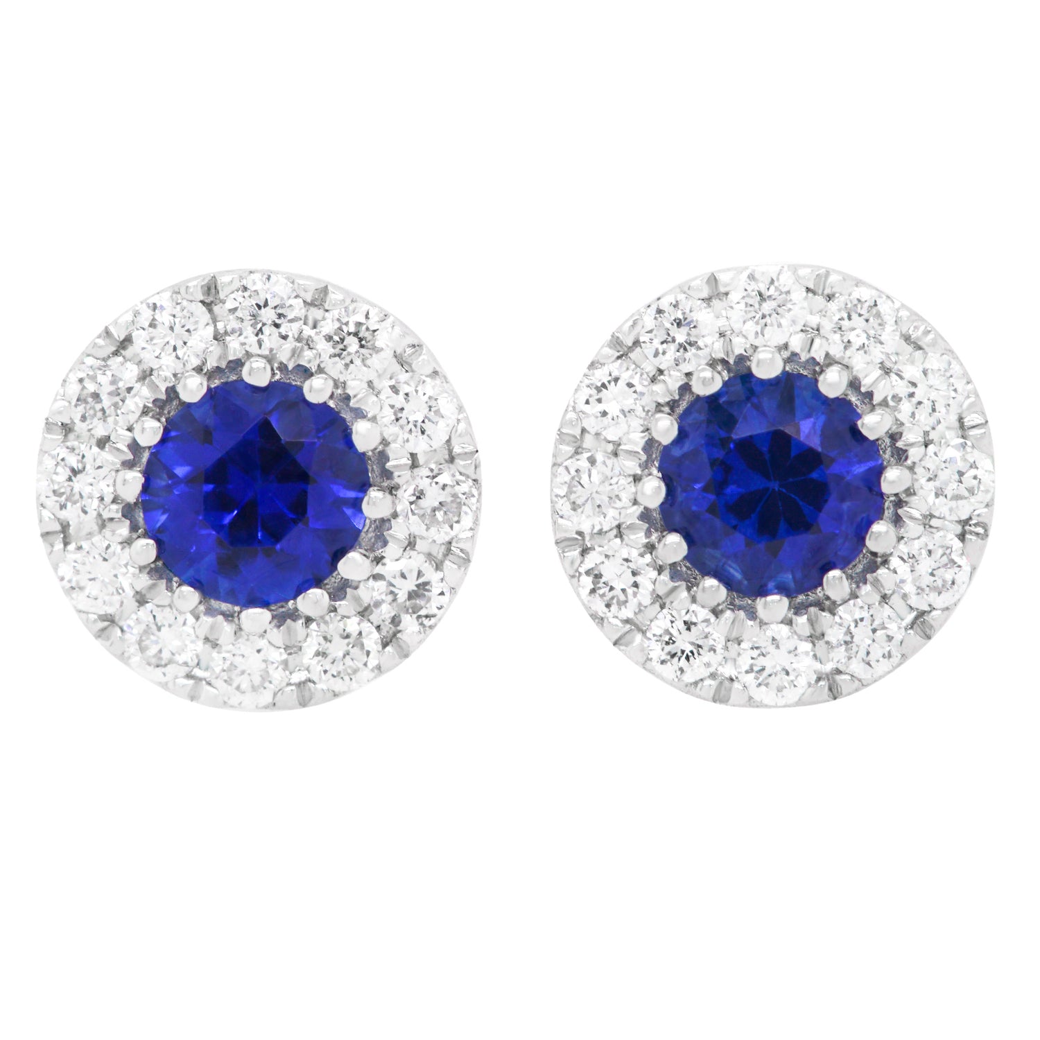 Circa 2000's, 14k, American. These beautiful 14k white gold studs are set with .44 carats of vivid blue sapphires, surrounded by .20 carats of brilliant white diamonds (G color, SI1 clarity). Dimensional and luminous, the look is all color and sparkle. Well-made, they sit comfortably on the ear. Excellent condition.