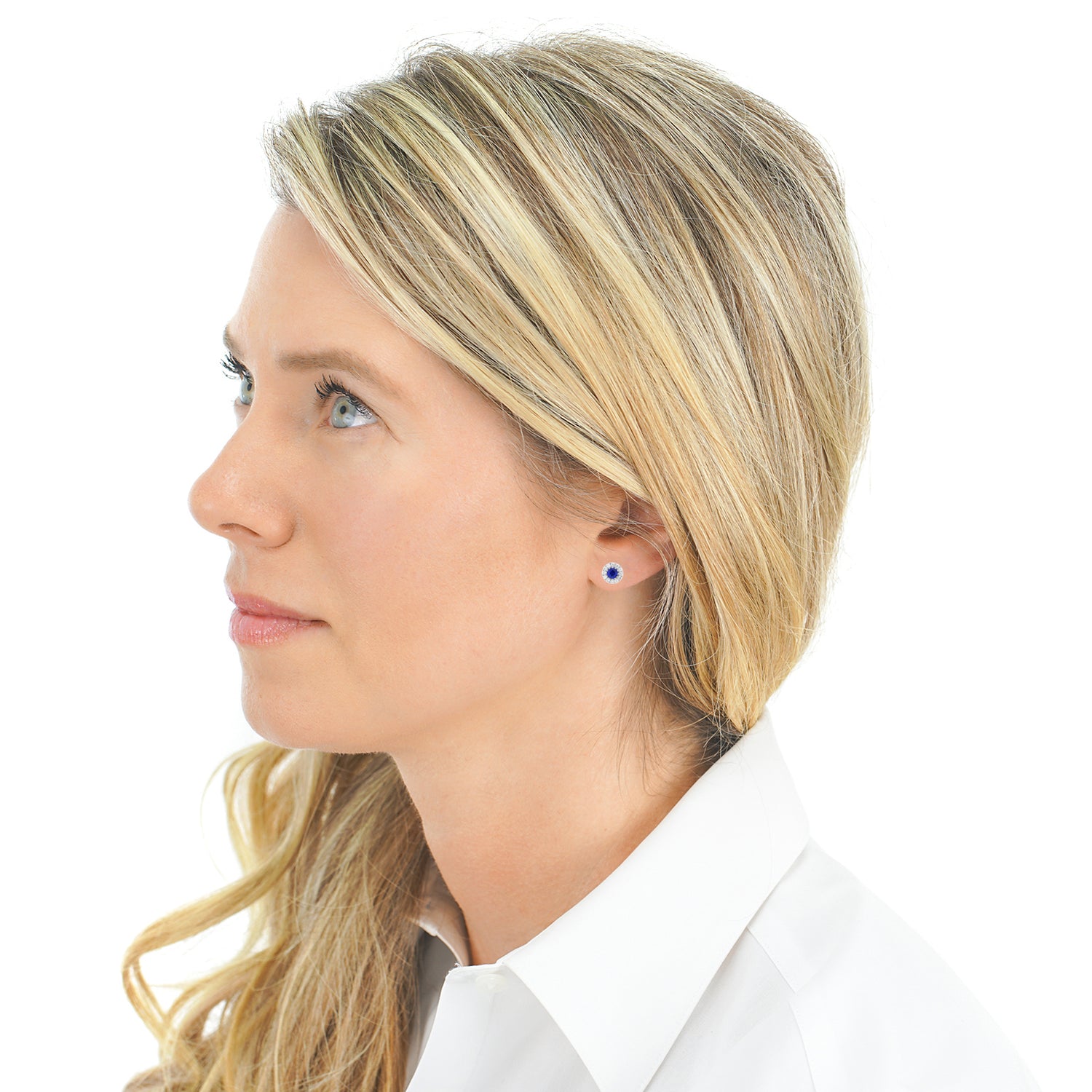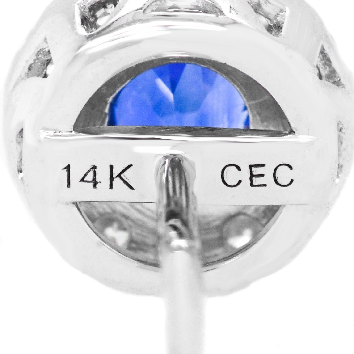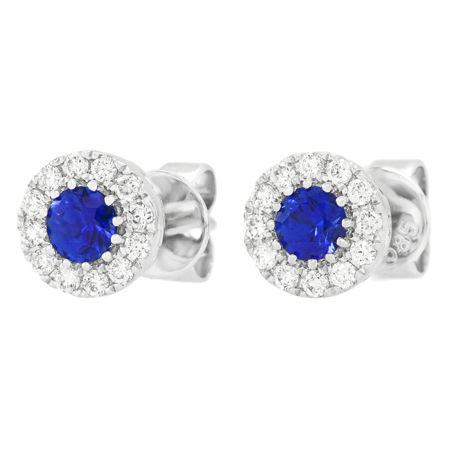 Circa 2000's, 14k, American. These beautiful 14k white gold studs are set with .44 carats of vivid blue sapphires, surrounded by .20 carats of brilliant white diamonds (G color, SI1 clarity). Dimensional and luminous, the look is all color and sparkle. Well-made, they sit comfortably on the ear. Excellent condition.