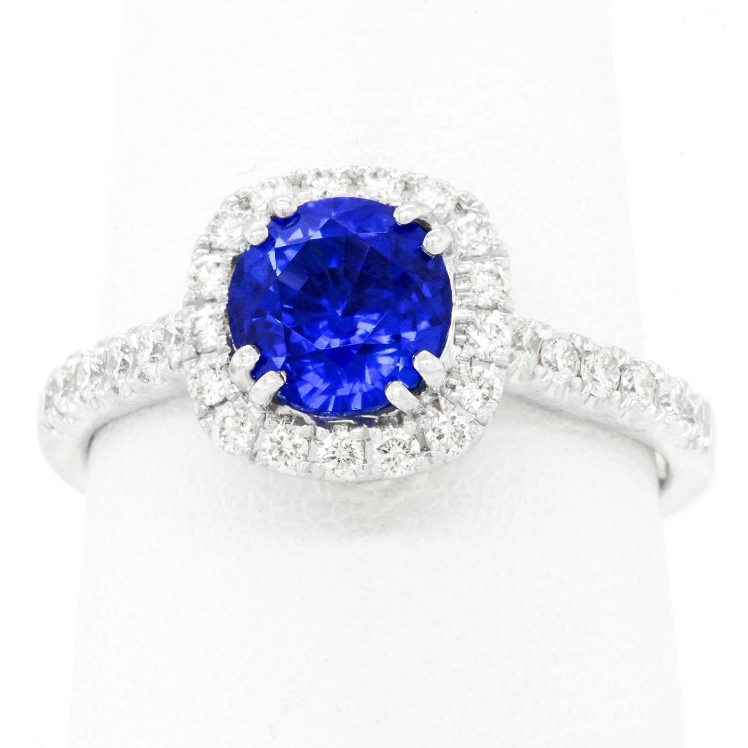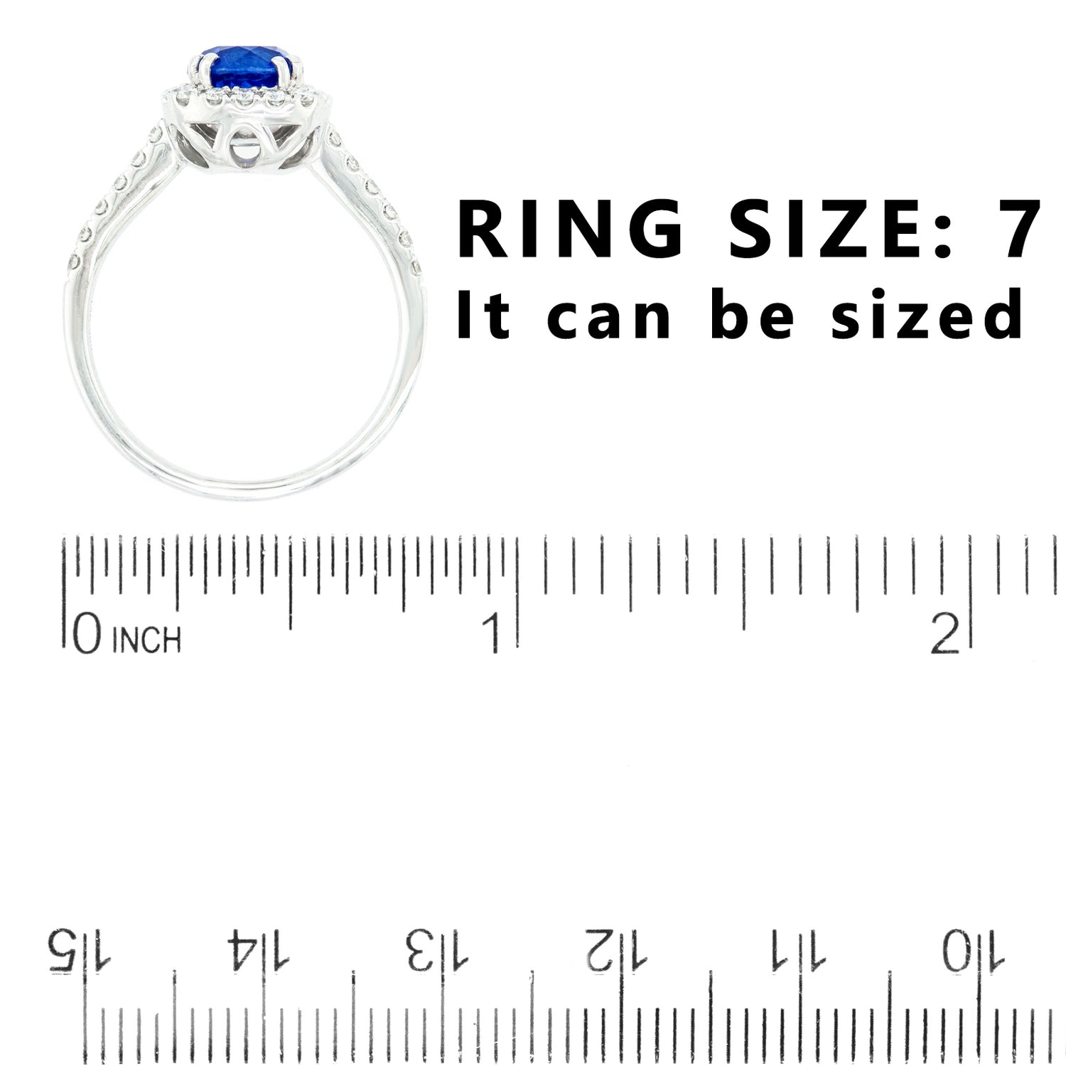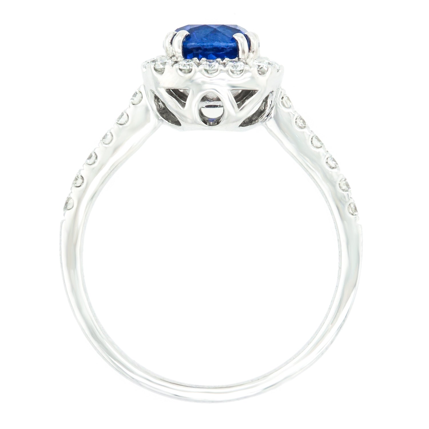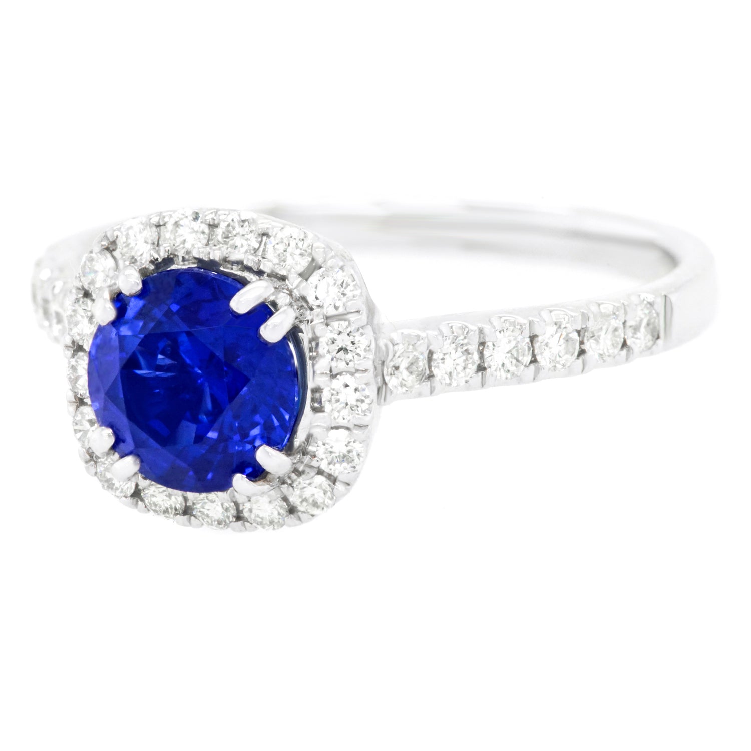 Circa 2000s, 14k, American. Surrounded by .50 carats of fine white diamonds, the star of this show is the rich cornflower blue 1.50-carat sapphire. Elegant and timeless, this ring is perfectly classic and brilliantly beautiful. Finely fashioned, it is in excellent condition. a period of 7 days.