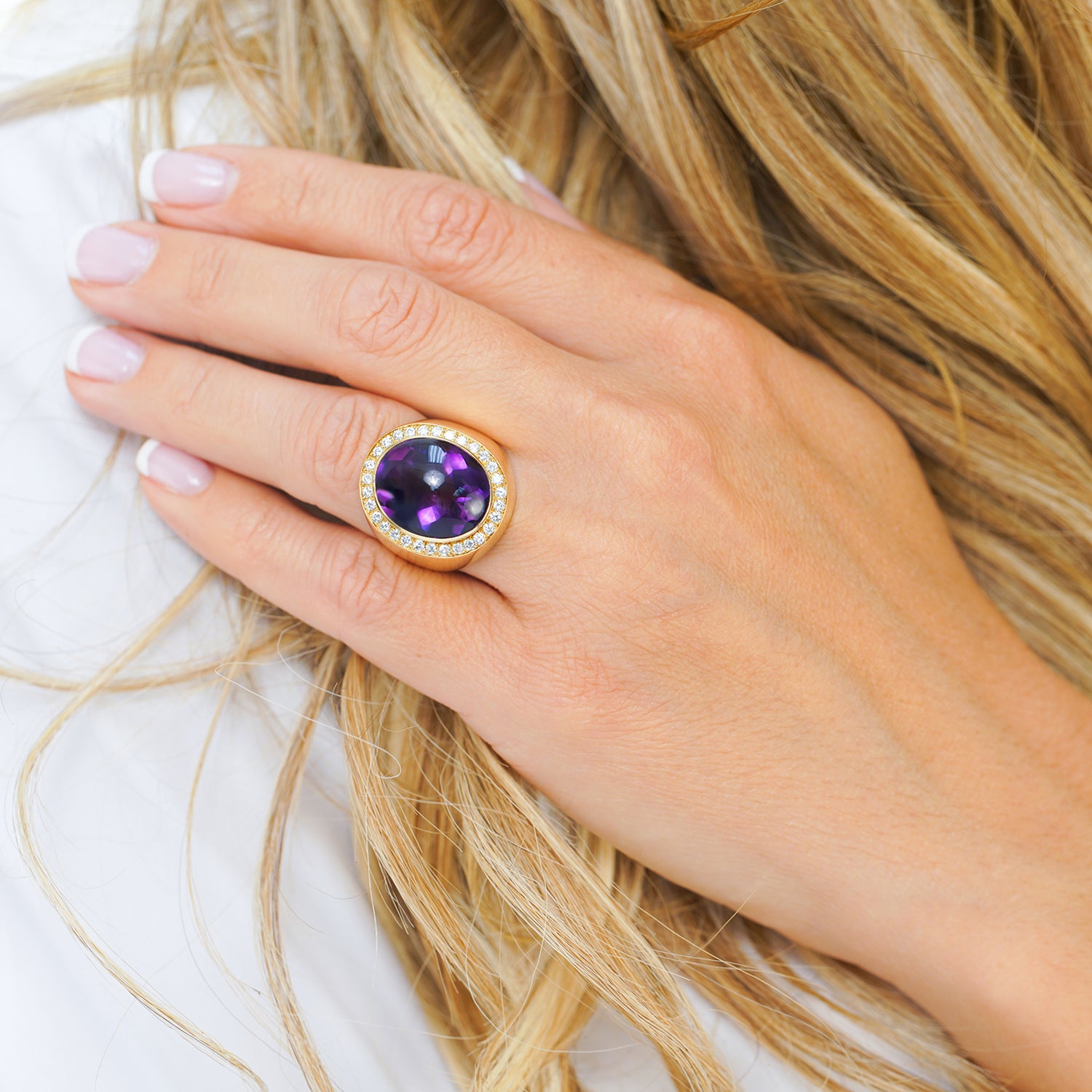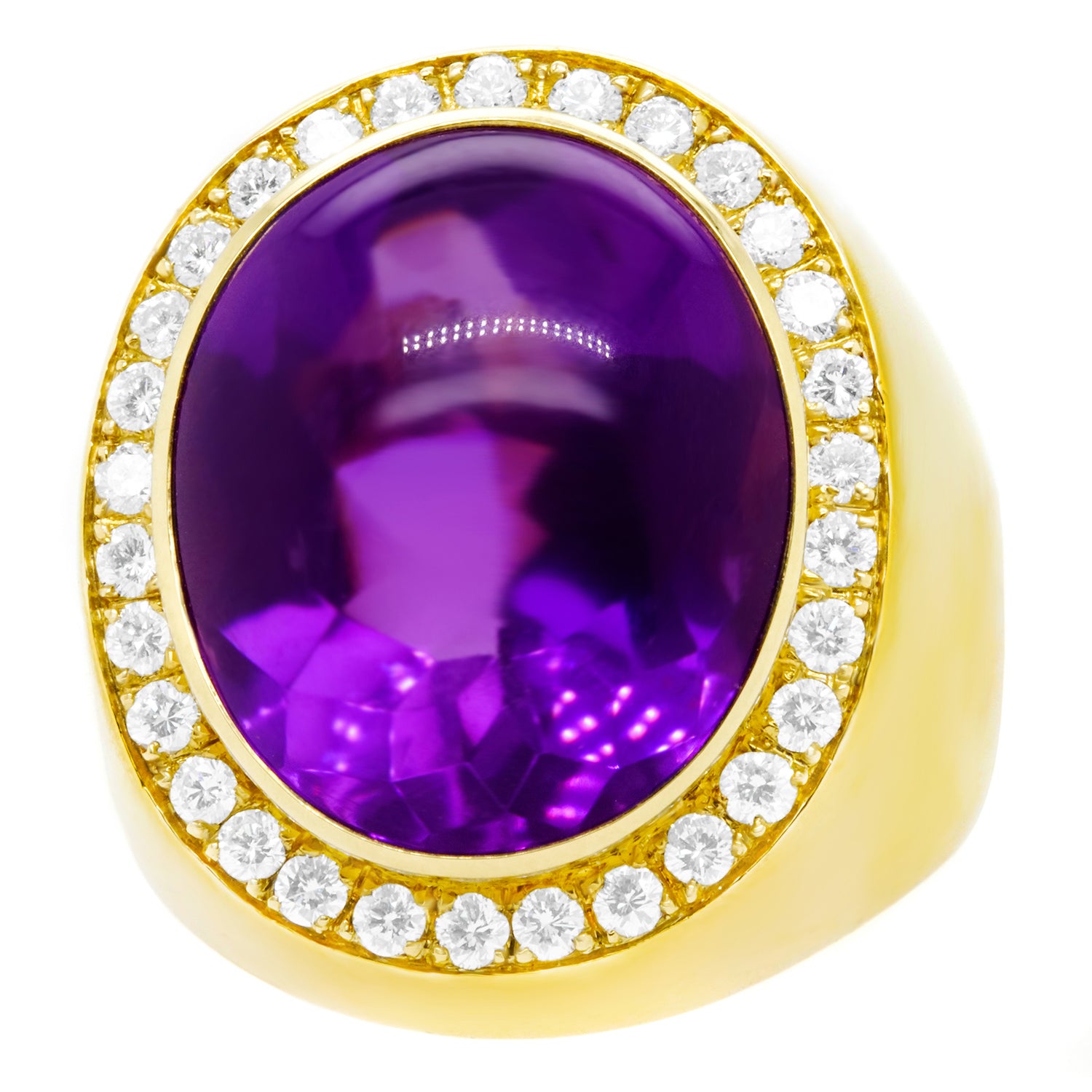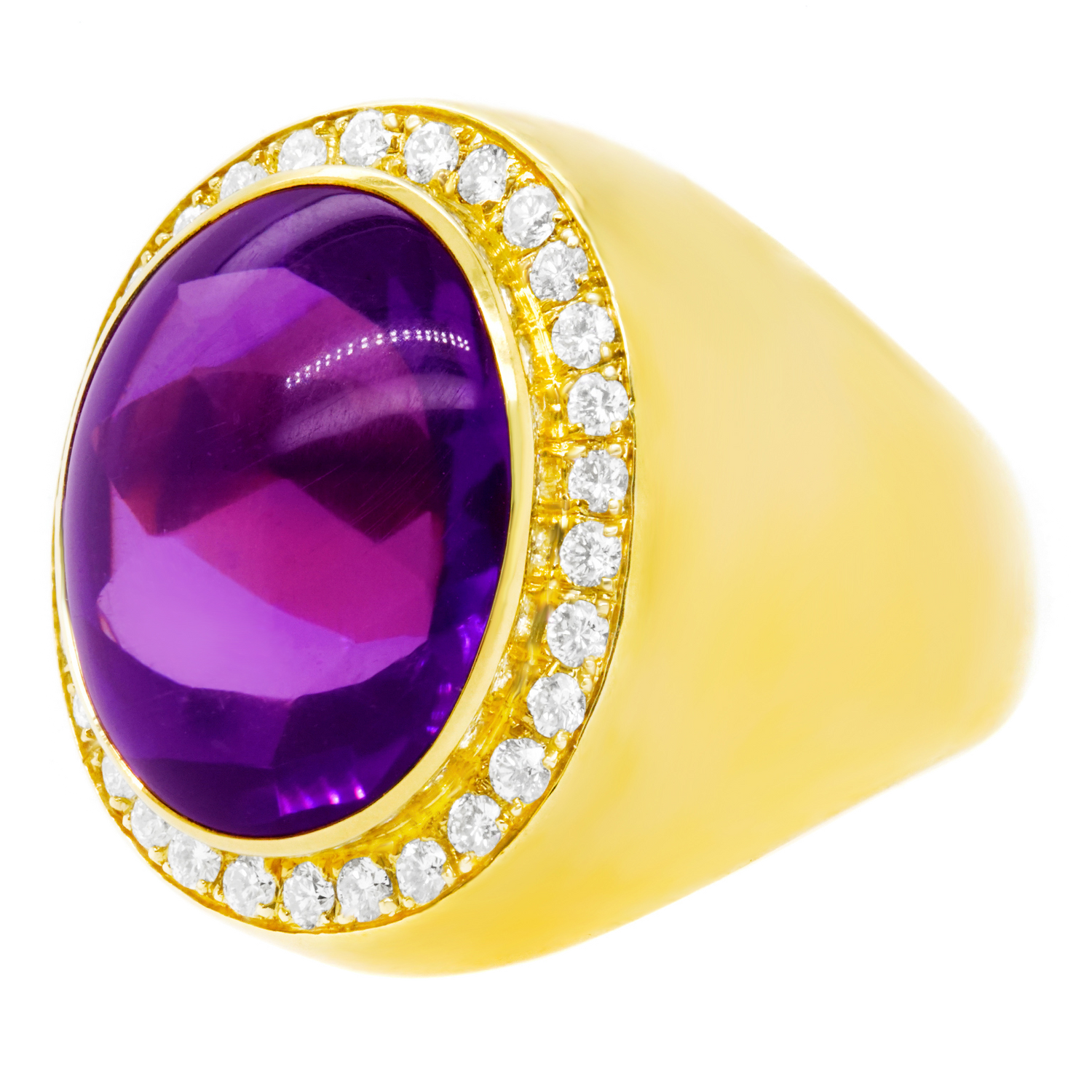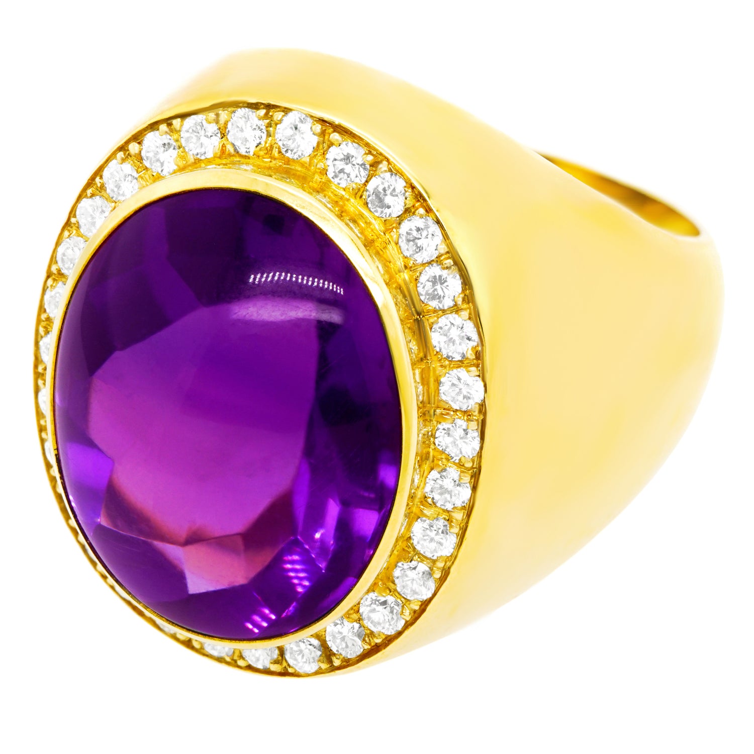 Circa 1980s, 18k, Switzerland. Purple passion for fashion, this sleek Swiss eighties ring is a smart, bold piece of jewelry. I imagine this ring would be as at home on the runway as at a gallery opening! Set with an 18.0-carat vivid amethyst cabochon and .60 carats total weight of brilliant white diamonds (G VS), it is superbly made and in excellent condition.