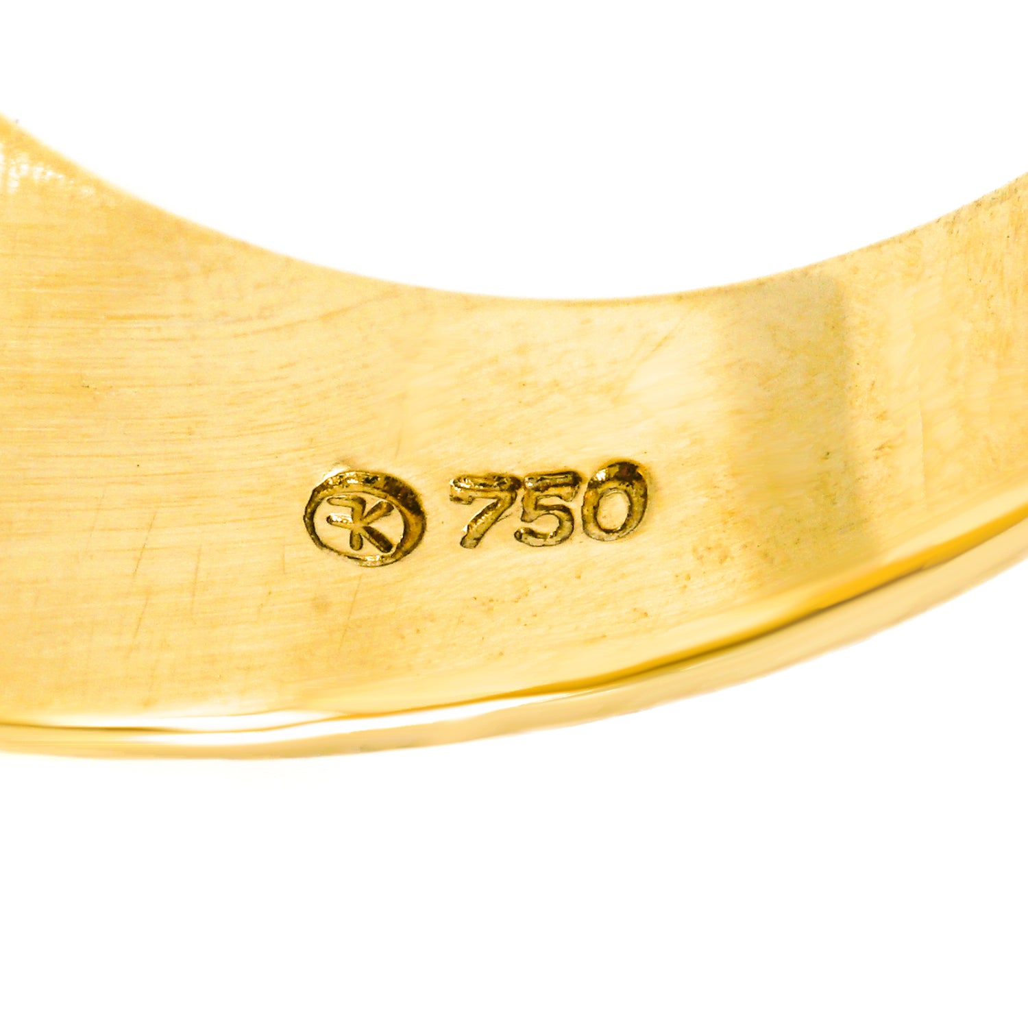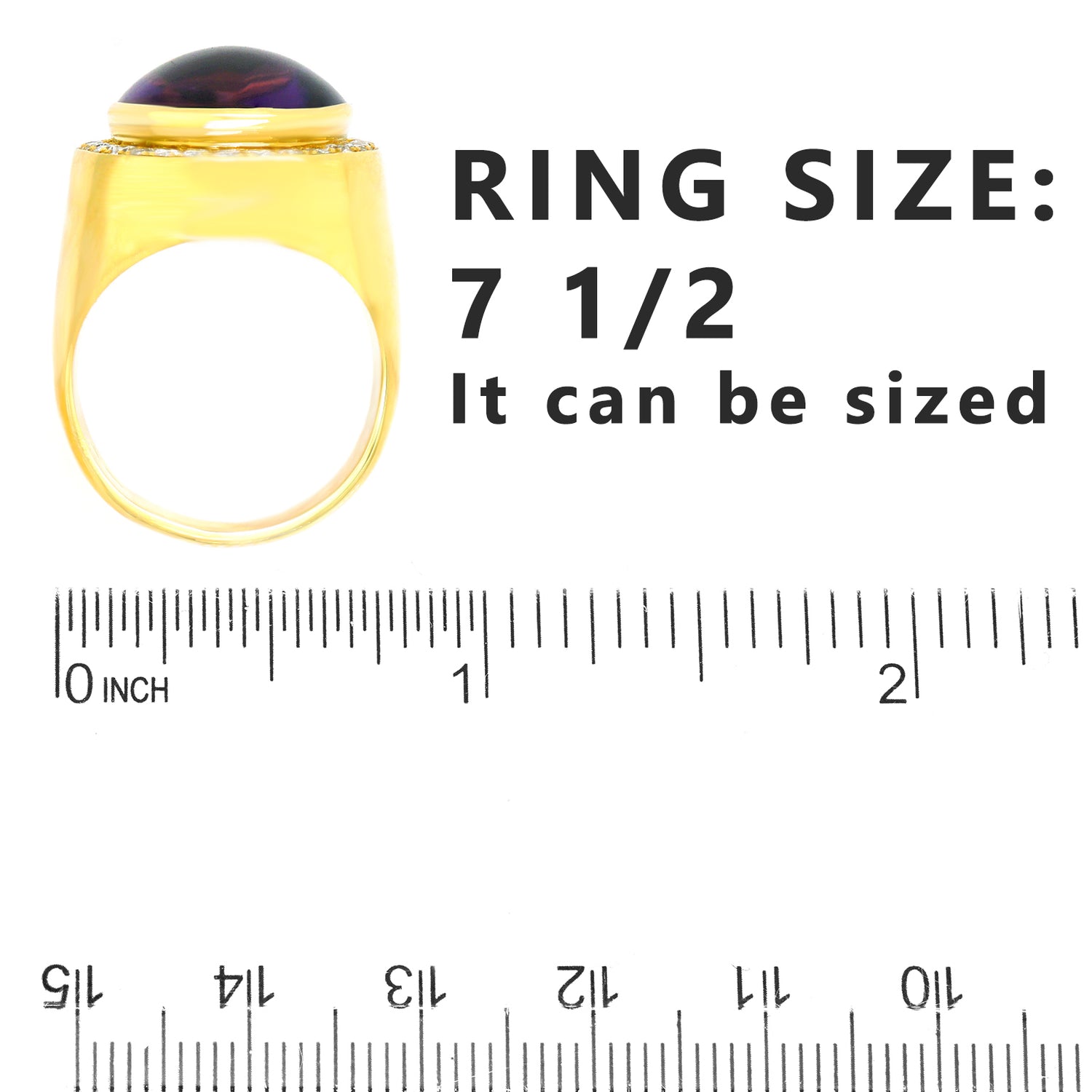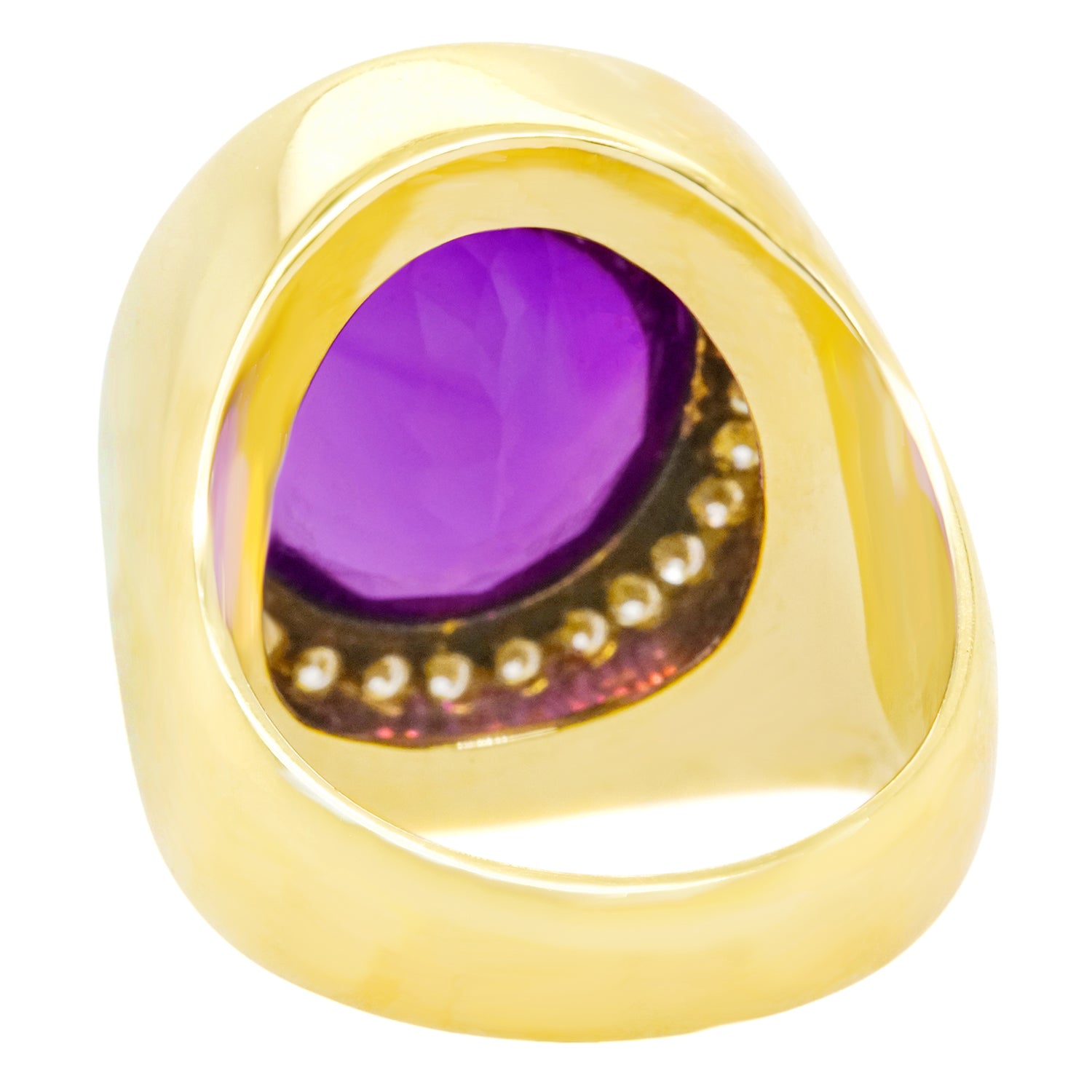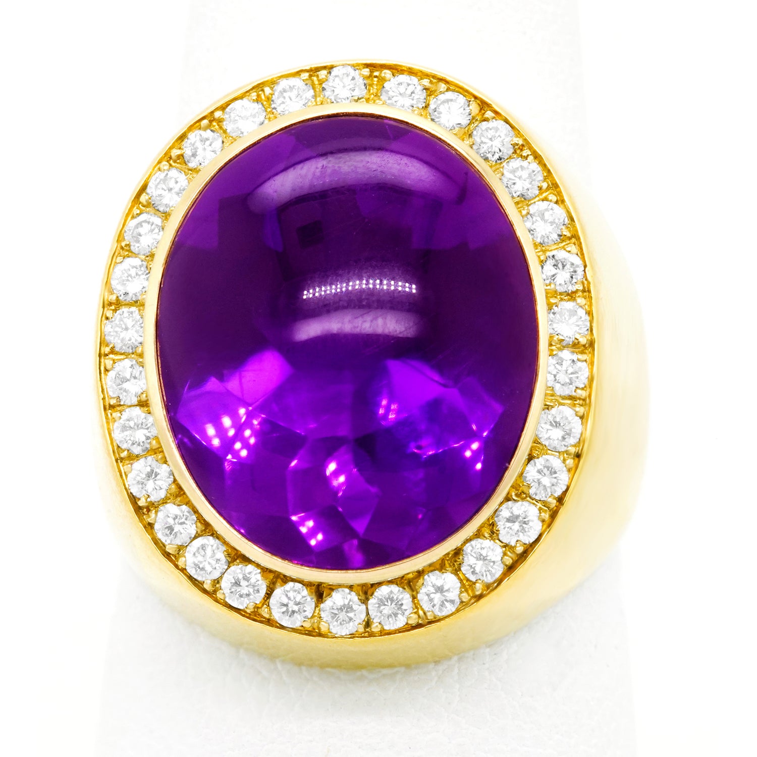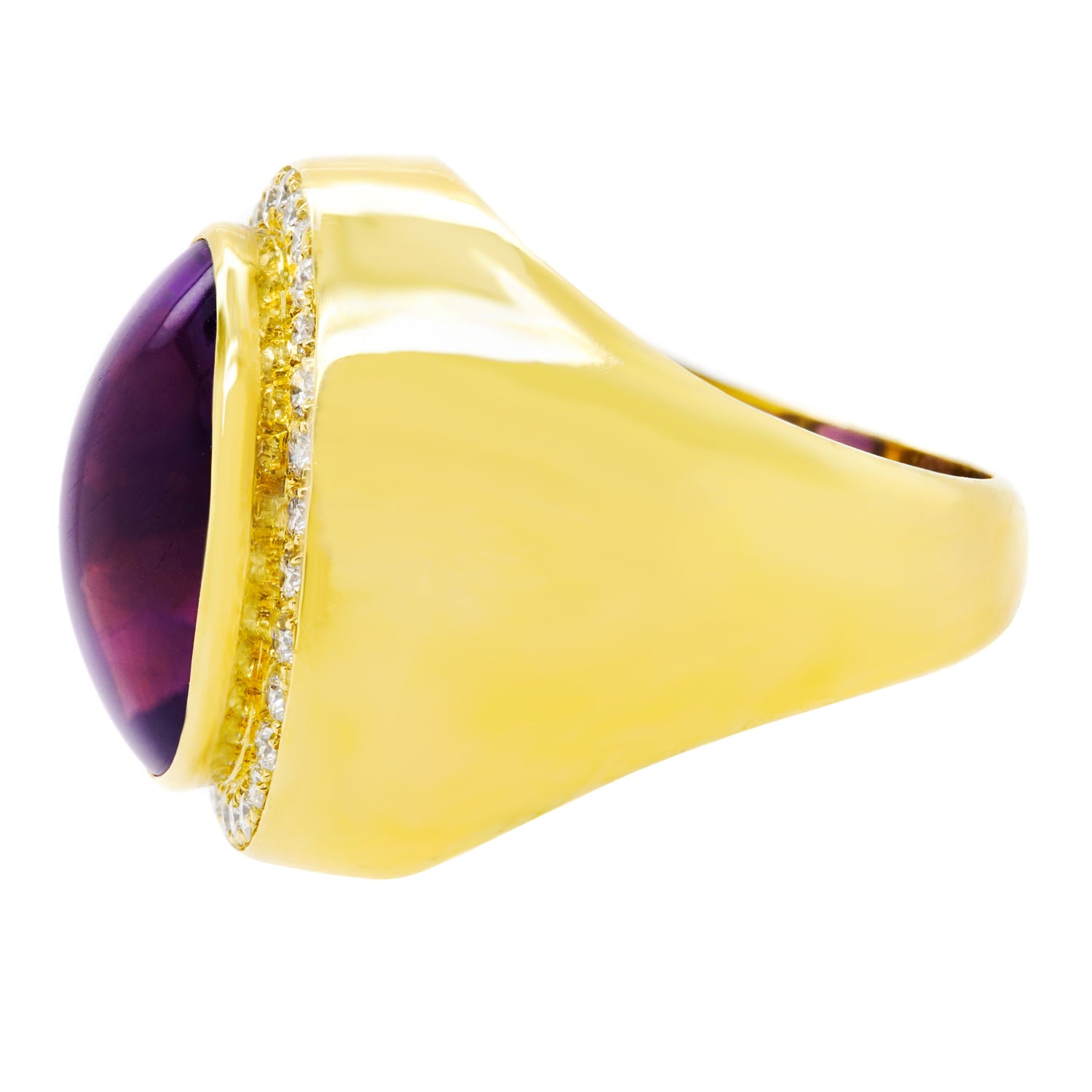 Circa 1980s, 18k, Switzerland. Purple passion for fashion, this sleek Swiss eighties ring is a smart, bold piece of jewelry. I imagine this ring would be as at home on the runway as at a gallery opening! Set with an 18.0-carat vivid amethyst cabochon and .60 carats total weight of brilliant white diamonds (G VS), it is superbly made and in excellent condition.