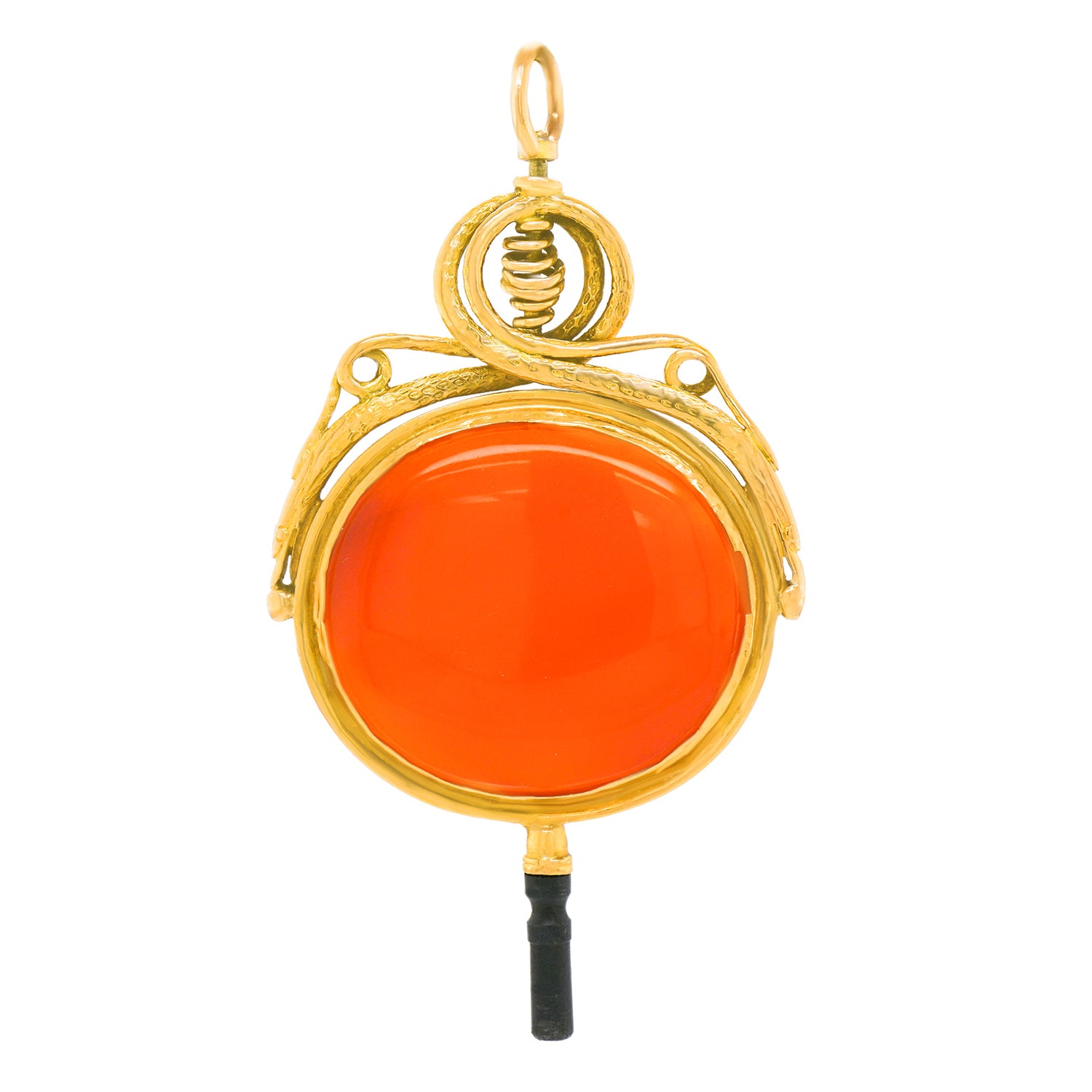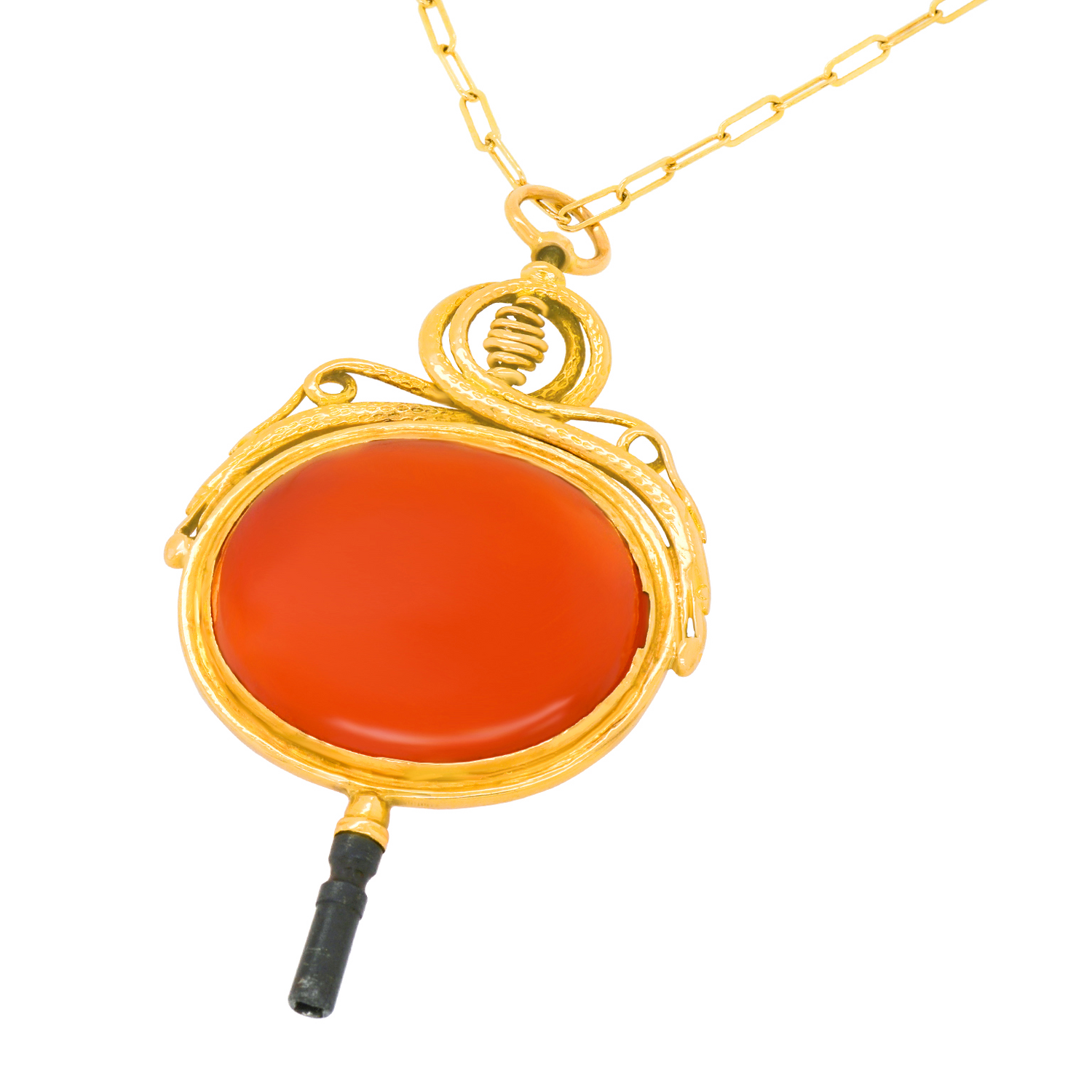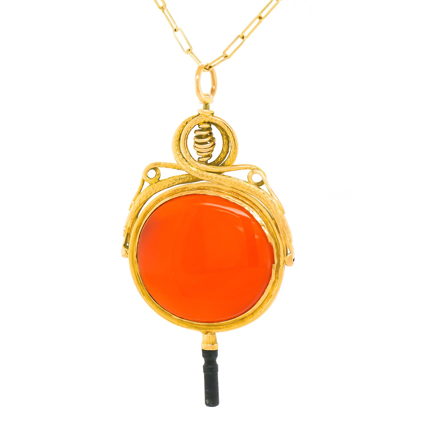 Circa 1870s, 18k, French. This rare oversized very fancy watch key makes an inspired pendant! Set with a lush cabochon carnelian, the look is vintage chic at its cool-found-objects-as-jewelry best. Excellent condition.