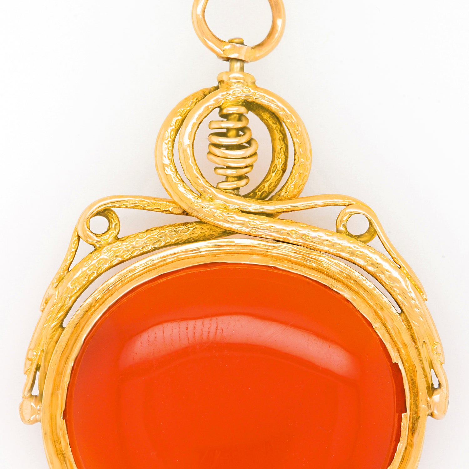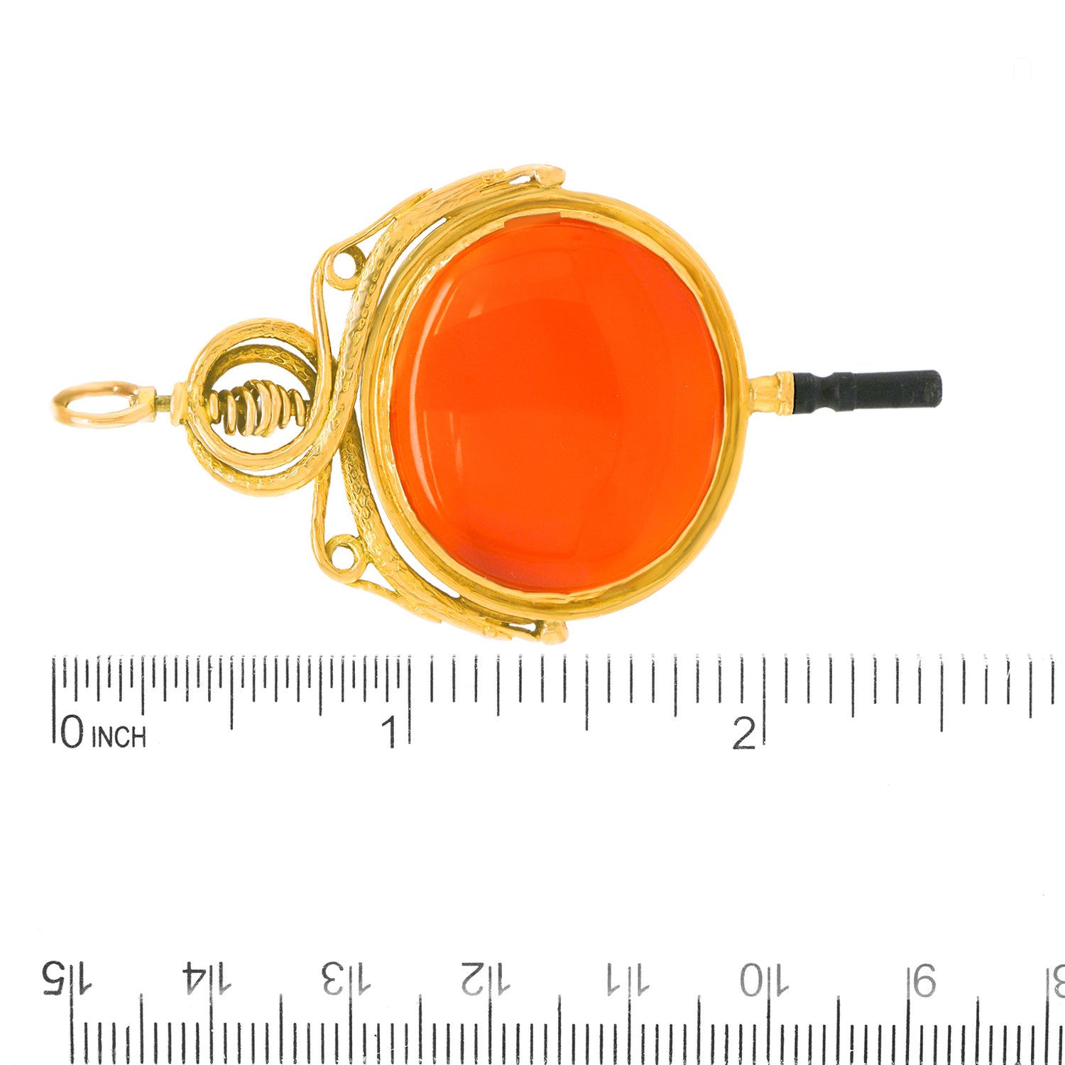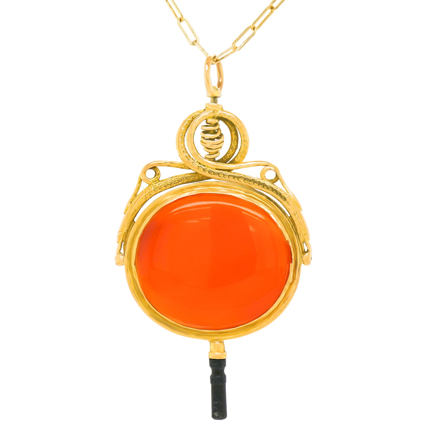 Circa 1870s, 18k, French. This rare oversized very fancy watch key makes an inspired pendant! Set with a lush cabochon carnelian, the look is vintage chic at its cool-found-objects-as-jewelry best. Excellent condition.