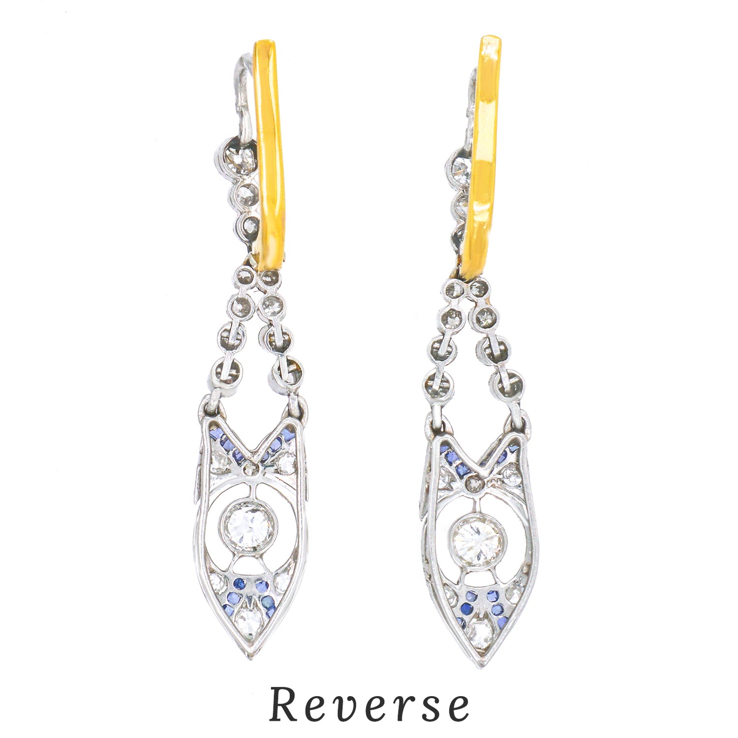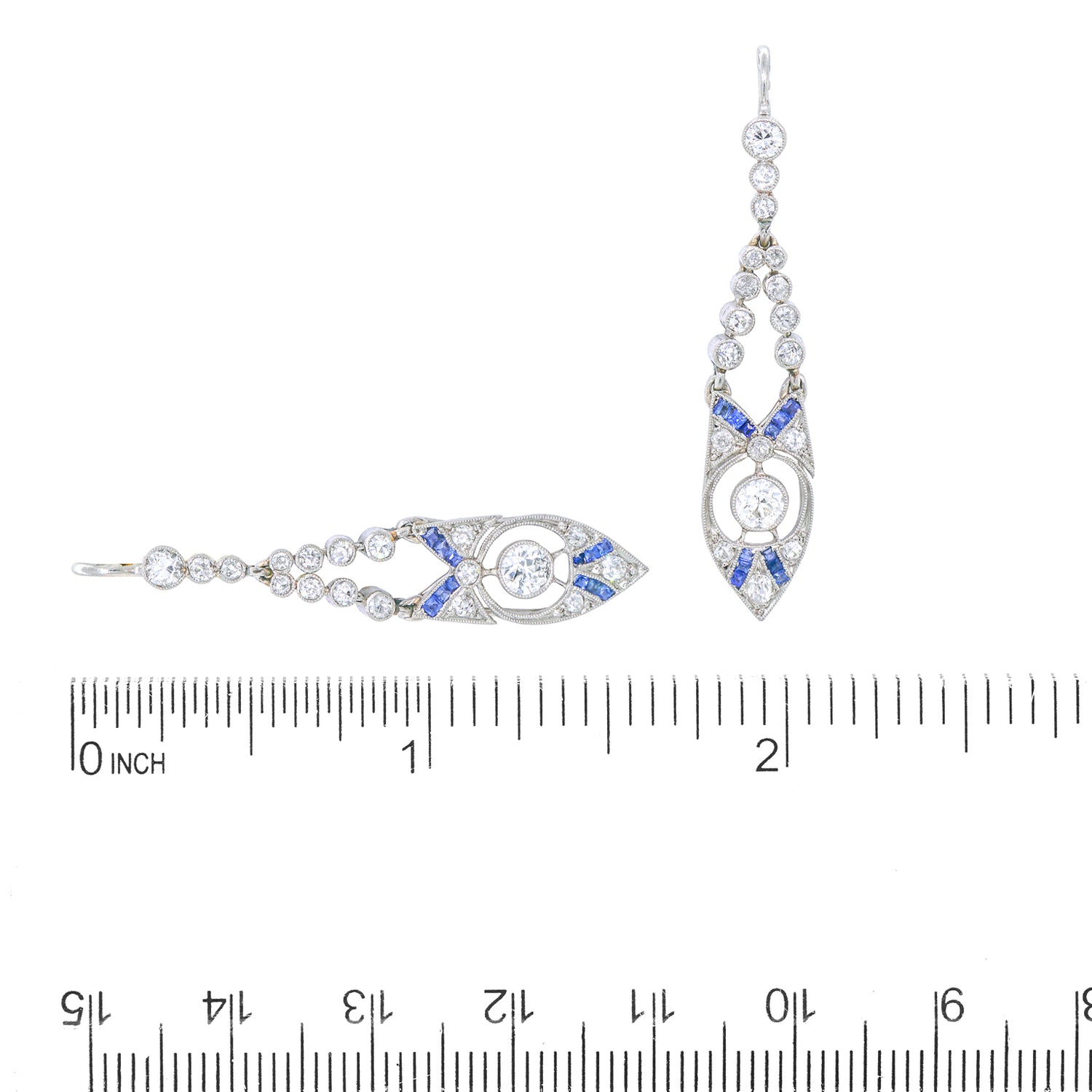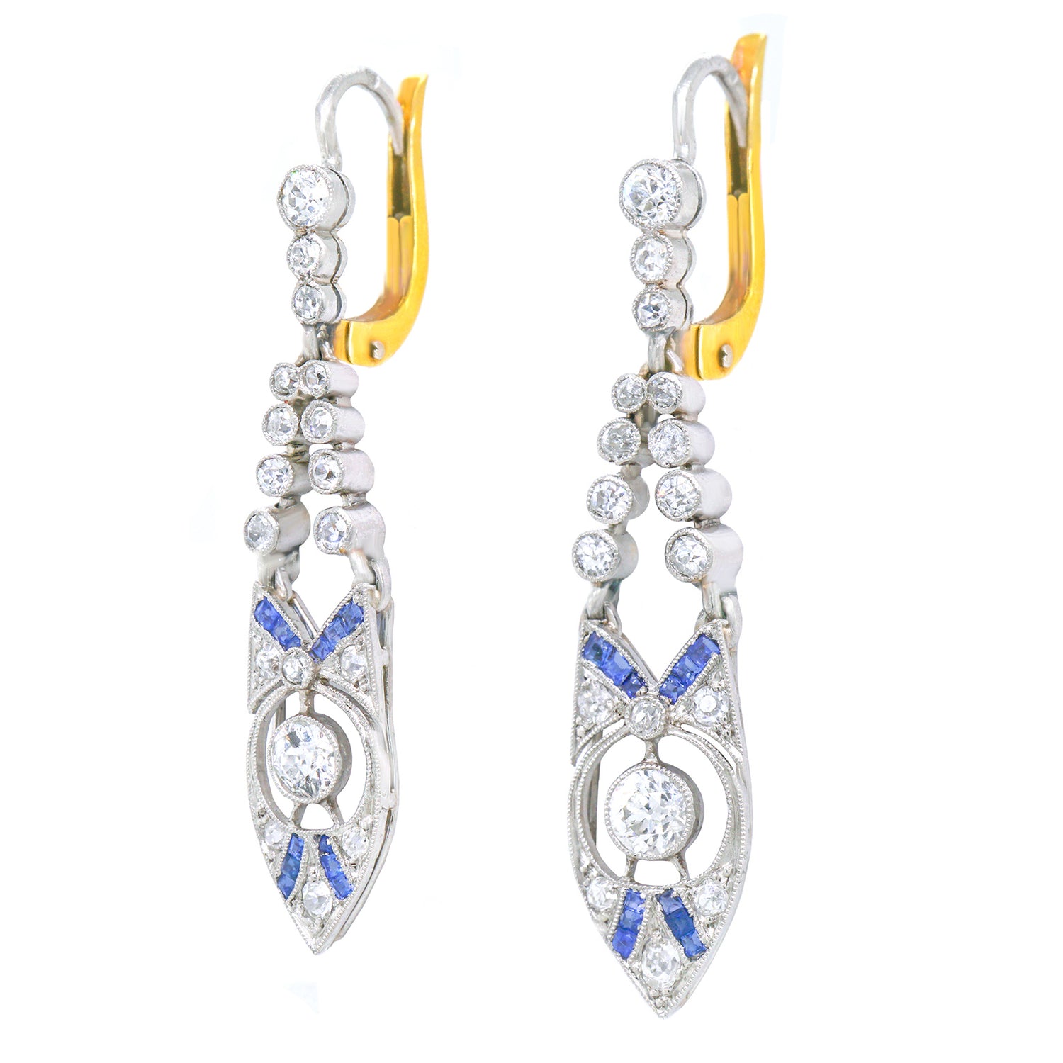 Circa 1920s, Platinum & 18k, France. These elegant Art Deco earrings feature brilliant white diamonds and lush blue sapphires. Day or night, they are versatile, timeless, and captivating. Striking French style, underscored by hand-fabrication, make them superb examples of the period. Excellent condition.
