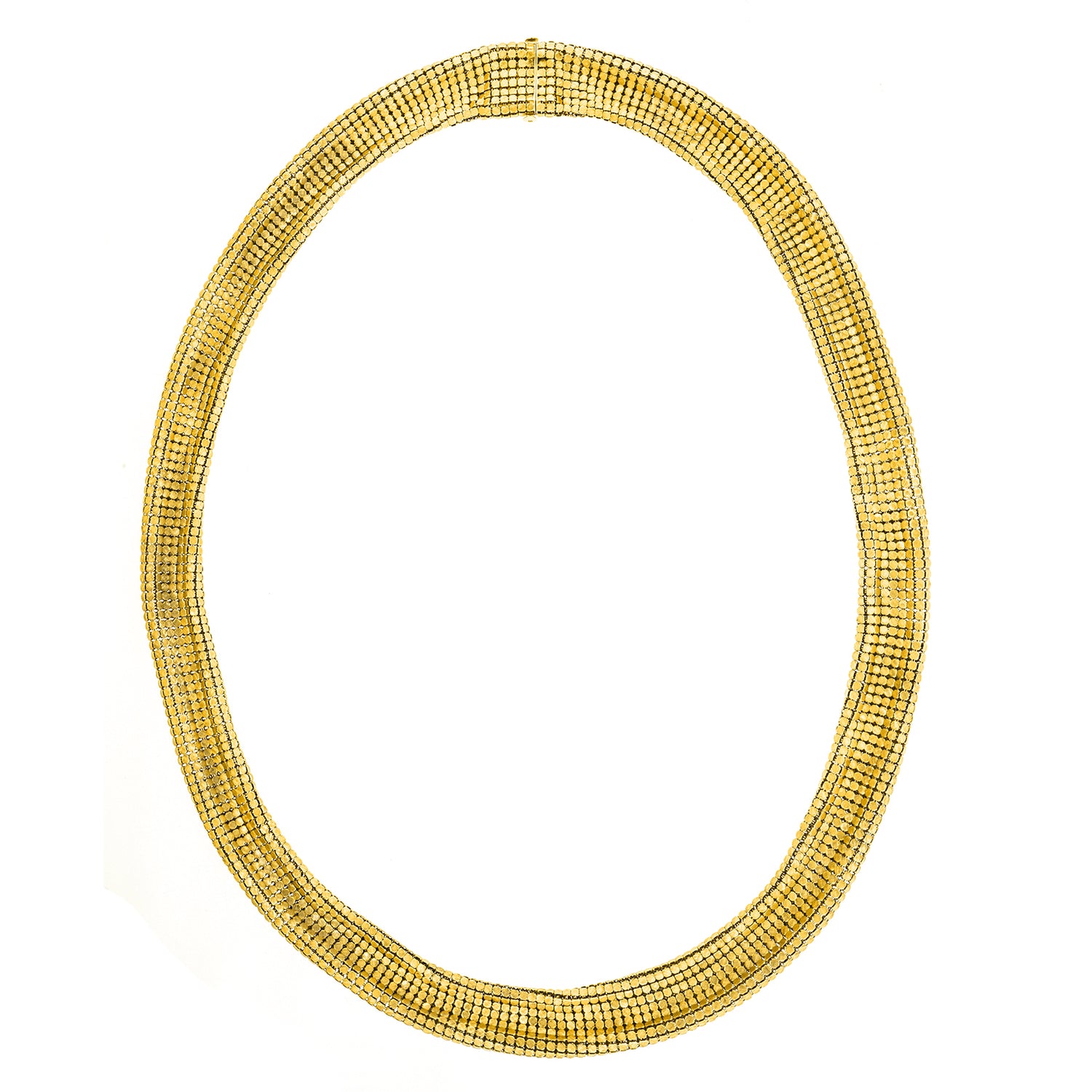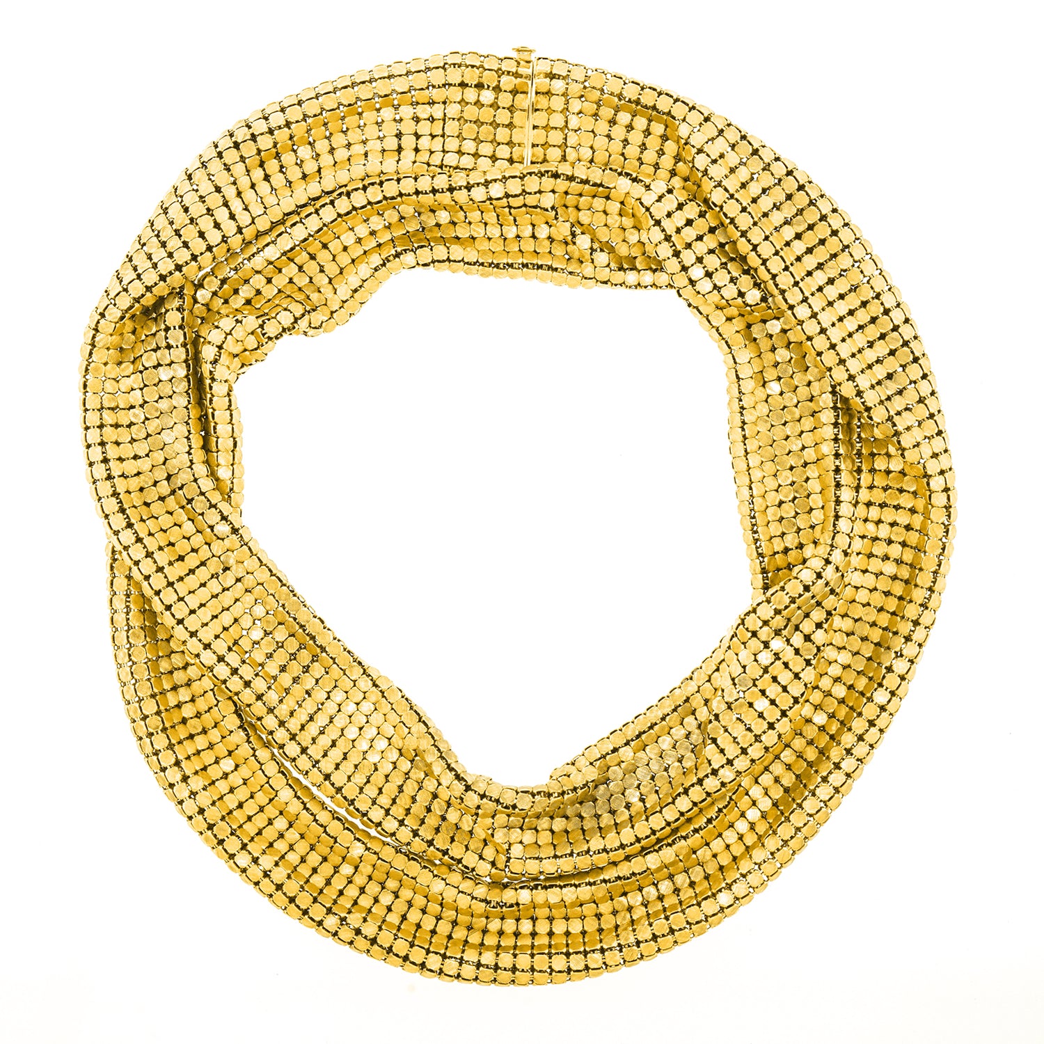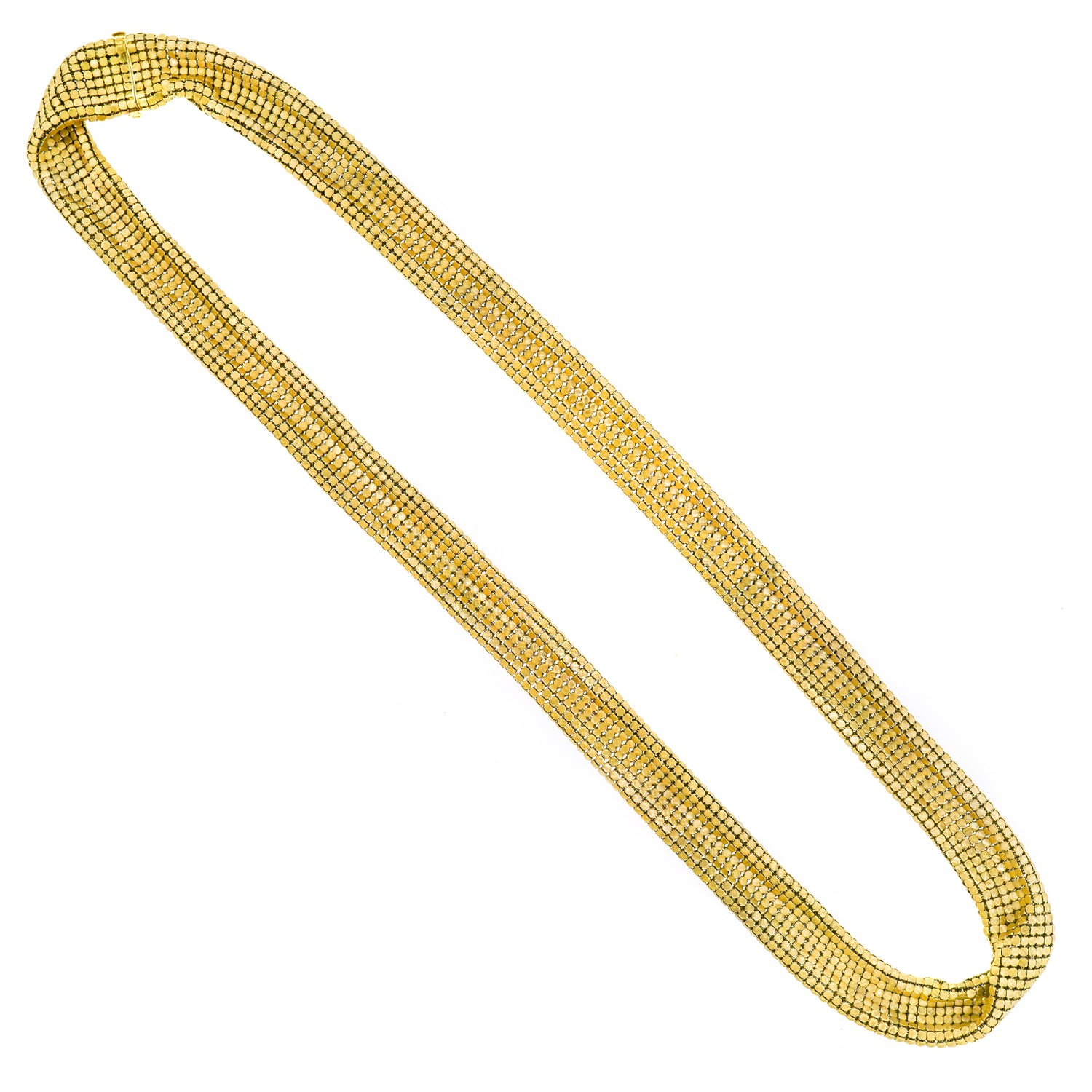Circa 1970s, 18k, by Wilm, Hamburg, Germany.  Weaving together hand-textured and polished elements, this striking 18k yellow gold necklace has a sophisticated visual narrative. Since the 1700s, Wilm has created impeccably styled jewelry. This spectacular 35 1/2 inch necklace, with its brilliant textile motif, easily goes from the sidewalk to the catwalk. Constructed of meticulously hand-fabricated and engraved pieces to form a gold mesh, it can be worn around the neck doubled or long, and additionally slung on the hips as a decorative belt. The flexible nature of the components makes it very comfortable on and easy to wear. Excellent condition.
